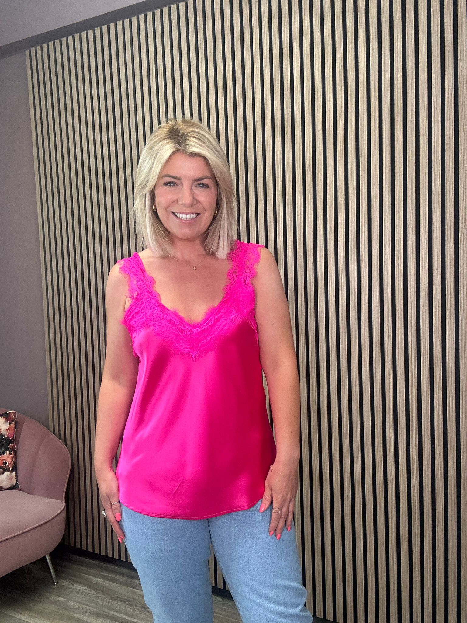 Add a dash of flirtiness to your outfit with the Emer Lace Cami. With delicate lace detailing on the v-neck and shoulder straps, this cami is perfect for a fun night out. The satin-like fabric is soft to the touch and the hot pink colour adds a pop of vibrant charm. Let your personality shine through with this playful top!