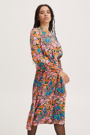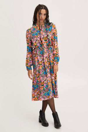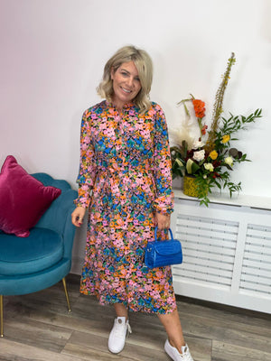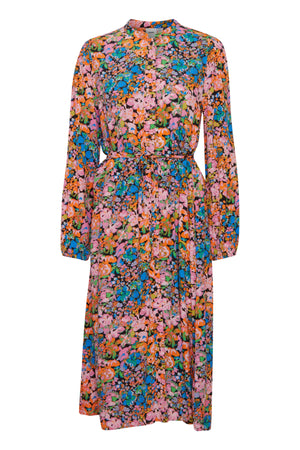 We are weak for the print of this Shirt Dress by Ichi. Featuring a long sleeve, full button up front and a tie waist belt, style with our Hanley Faux Leather Jacket and a boot to finish the look.