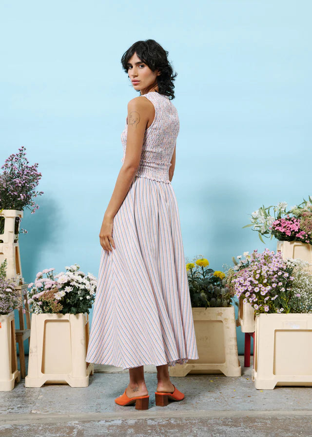 A linen blend sleeveless maxi dress with a shirred top, elasticated waist and pockets and patterned with vertical stripes of lilac, orange, white and black. Perfect summer attire.