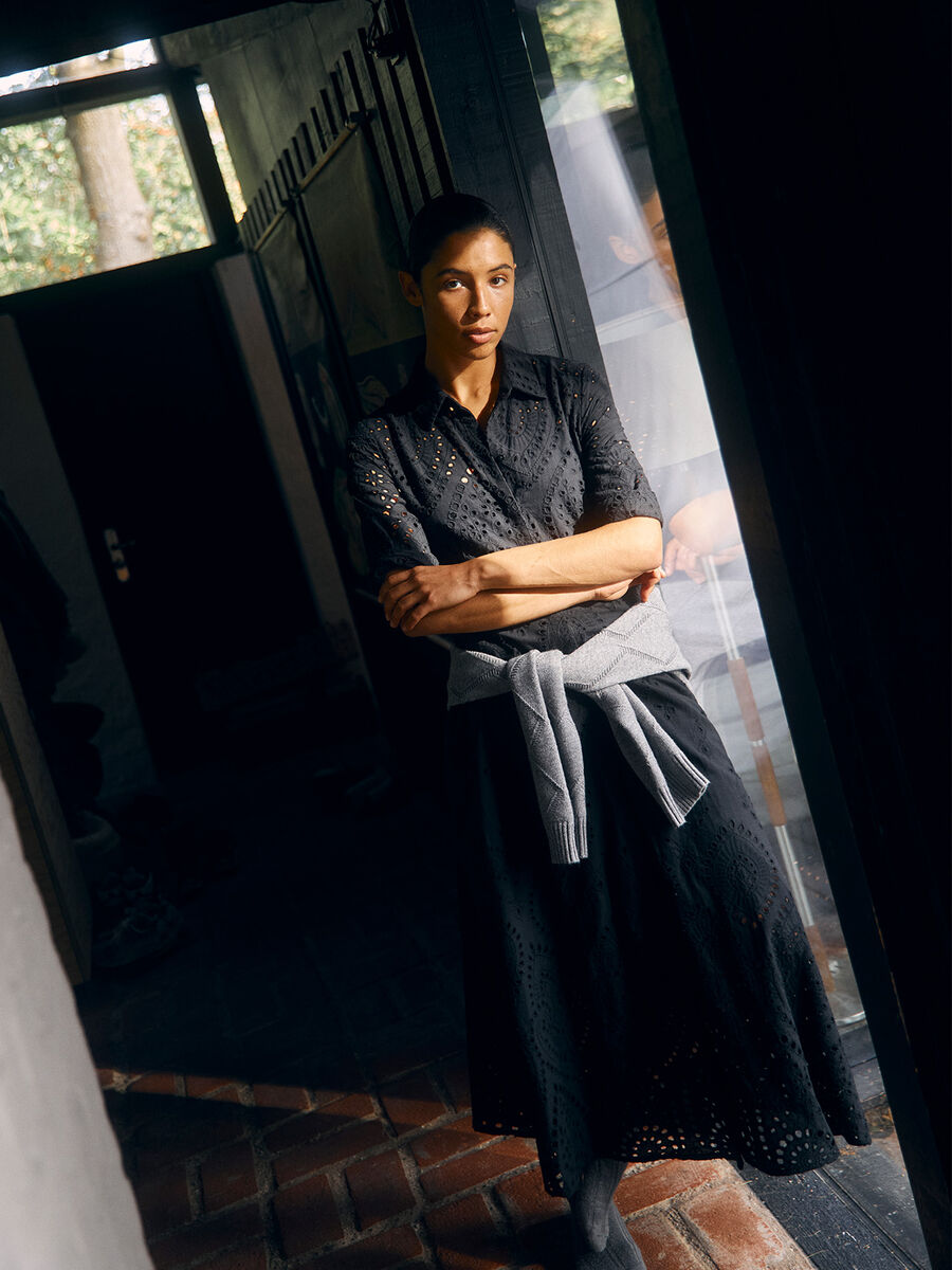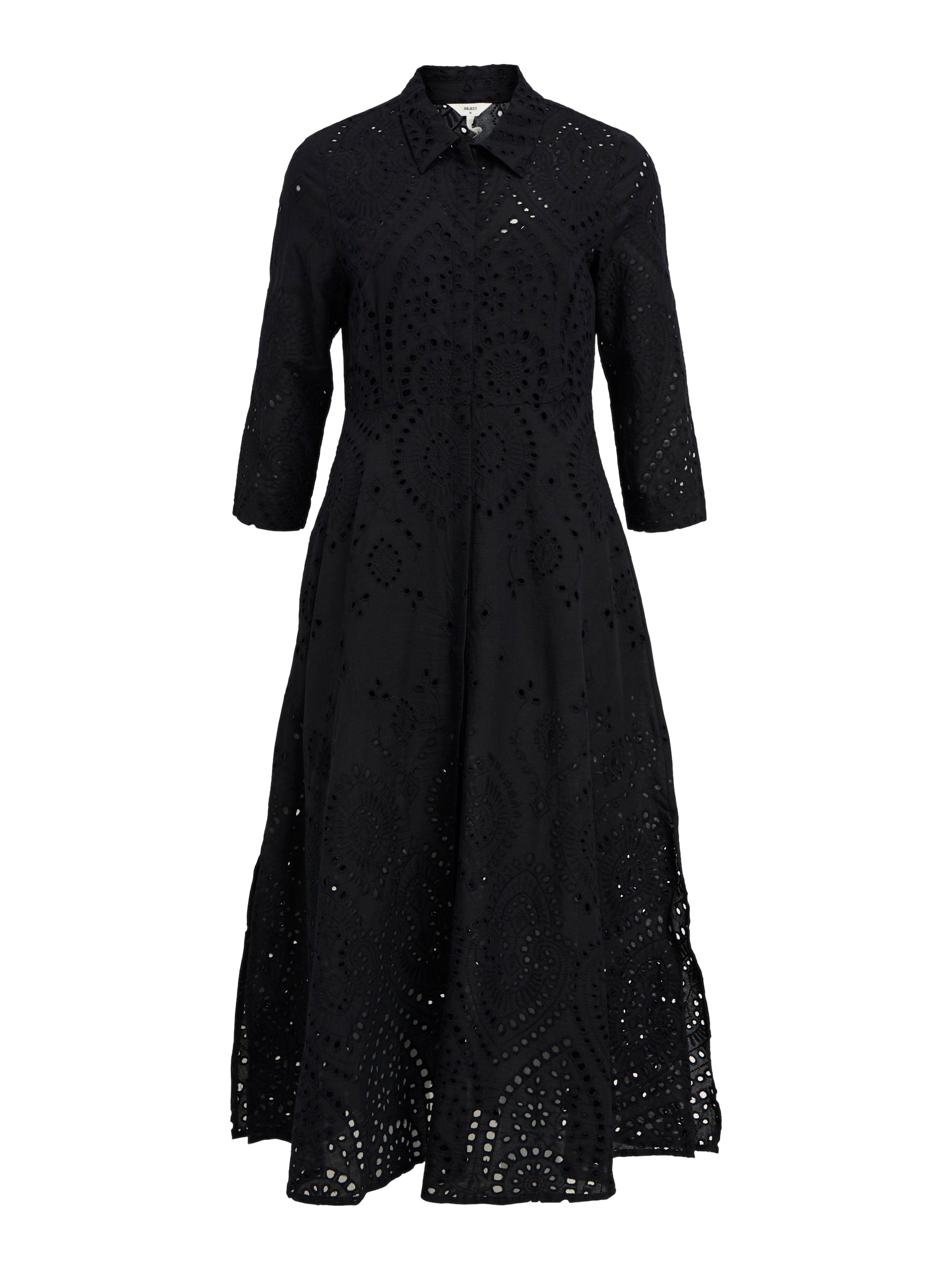 The elegant ALLI Button Down Dress is designed with a classic shirt collar, button down front and interior slip for a graceful silhouette. It's maxi length with a flattering A-line skirt featuring an allover Broderie Anglaise fabric. Elevate your style with this timeless look.