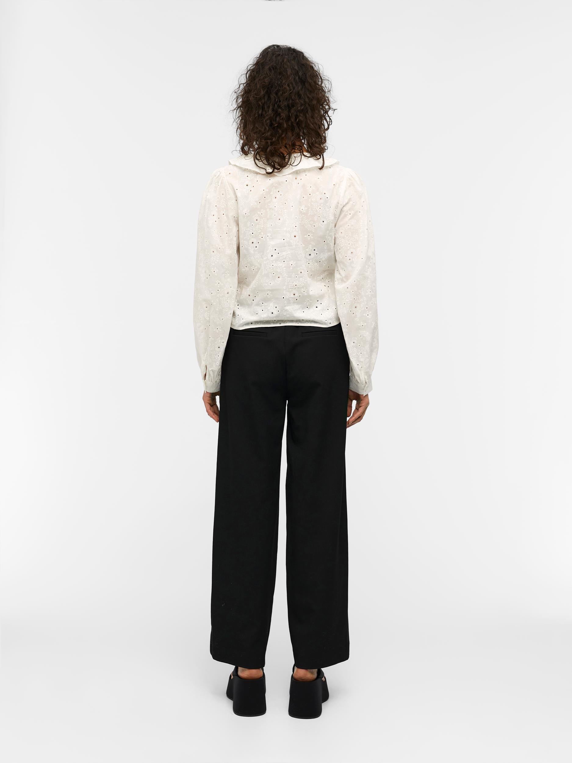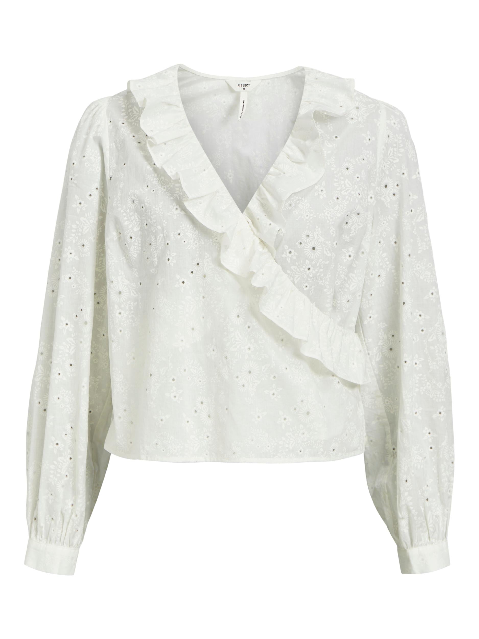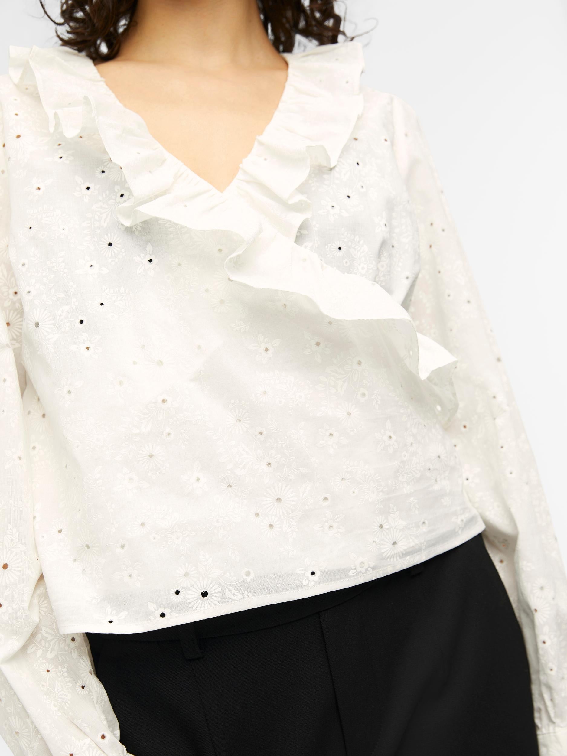 The Andrea V-Neck Top is a stylish and lightweight top with broderie anglaise style round patterned cut-outs giving a delicate, lacy effect. Featuring frill detailing along the wrap it includes a chest fastener and is secured at the waist with two buttons. The long sleeves are finished with button cuffs for a classic look.