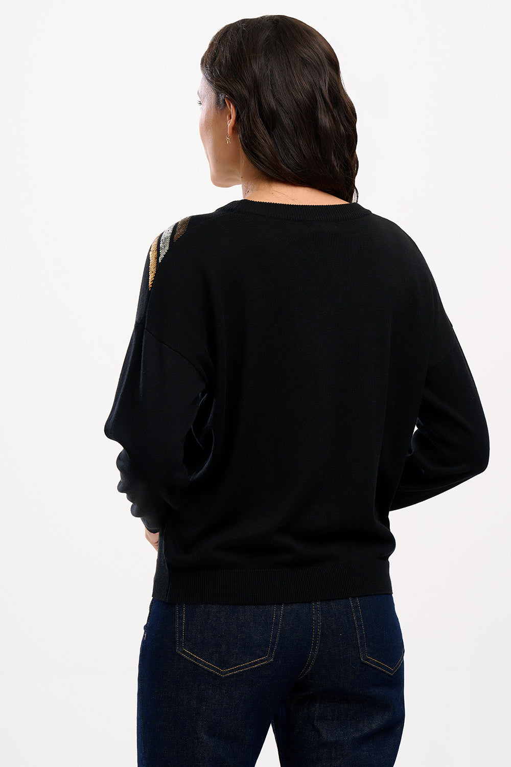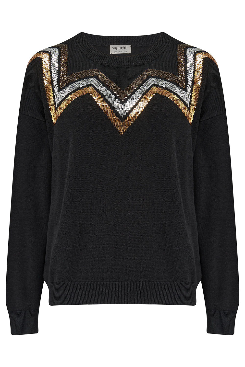Shimmer and shine in the Anjali sequin jumper. It features a round neck and striking silver and gold chevron stripes on a fine knit black base. A must-have for those who love a touch of sparkle. Get ready to dazzle!