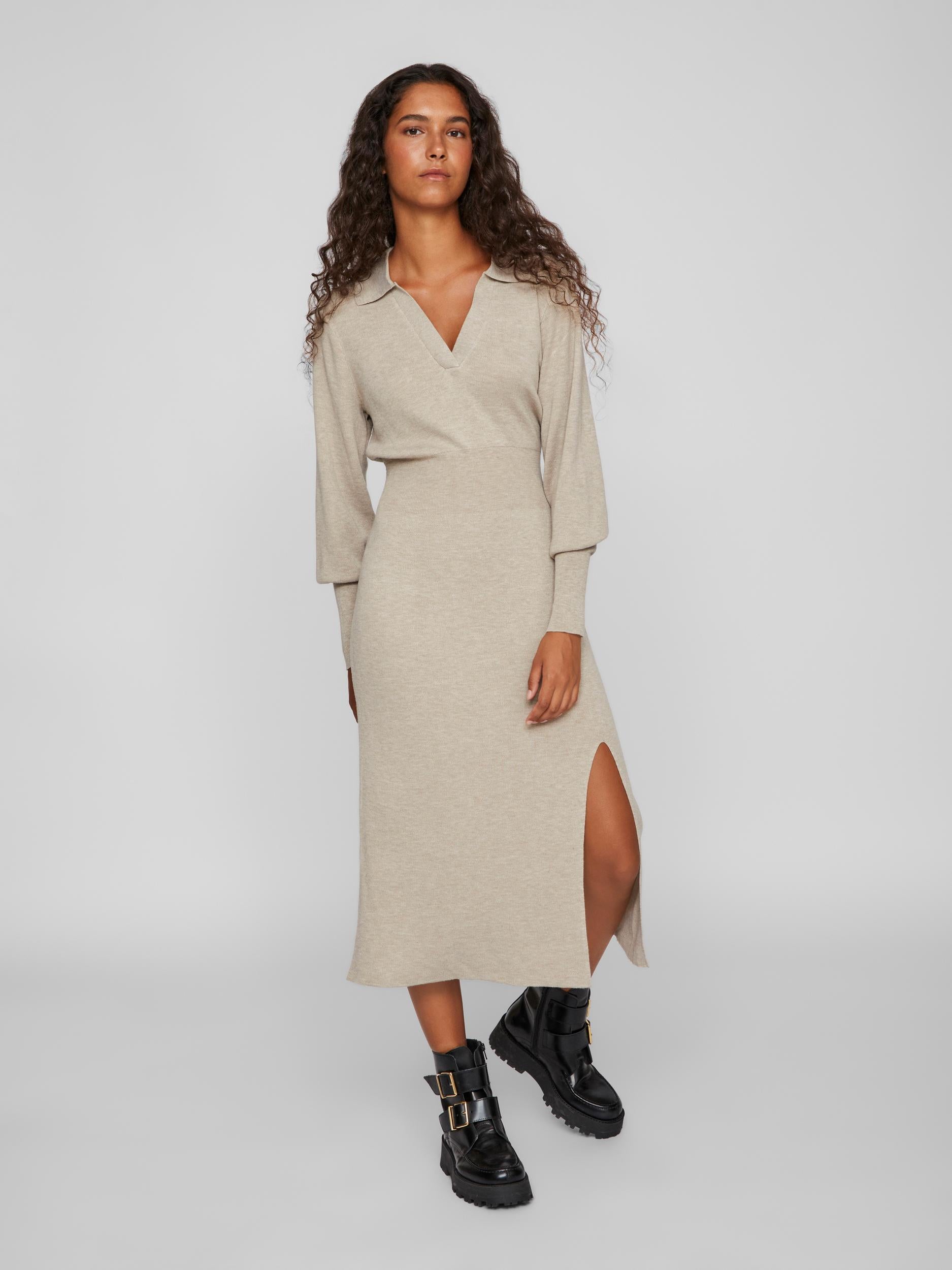 The ARLA COLLAR KNIT Dress is made from a soft touch fabric for a comfortable, cosy fit. The long length design features a V-neck with collar, contrast stitch waistband and sleeve cuffs and a front slit for added movement. Perfect for pairing with boots, runners or heels.