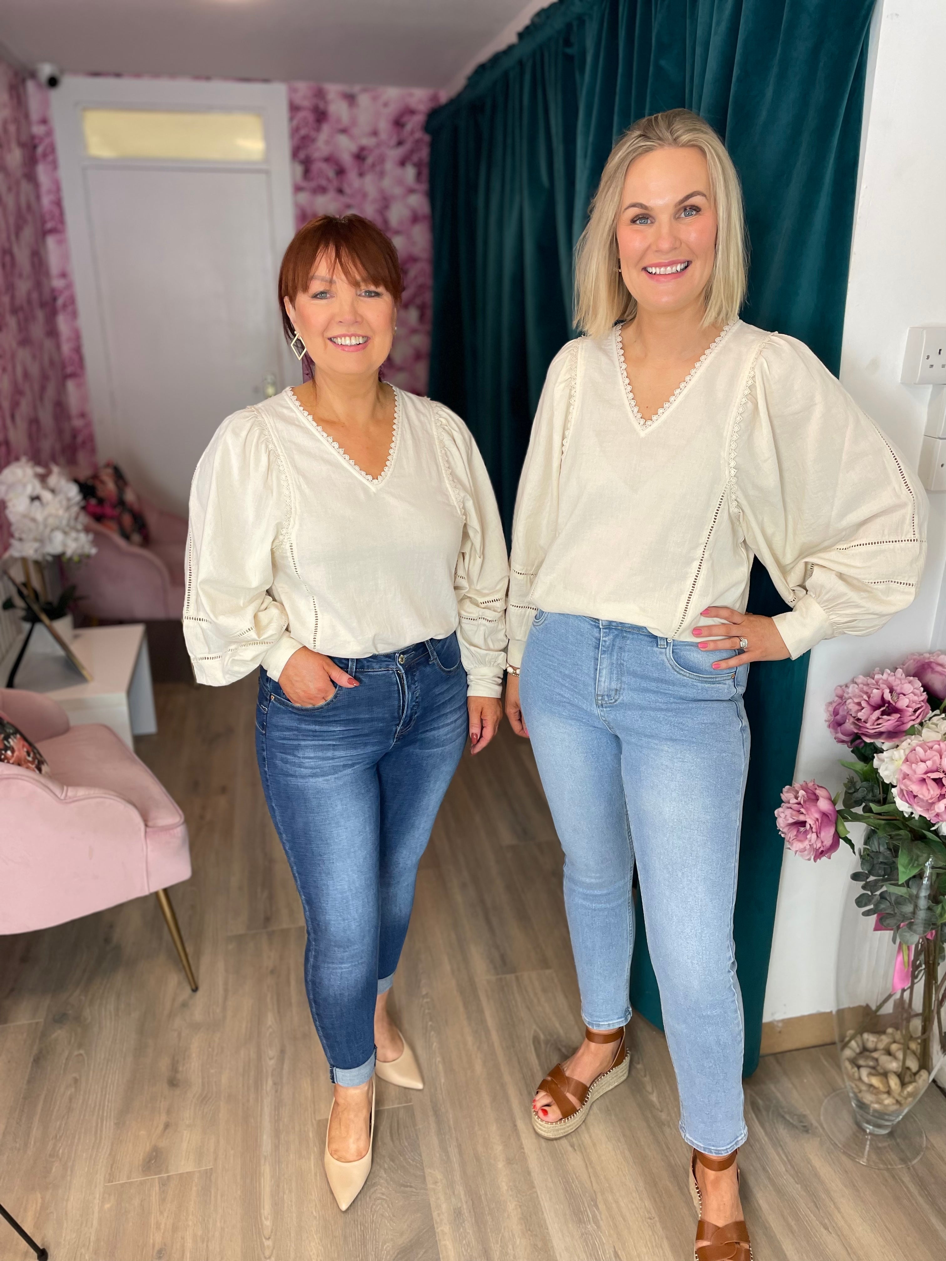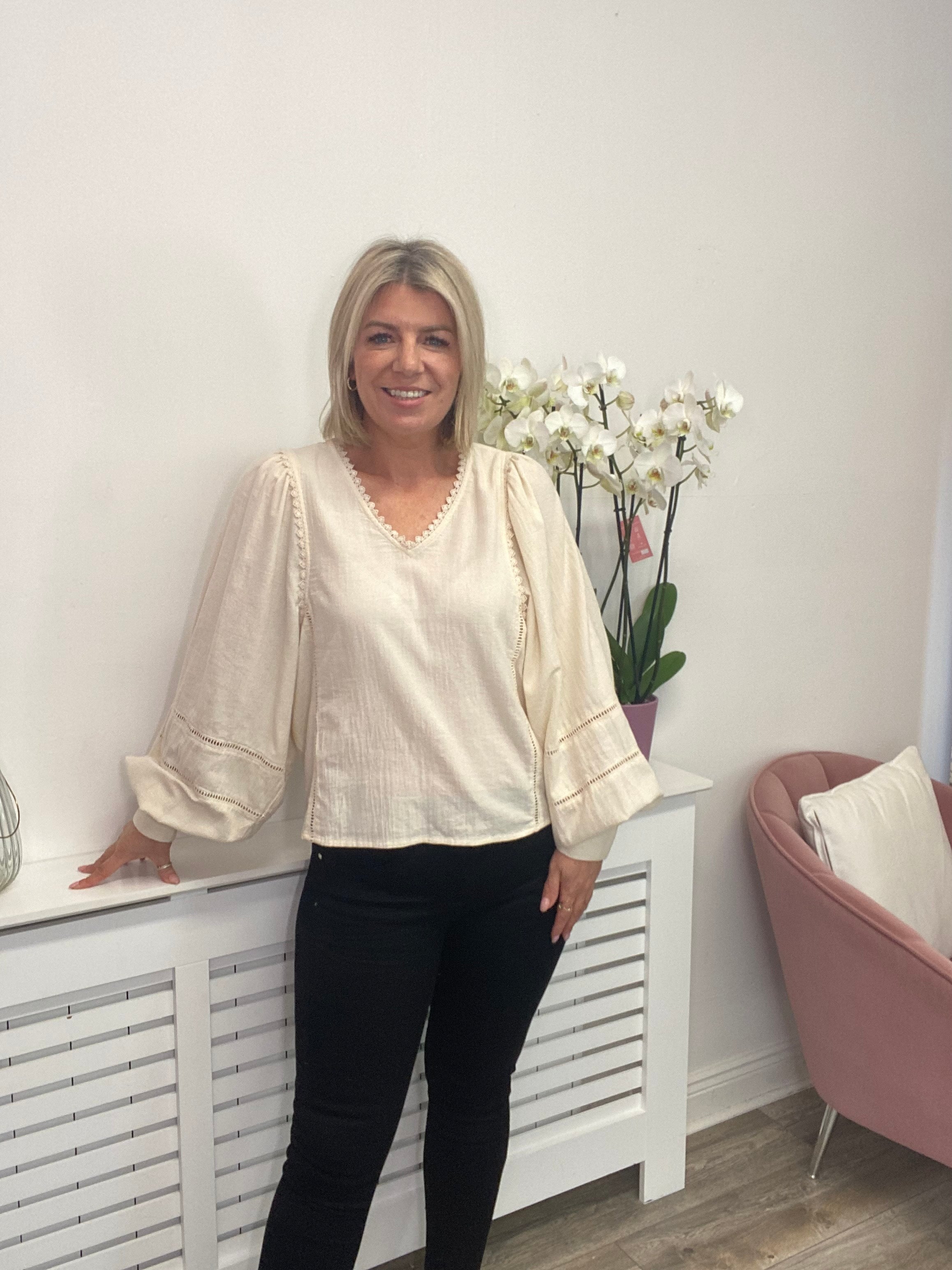Experience the luxe feel of the Belin V-Neck Top crafted from a soft breathable fabric for superior comfort. This top features a V-neck, balloon sleeves and buttoned cuffs for added sophistication. Embroidered and cut out detailing provide an elegant finish.