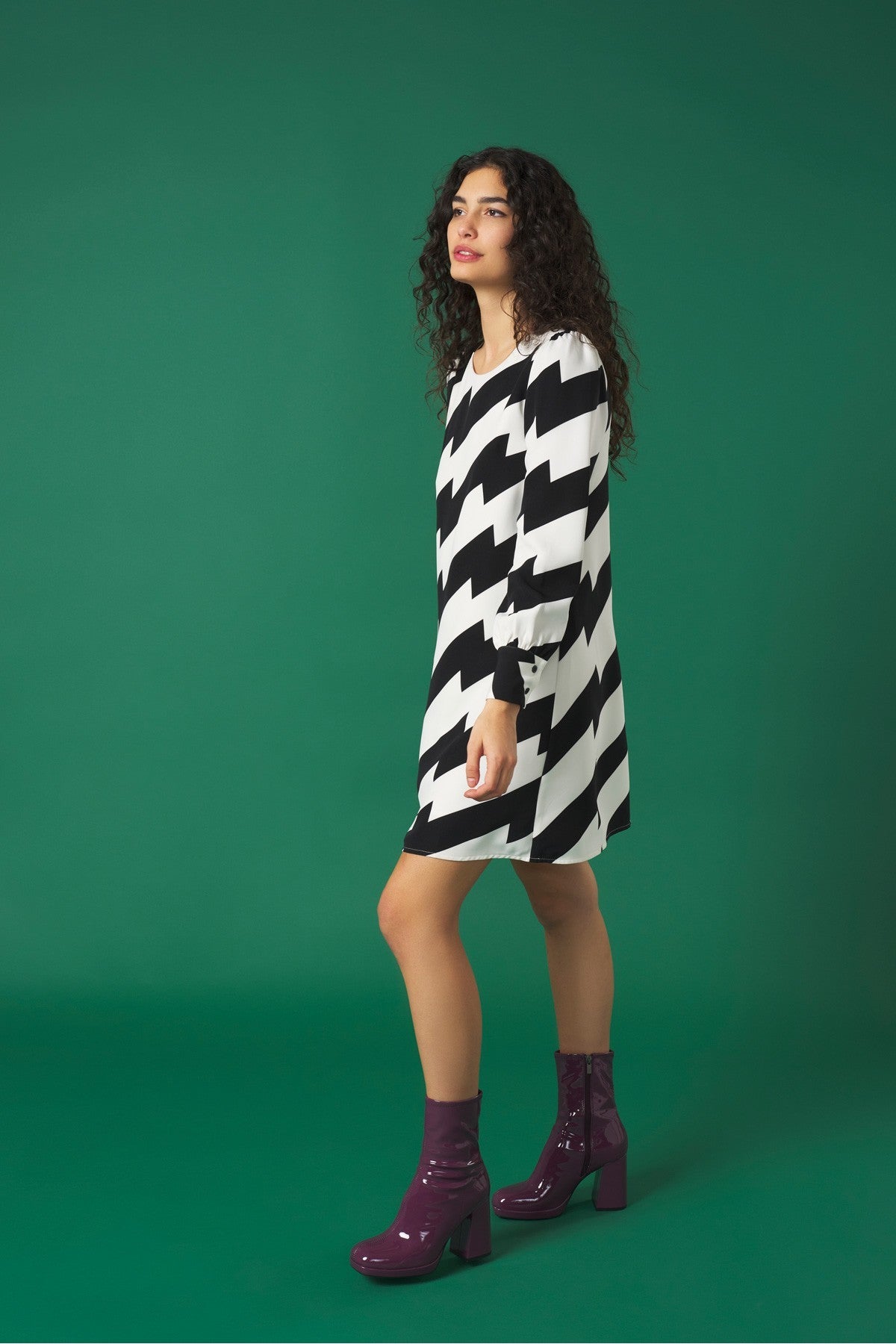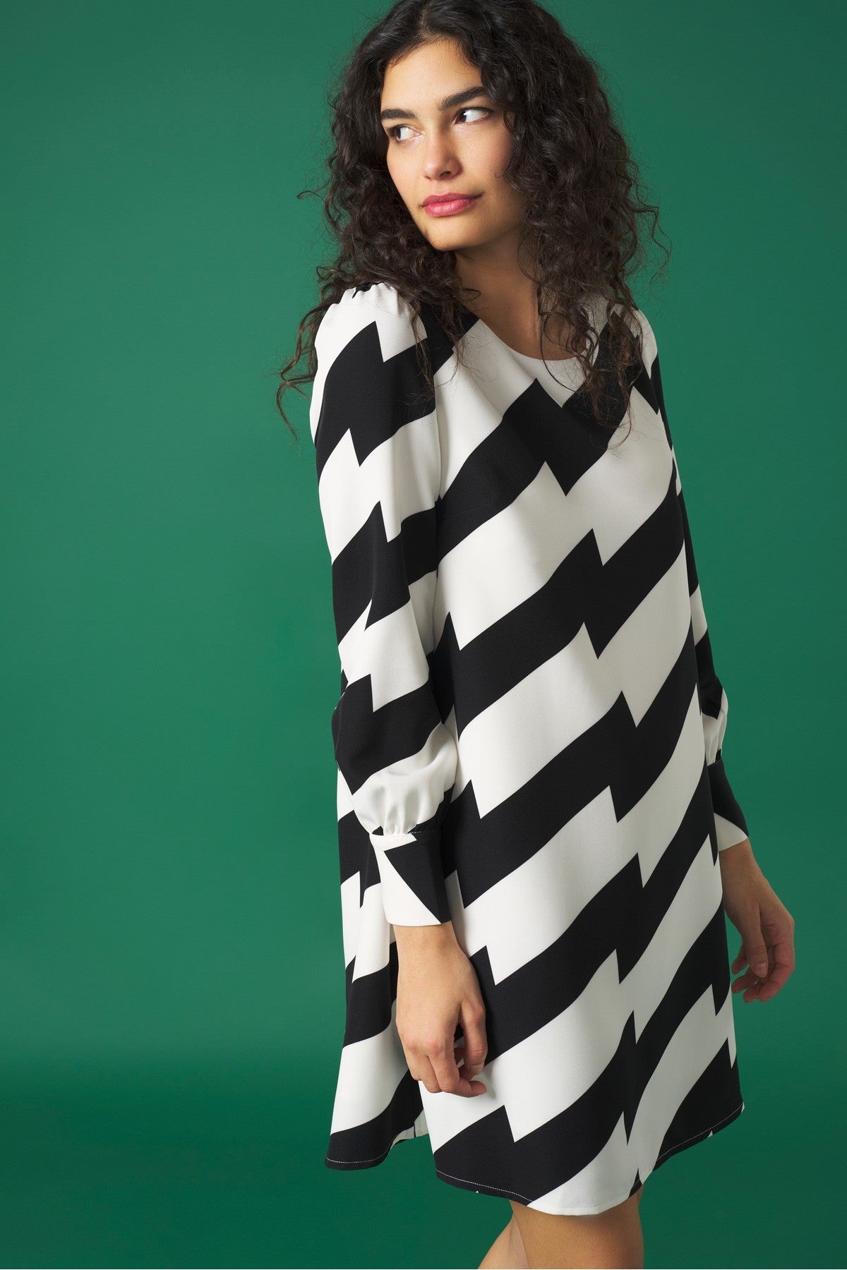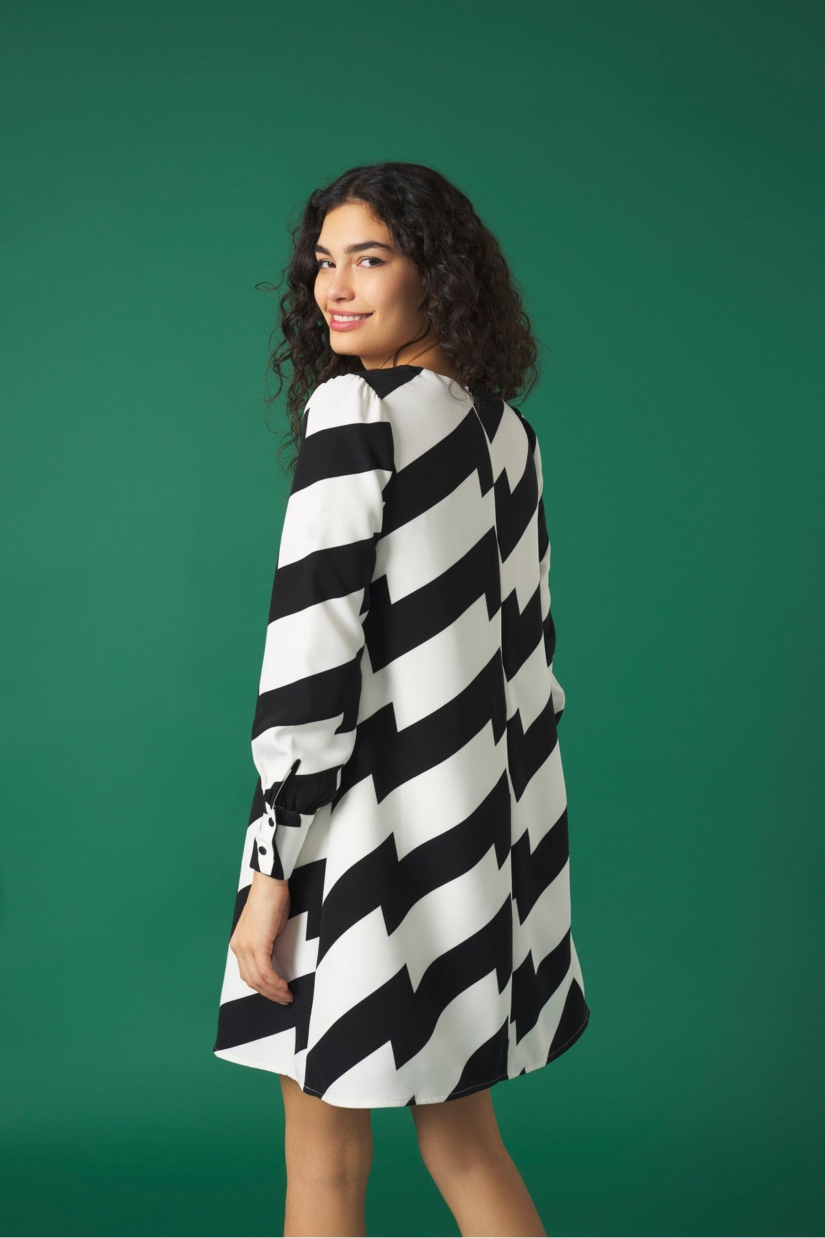 Look the part with the BETTE Dress. This mini dress features a striking monochrome all-over print for a stylish yet modern look. Crafted with long sleeves with two button cuffs, a round neckline and concealed zip to the back, this dress combines comfort and effortless elegance.