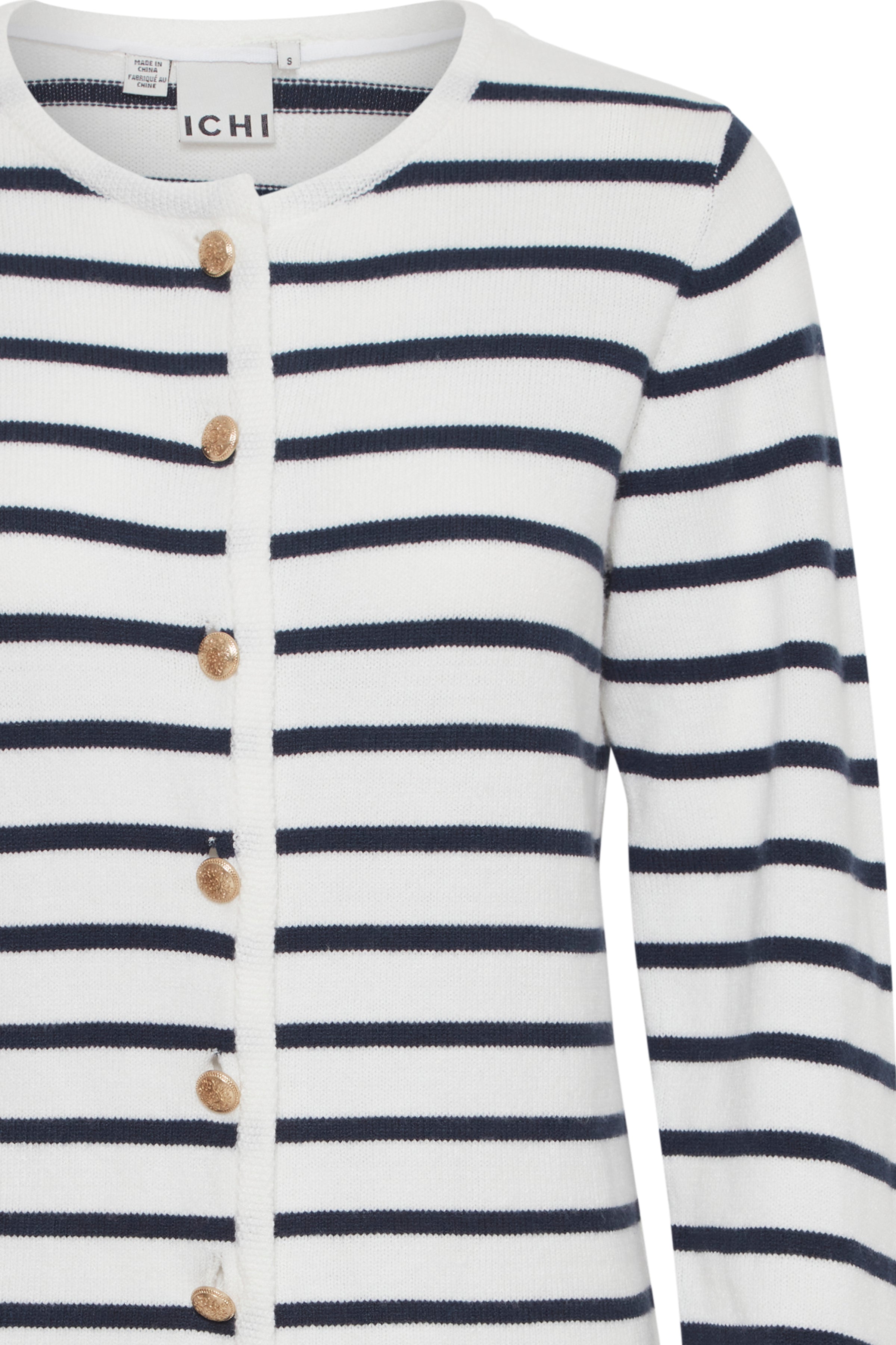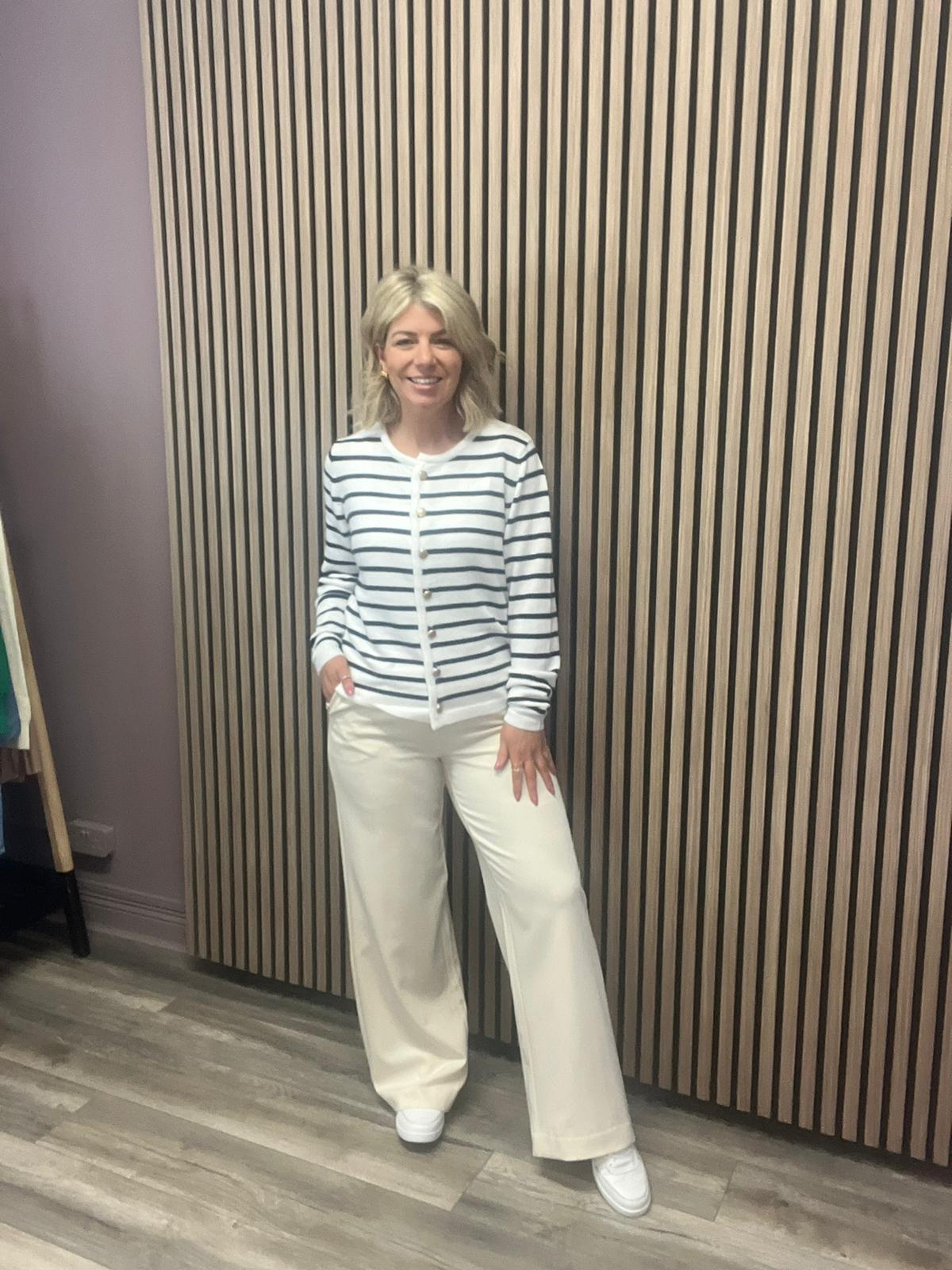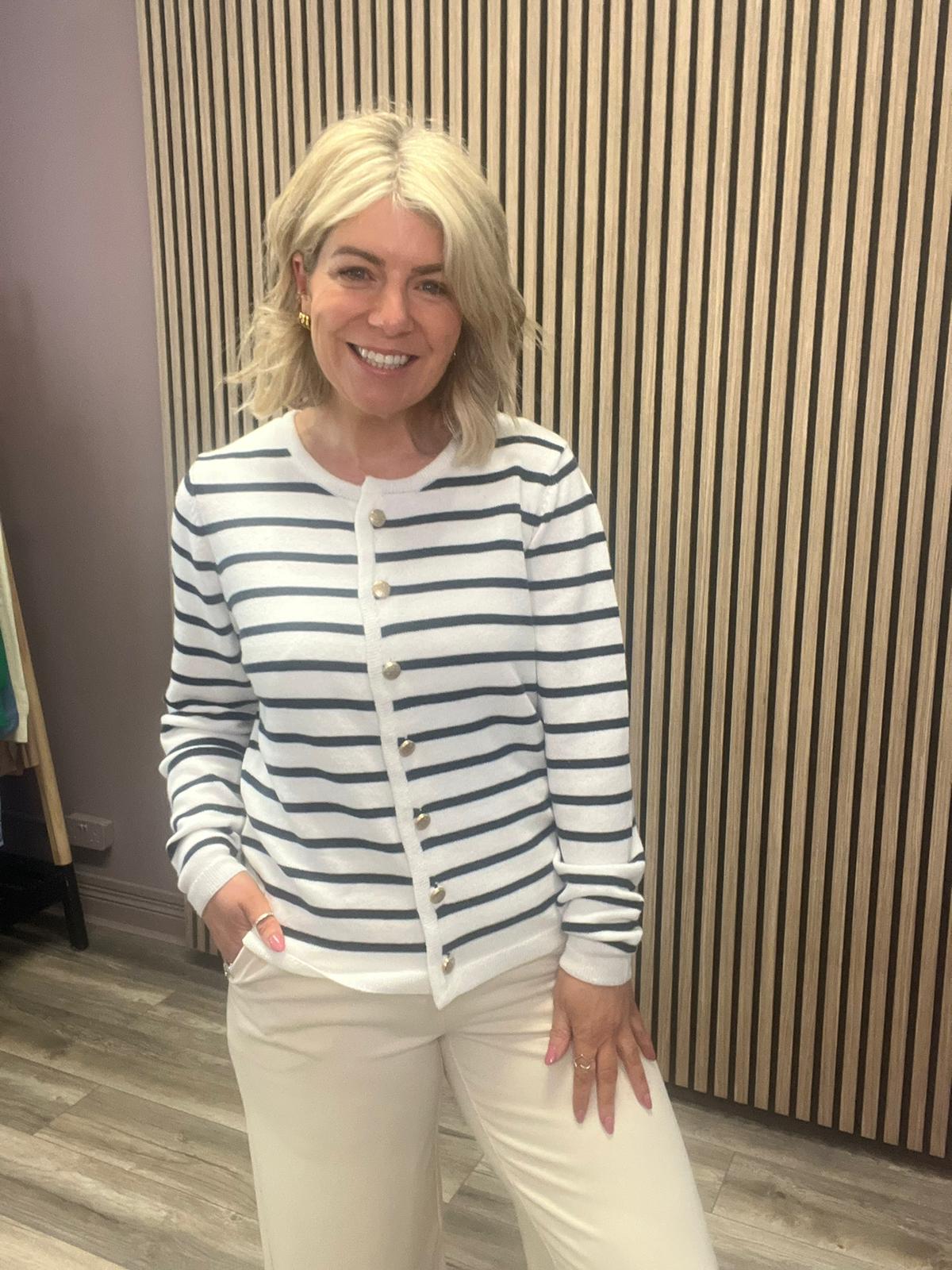 Introducing the BEXLEY Cardigan in a nautical-inspired colourway. This cardigan features a classic horizontal stripe design, complemented by elegant gold buttons. The contrasting collar and cuffs add a touch of sophistication. Made from soft knit fabric, it guarantees comfort while still looking stylish. A timeless piece.
