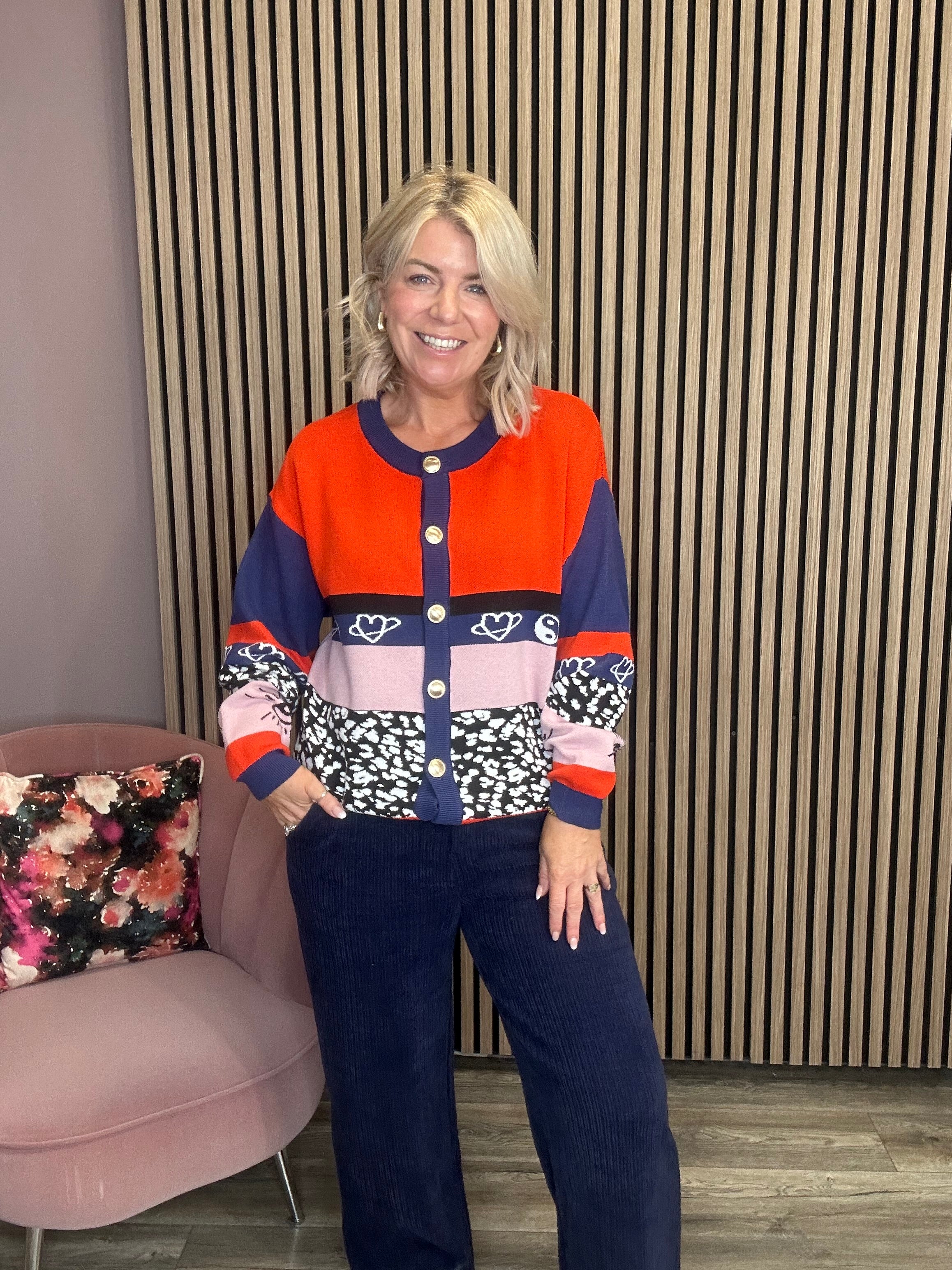 A cardigan full of character and colour contrast. Decorative gold buttons and drop shoulder style make Billie the star of your outfit.