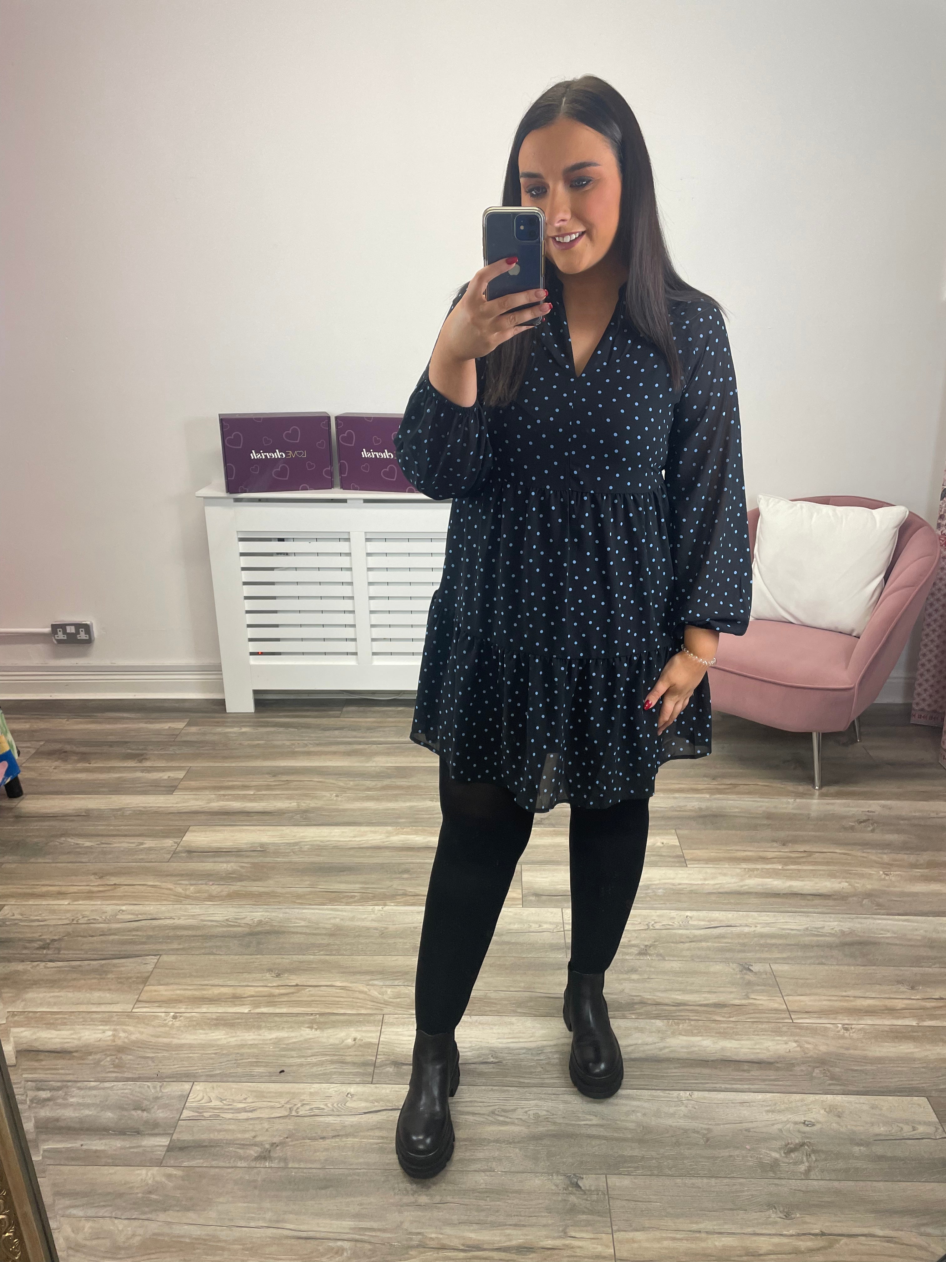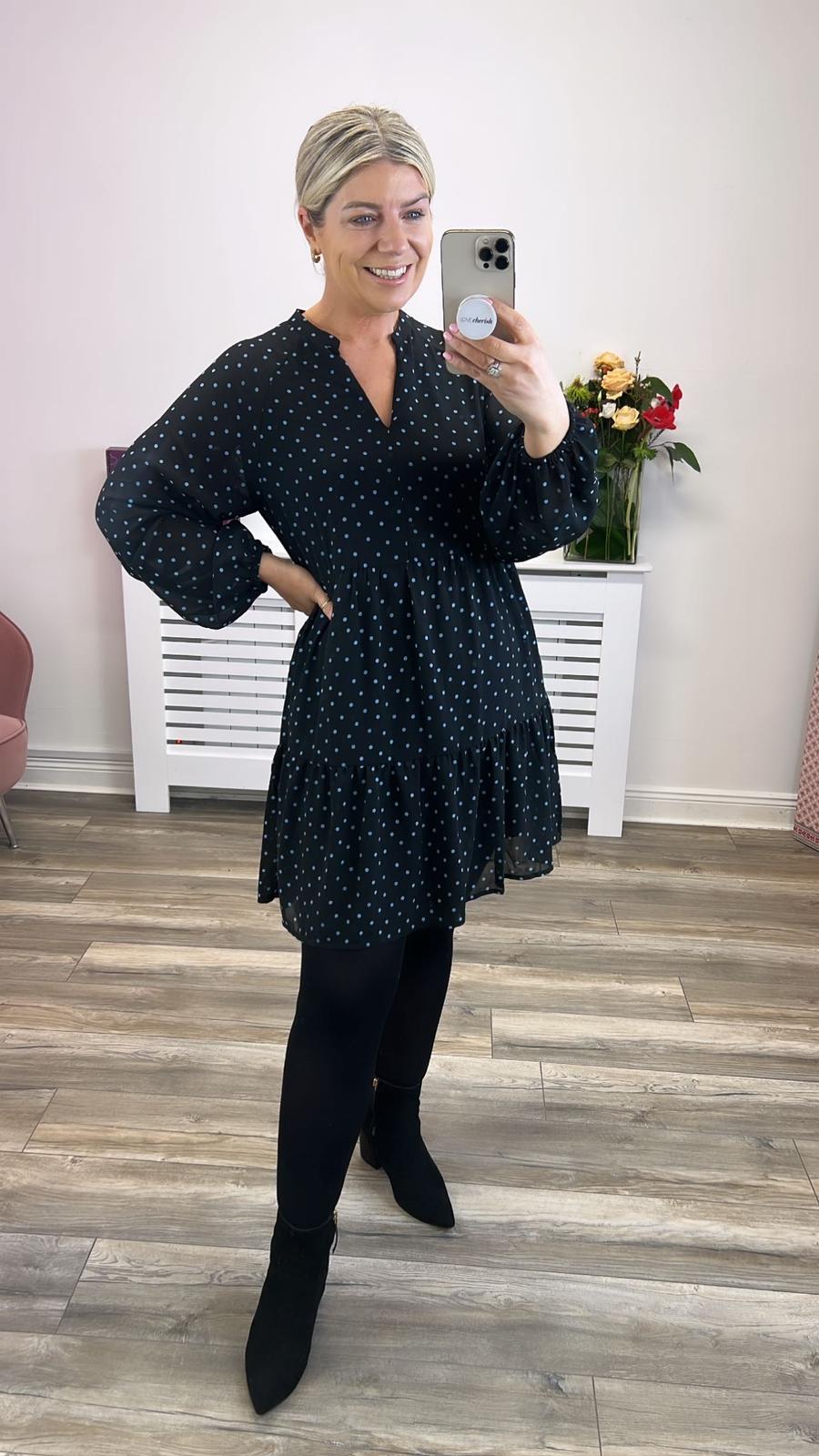 We adore this smock dress! Featuring long balloon sleeves, cuffs with elastic binding, v-neckline and cut waistline! Pair with our Hanley faux leather biker Jacket and our Andria ankle boot for a cute look.
