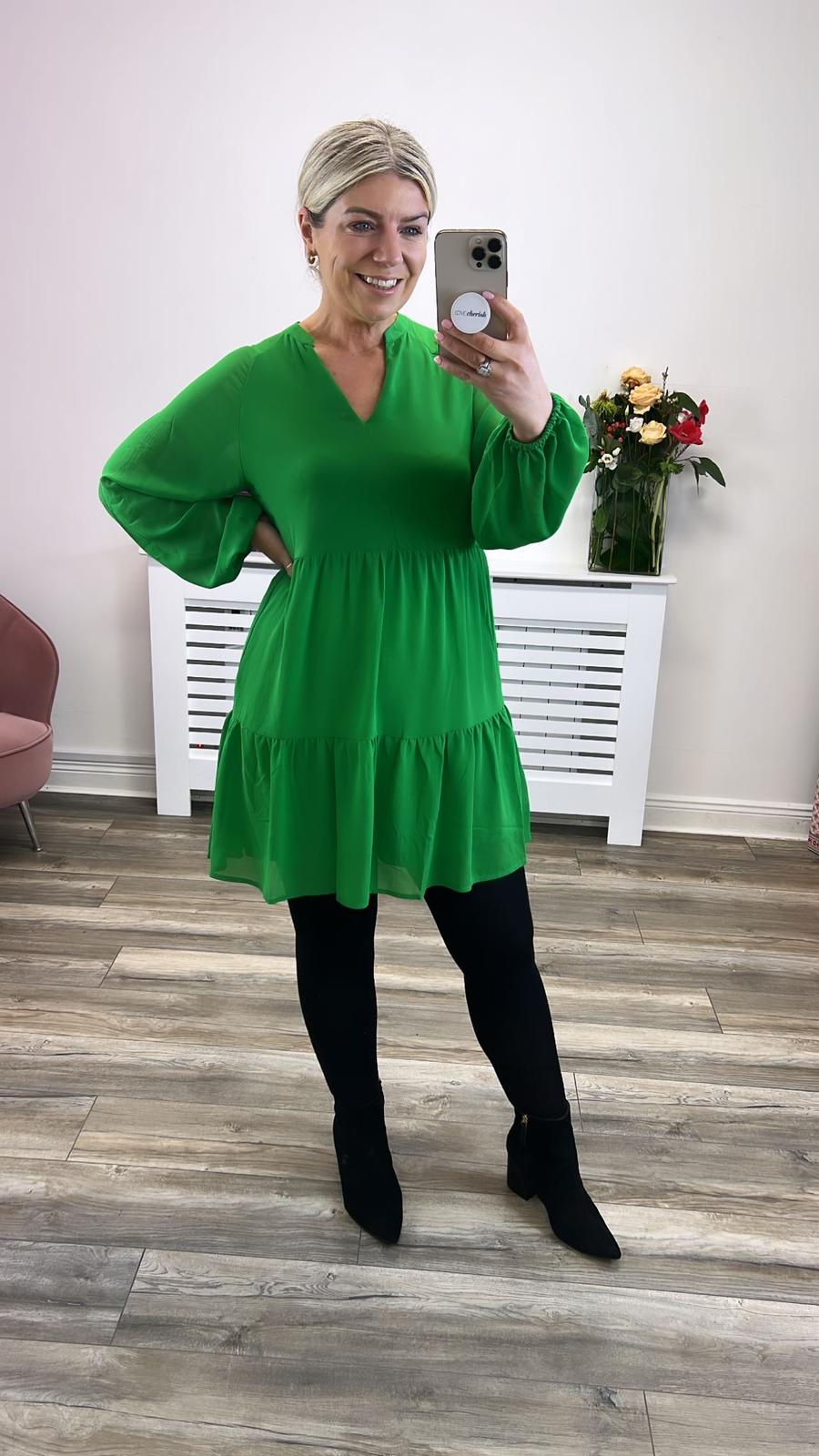 We adore this smock dress! Featuring long balloon sleeves, cuffs with elastic binding, v-neckline and cut waistline! Pair with our Hanley faux leather biker Jacket and our Andria ankle boot for a cute look.