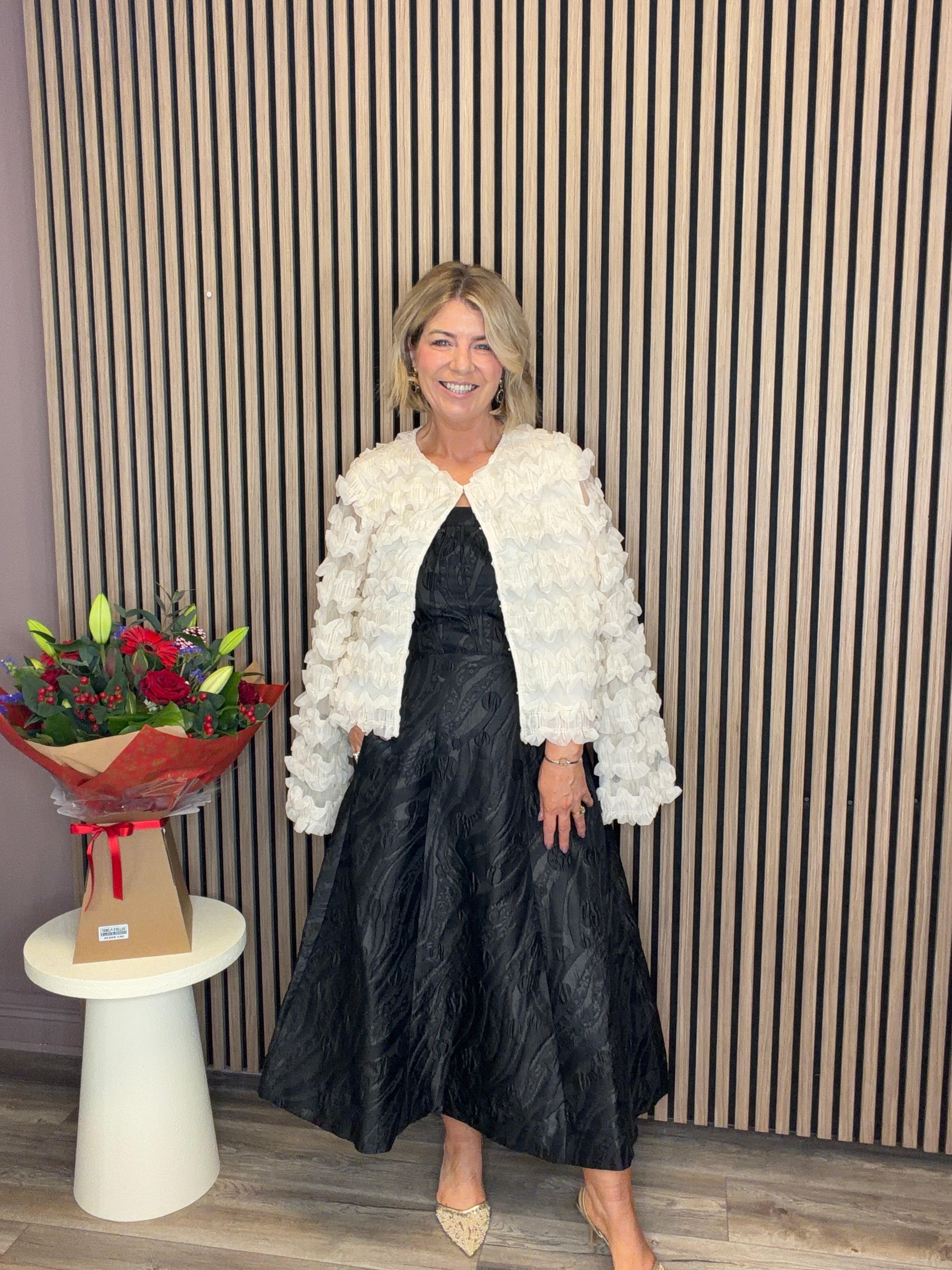 The Camelle top has plenty of feminine charm with its ruffle and frill design. The body is lined while the sleeves are partially sheer. Fastening is by concealed hook and eye. Wear closed as a stand alone top or wear open over a cami for effortless style.