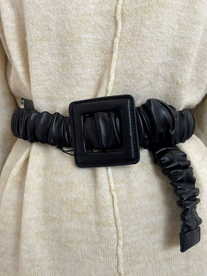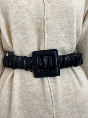 The black Cana faux leather belt from Pieces features a square buckle and elasticated band.