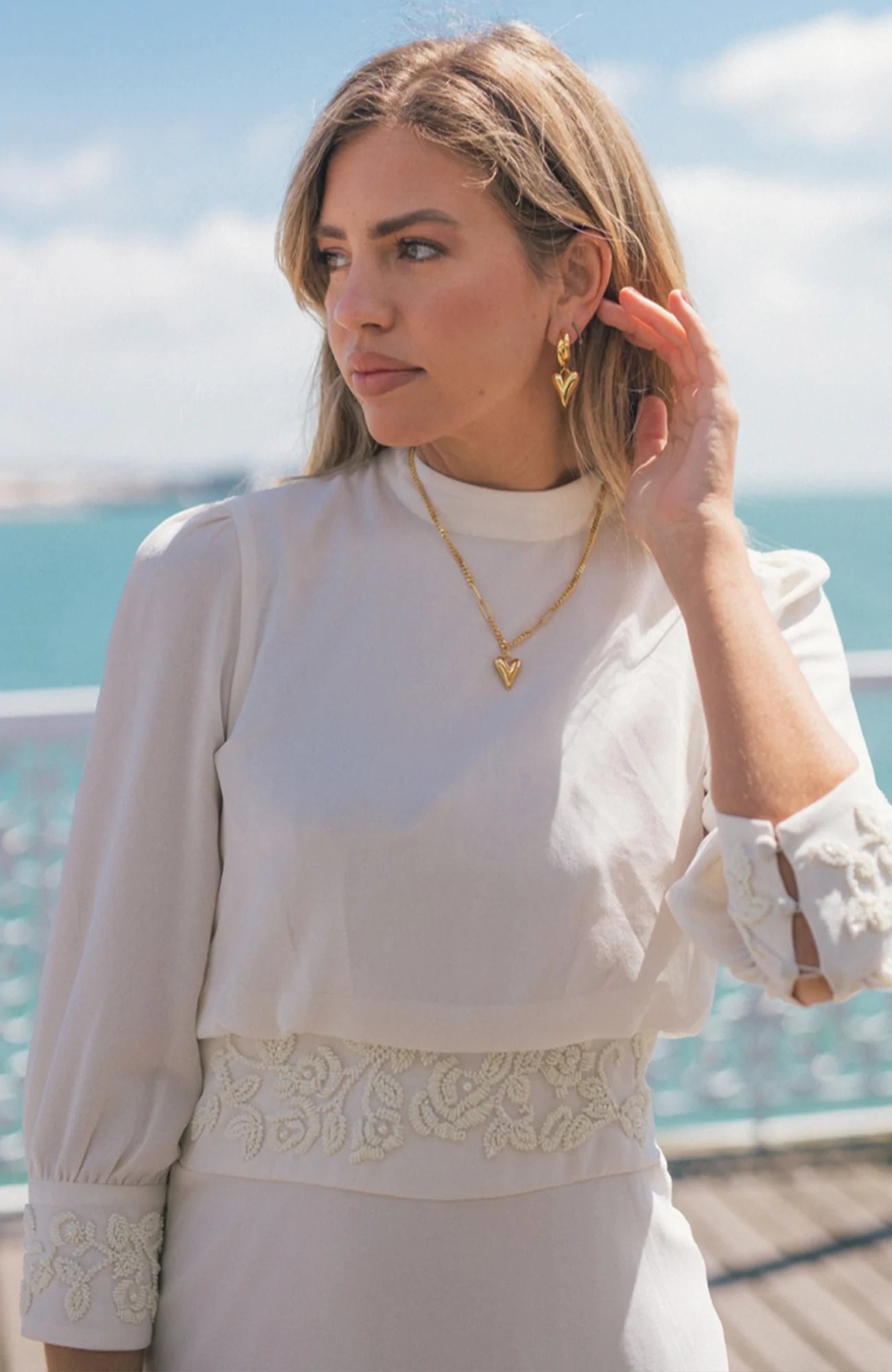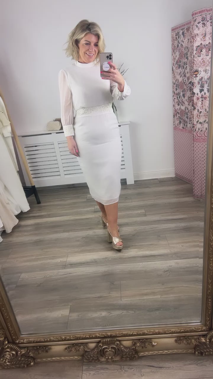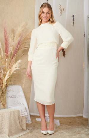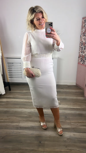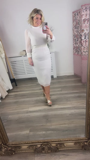 Mesmerize and melt hearts in this gorgeous Hope & Ivy design from our Autumn 22 collection. This flattering, body hugging midi dress is perfect for the chic bride on her wedding day. Featuring embellishment across the waistline and sleeves, high neck and open back detail, this silhouette is sure to become a quick classic.