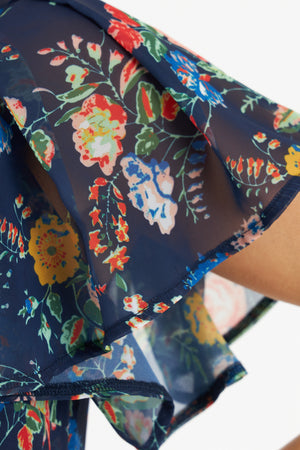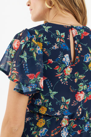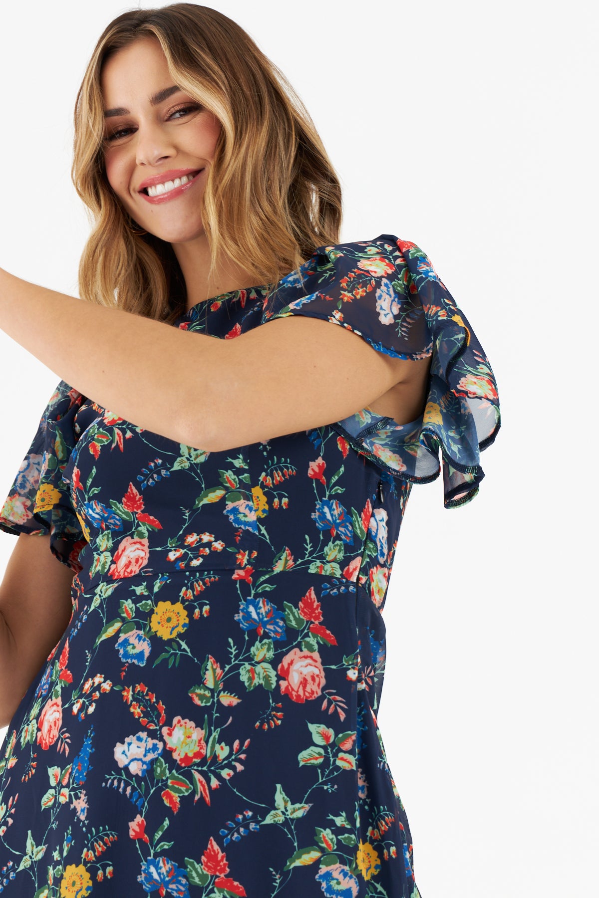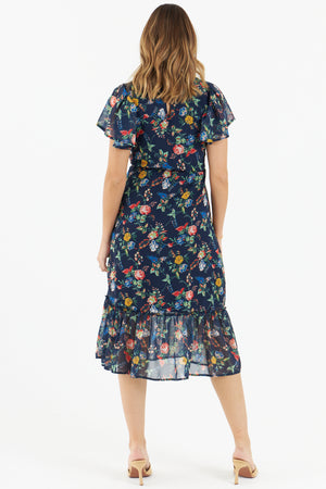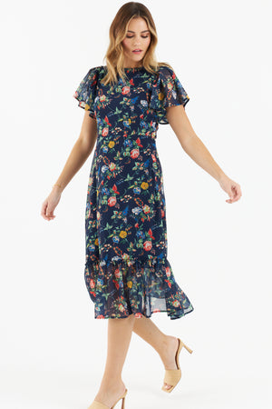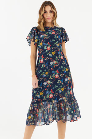 This midi length dress with a tiered skirt features ruffled short sleeves, an elasticated back waist, and side zip fastening. The dress is crafted in a flowy chiffon fabric cut in a beautiful navy summer floral print. Wear with platforms heels, strappy sandals or mules as per our model.