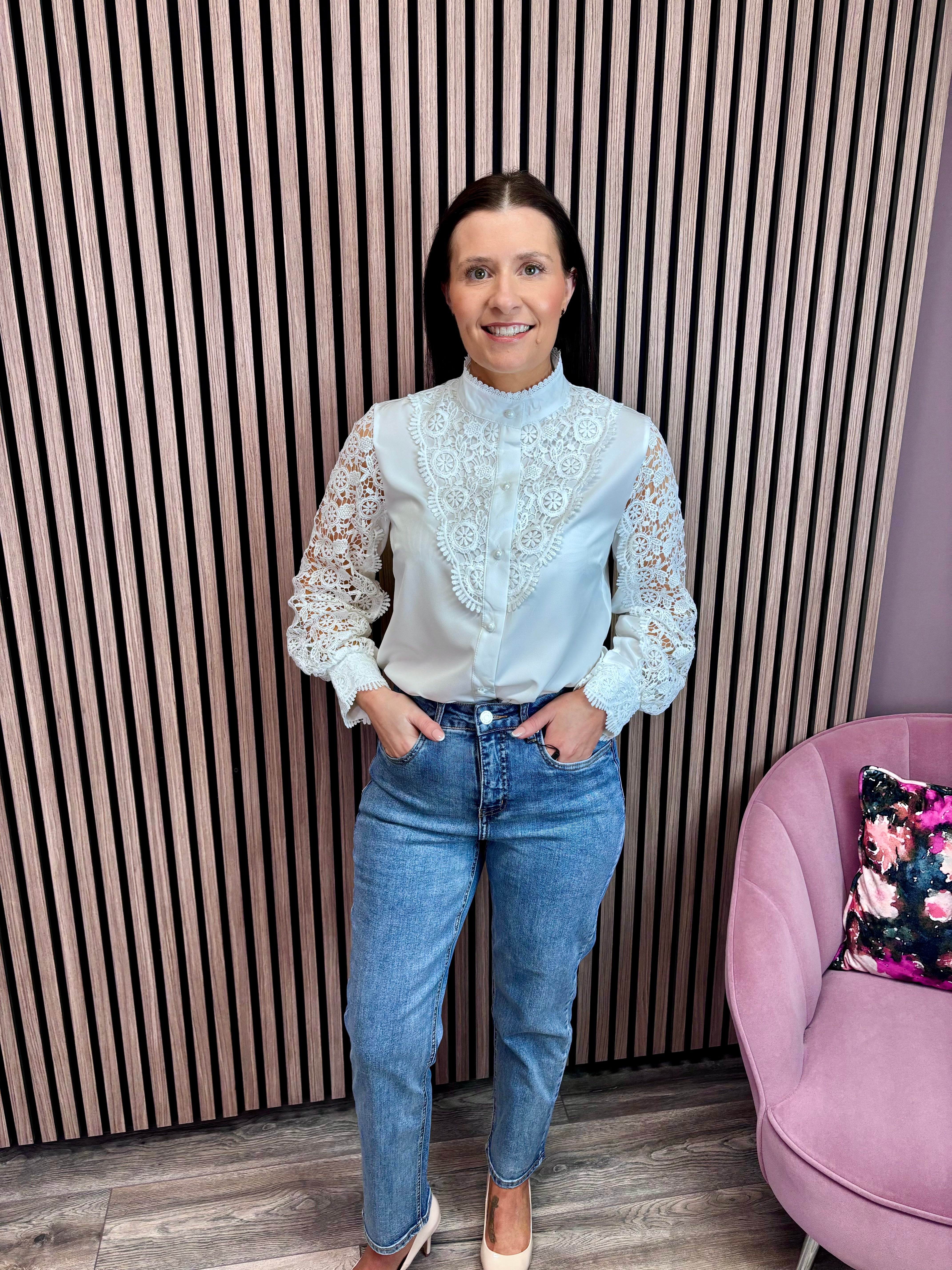 Uncover graceful elegance with the Chloe High Neck Lace Detail Shirt. Featuring a feminine high collar with delicate lace accents and pearl-effect buttons, this shirt seamlessly merges classic and modern styles. Add this essential piece to your wardrobe for an elevated look.