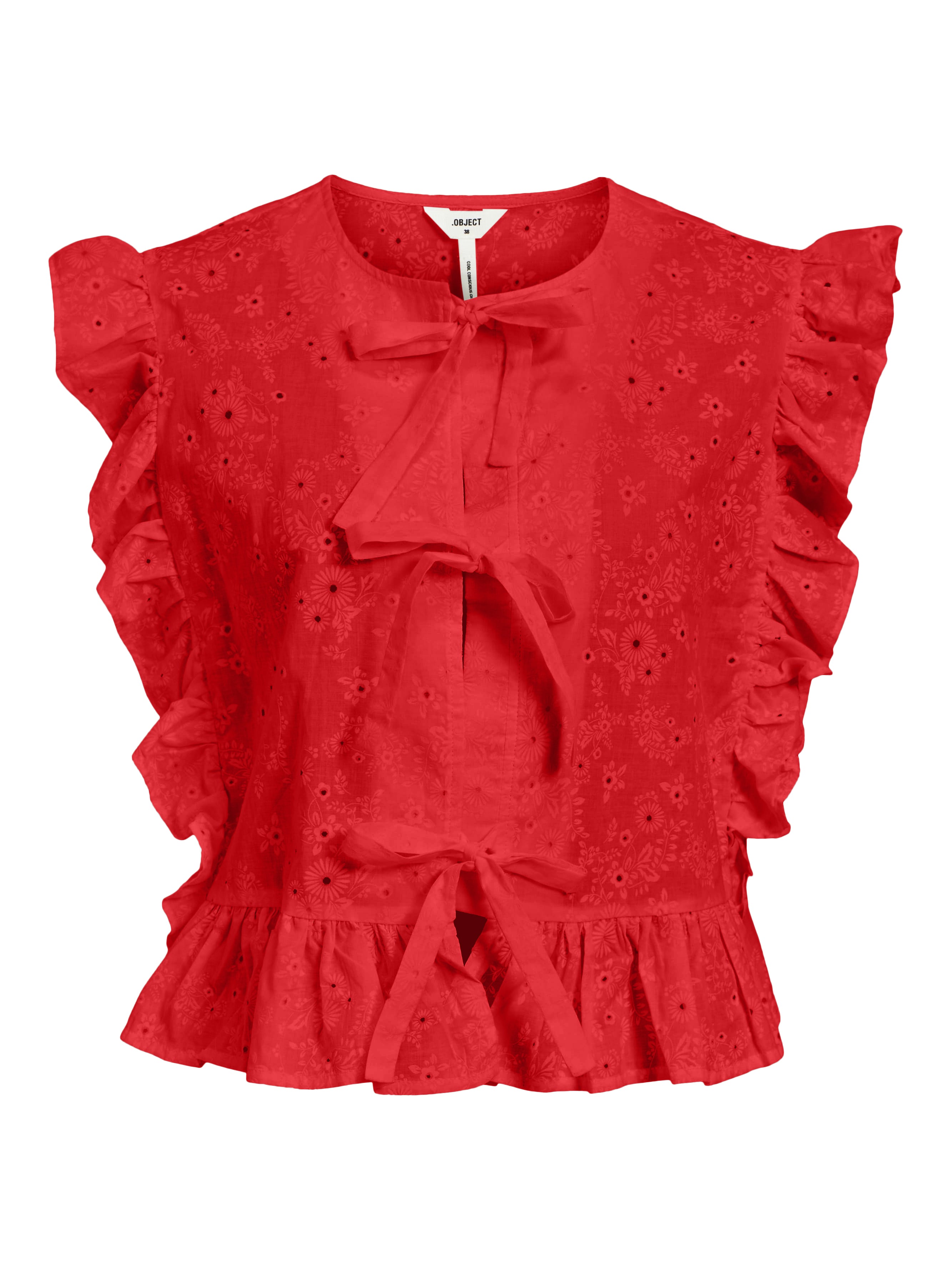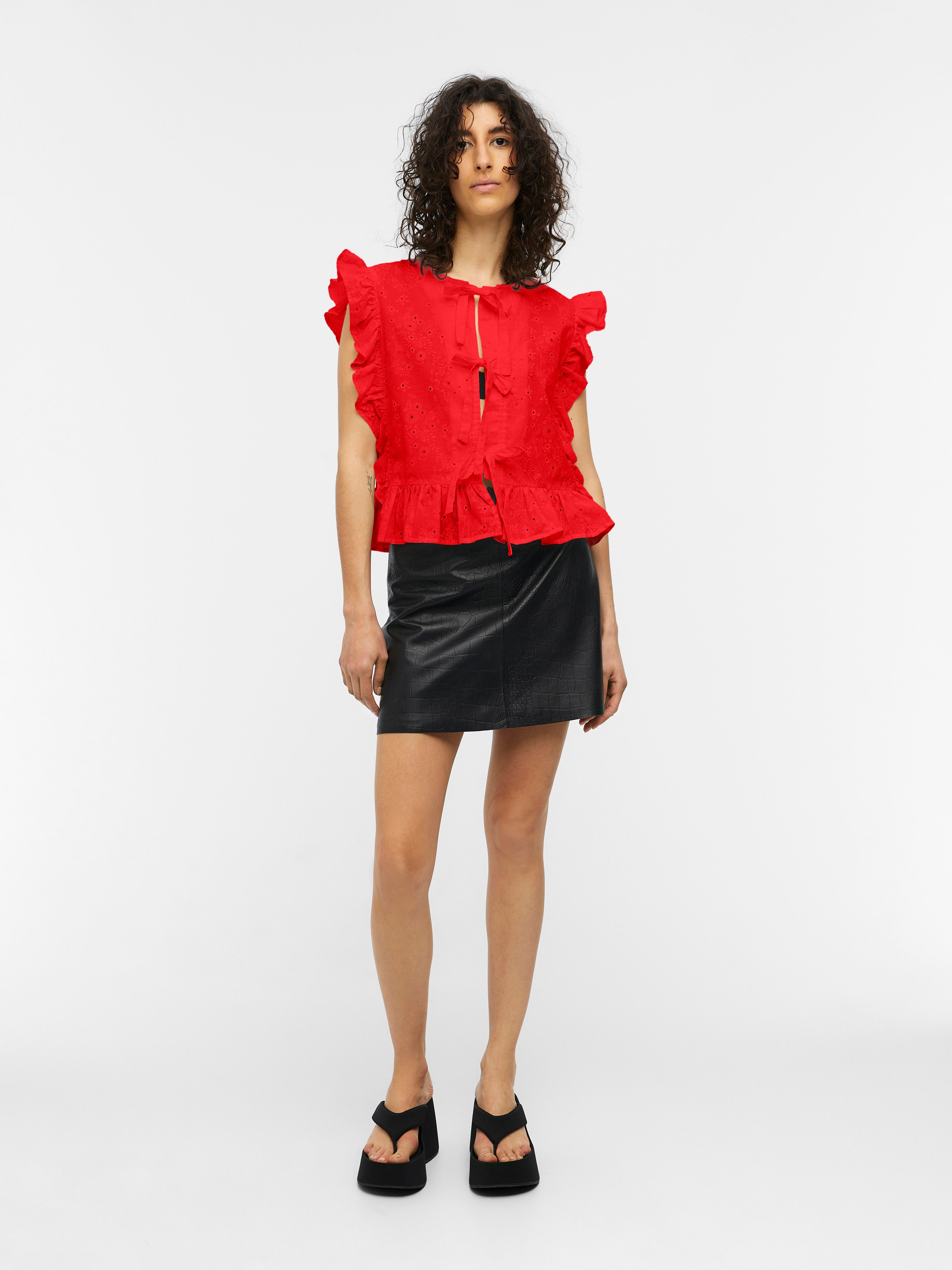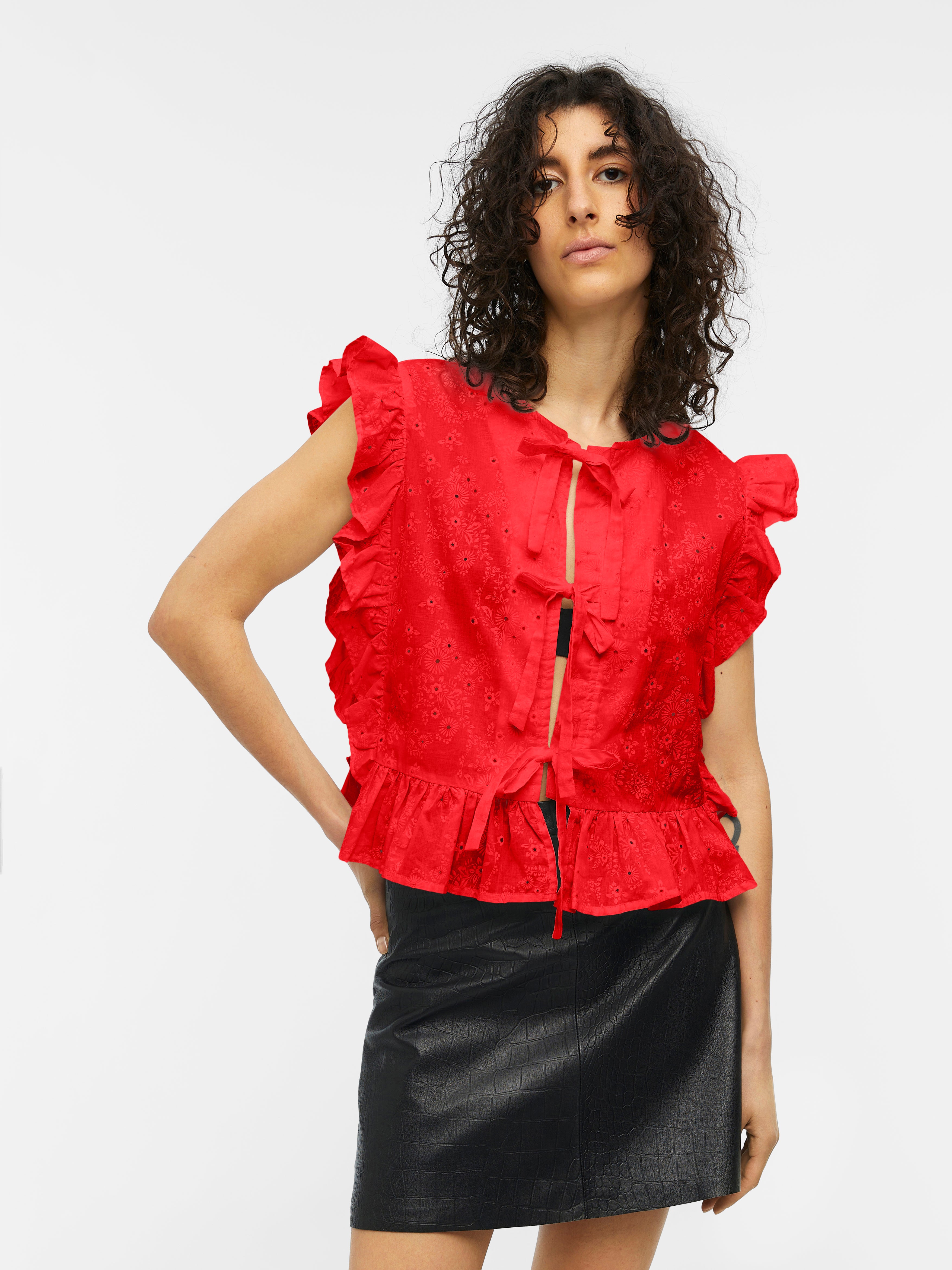 Add a playful touch to your wardrobe with the Cilla Sleeveless Ruffle Top in Flame Scarlet! This cotton top features a charming bow tie front, ruffle detailing, and all over broderie anglaise details. Perfect for a fun and flirty summer look.