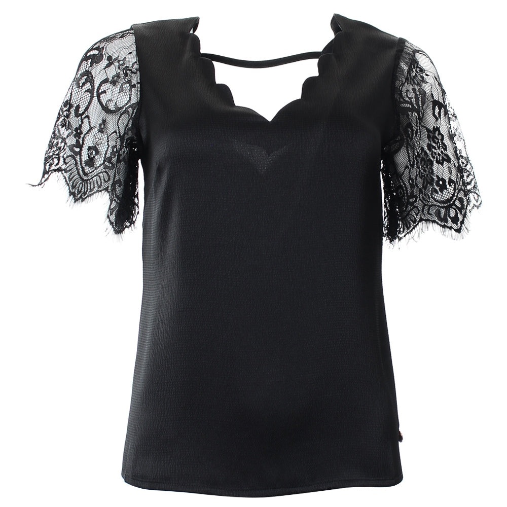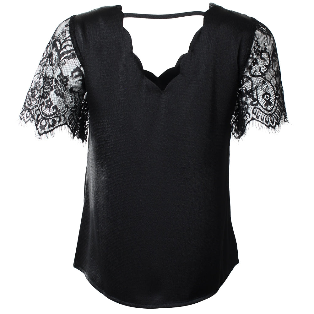 Cut from intricate lace, and a fluid fabric bodice, this black top is designed with short subtle balloon sleeve and a flattering v neckline back and front, it finished with a scalloped edge for a sophisticated feel. This black top is a versatile style elevated by way of subtle design details. pair yours with tailored trousers and heels for your next event.