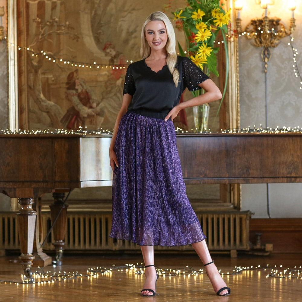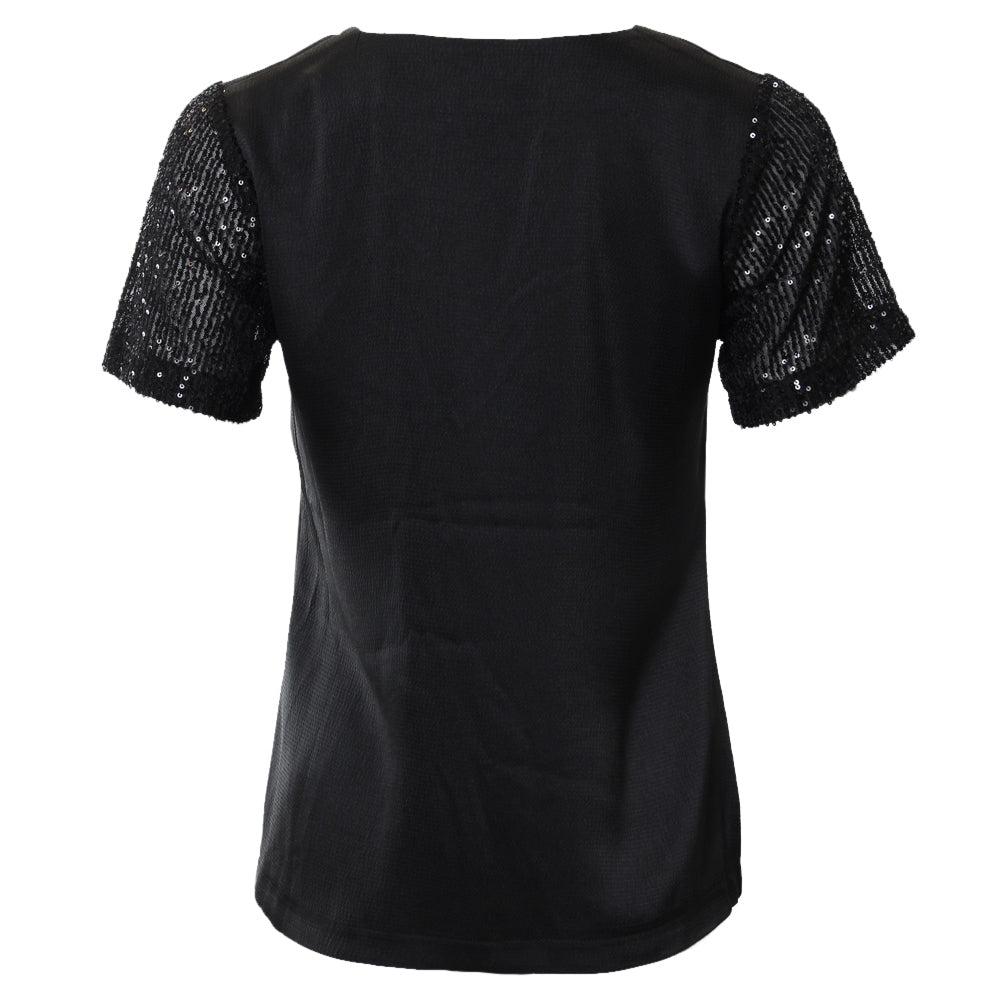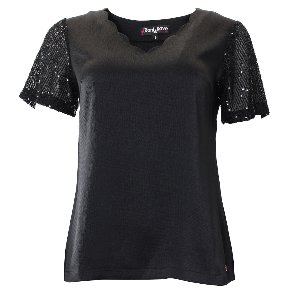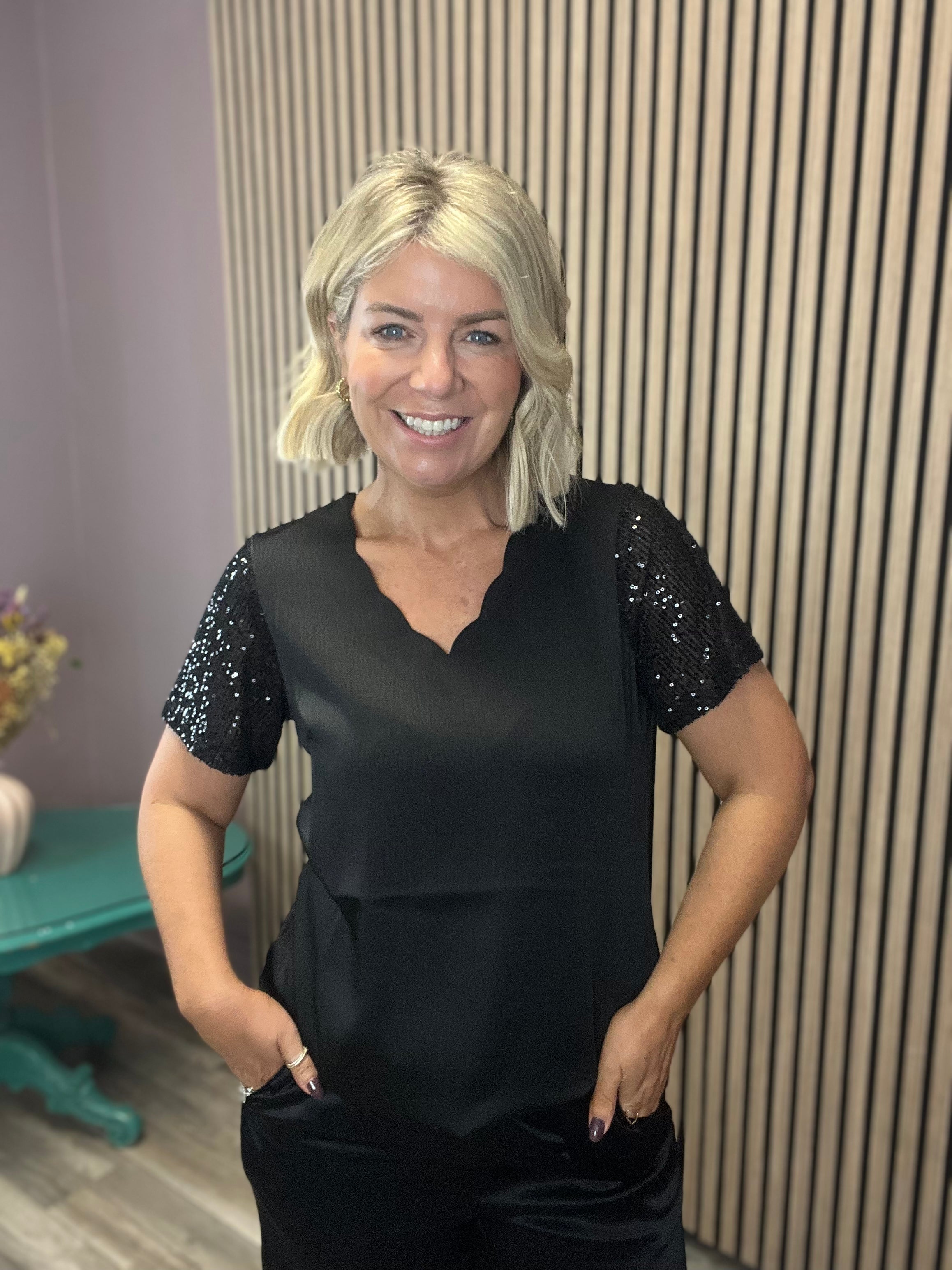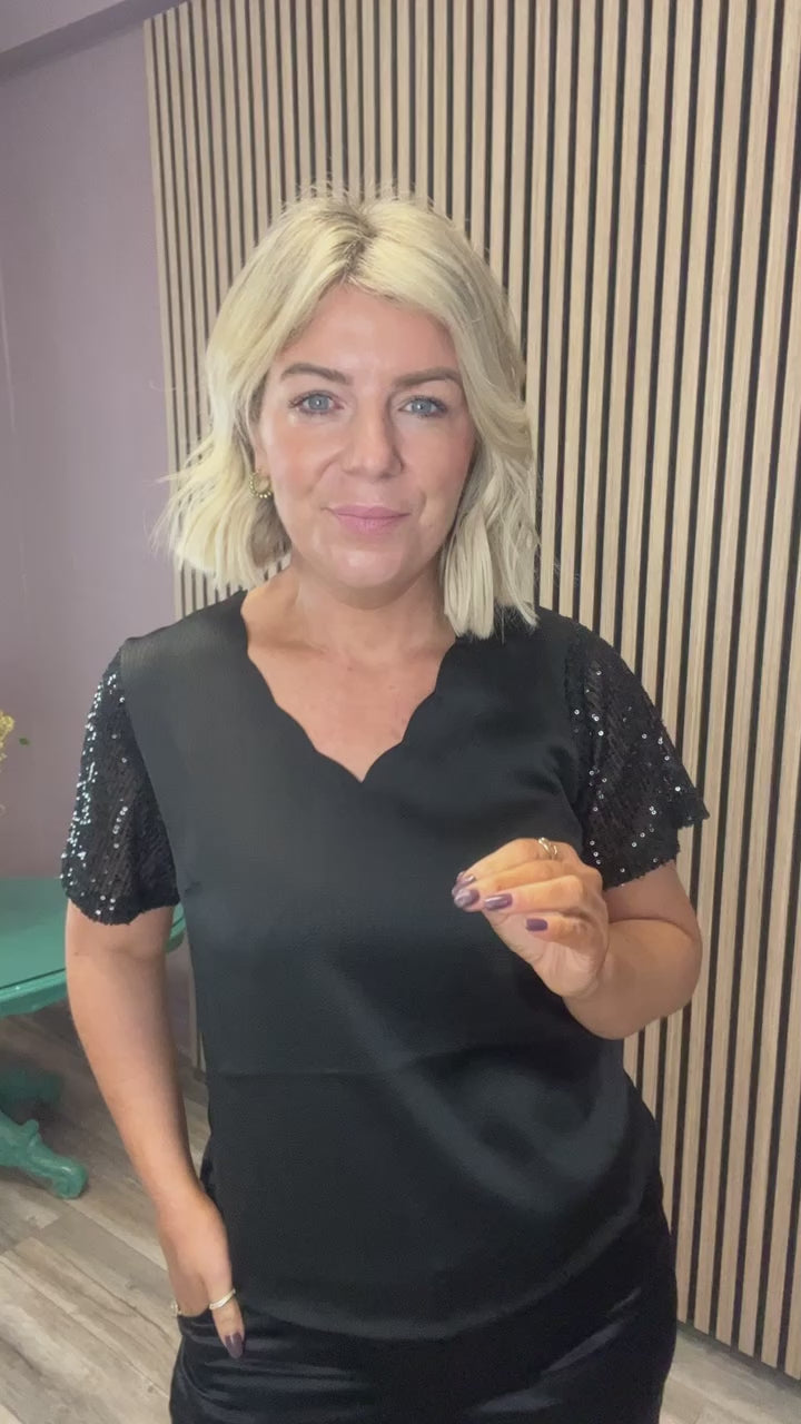 Elevate your wardrobe with the CLARA Top. A versatile and stylish addition to your collection of tops. Crafted from a satin like material featuring a v-neck with scalloped edging and short sequin detail sleeves.