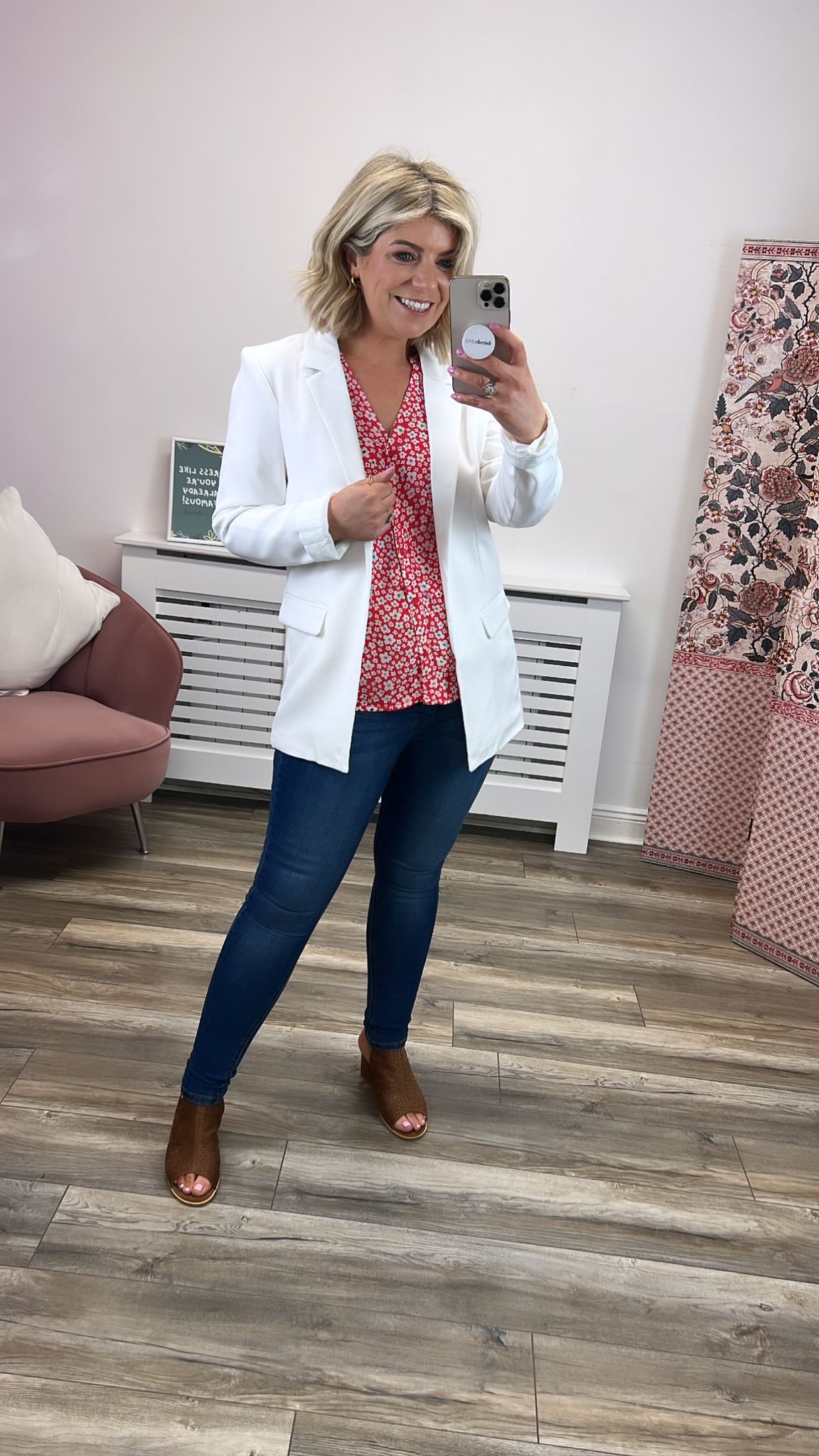 The Connie blouse emanates a casual sophistication with its boxy fit, v-neck, and button front closure. The longer short sleeves are finished with elasticated cuffs and decorated with vibrant rainbow daisies on a red base, offering an easy colourful companion to your favourite pair of jeans.