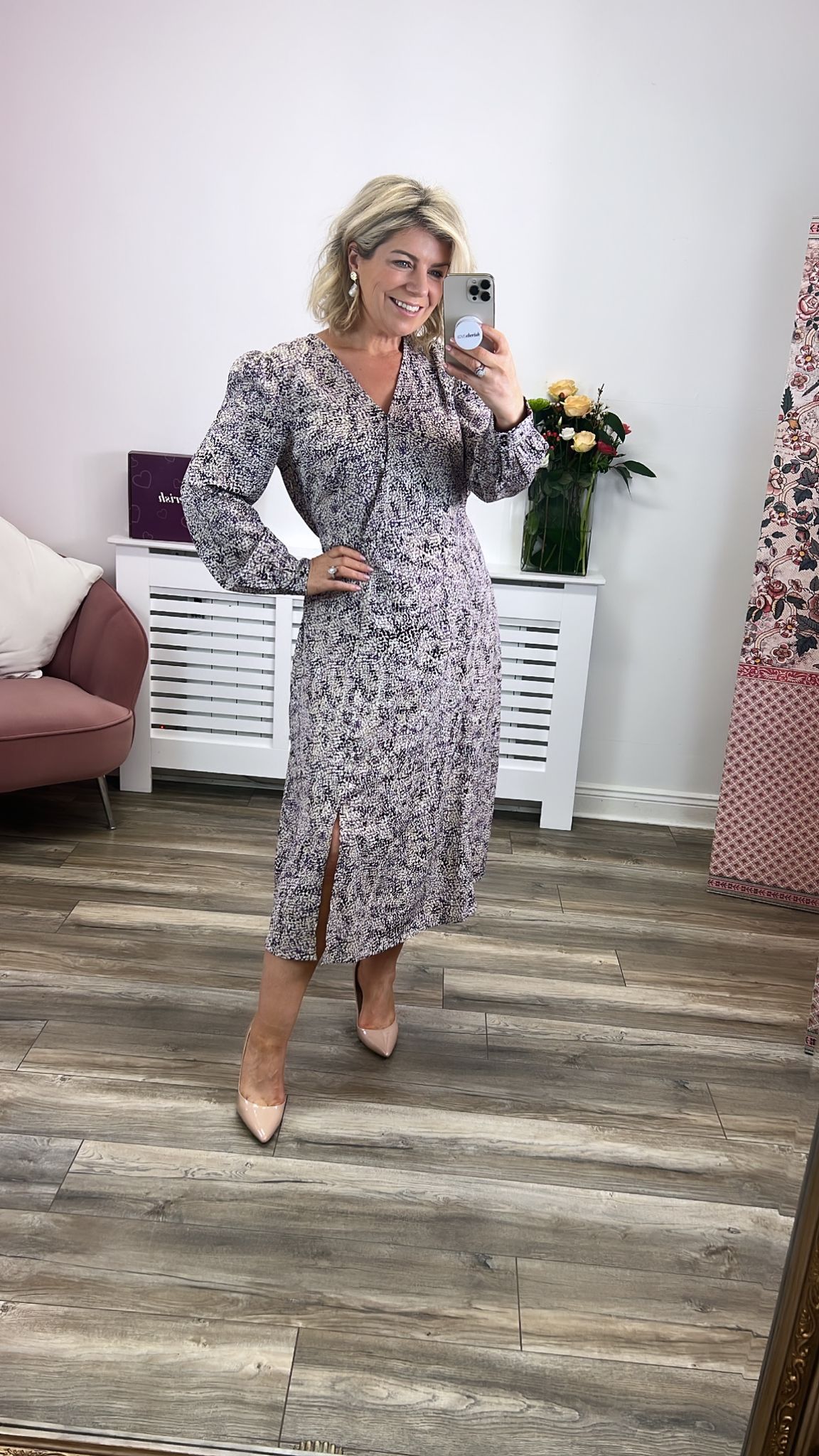 The COTO MIDI DRESS is the perfect choice for a fashionable and comfortable look. This dress features an all-over print, long sleeves with two button cuffs, side slit, midi length and a faux wrap v-neck with popper closure. The slight shoulder puff adds a stylish touch.