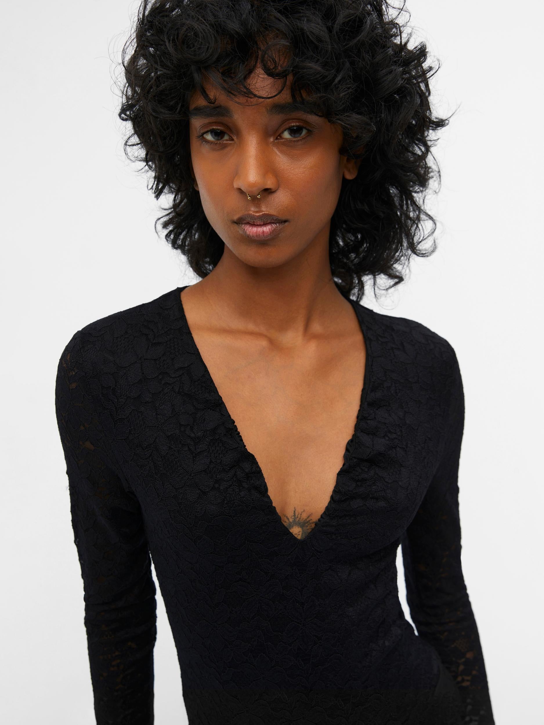 Featuring a classic V-neck silhouette, the DANNI Bodysuit is made from a stretchy, lightweight fabric with lace detailing and sheer long sleeves. The body is fully lined for comfort and ease of wear. Try it as part of an evening look.