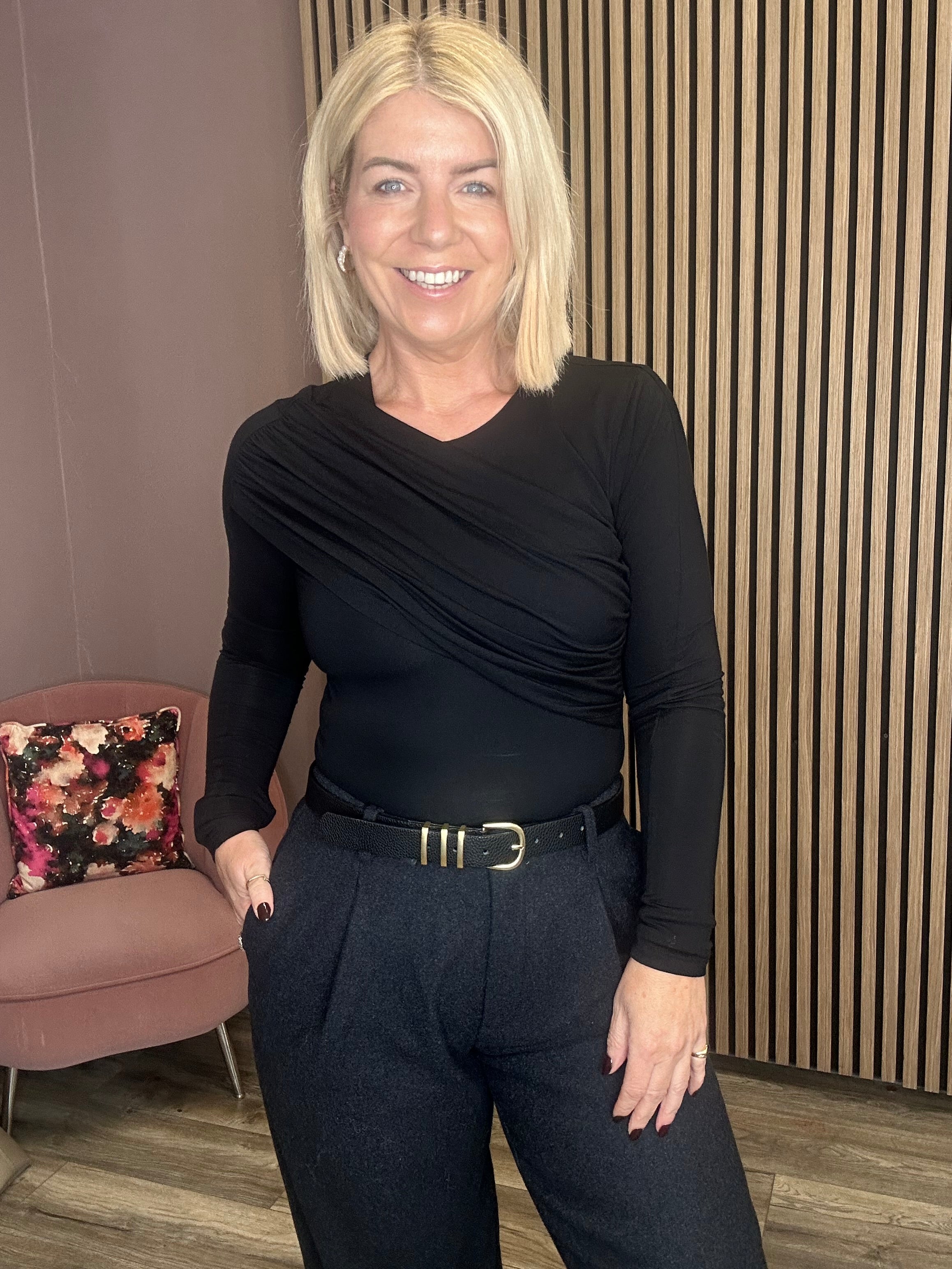 The Eden Top in Black features long sleeves and a classic crew neckline. Its front draped detail combined with a close-fitting cut beautifully highlights your figure, making it a stylish and flattering choice.