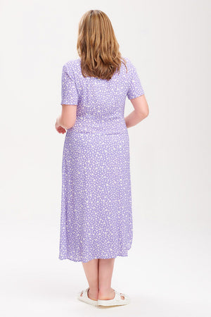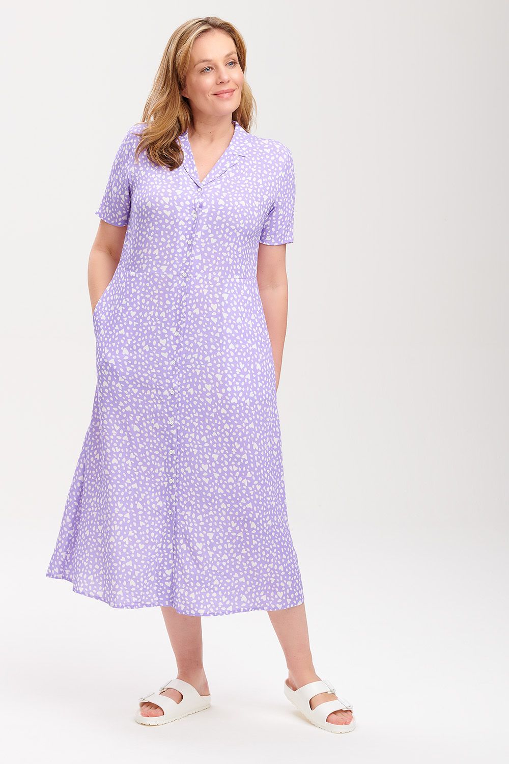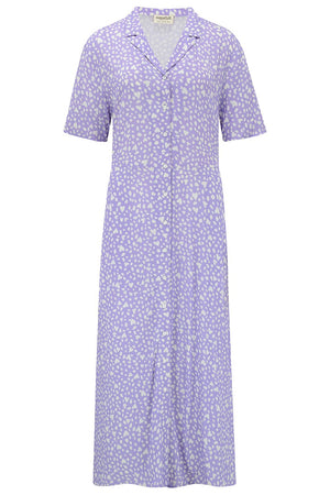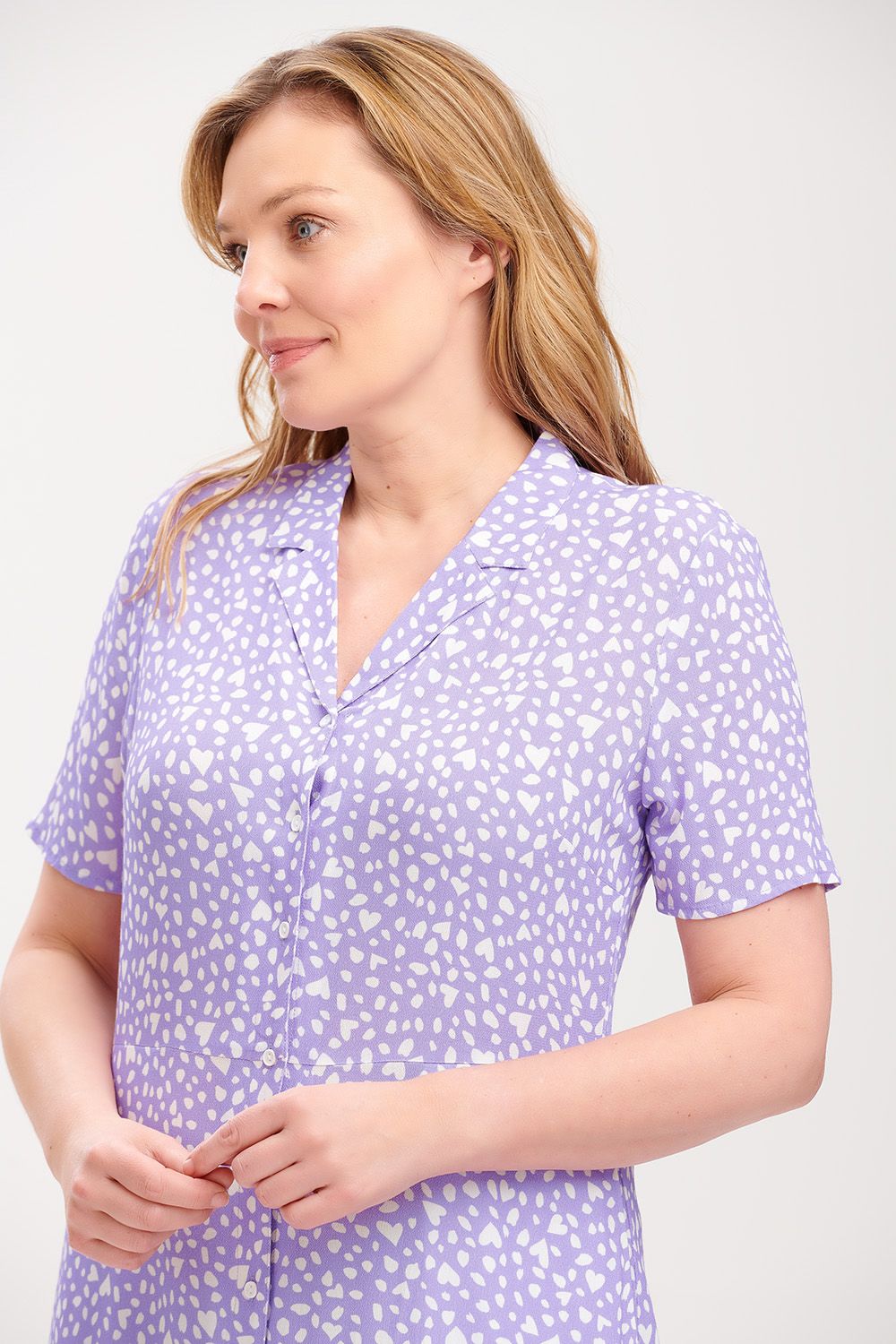 Our Eileen style is a longer length, relaxed collar shirtdress. This style has a revere collar, short sleeves, a functional button front and an A-line skirt. The Animal Floral Waves print features white love hearts on an lilac base.