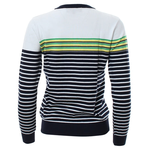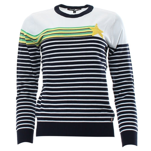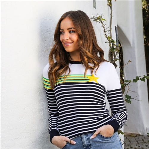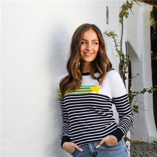 Spun with a fine fabric for softness, this optic white navy striped jumper is designed in a slightly fitted silhouette with a crew neckline and long sleeves. The yellow sequin star on the chest and the colourful striped detailing add interest. Pair yours with your favourite pair of jeans for everyday chic.