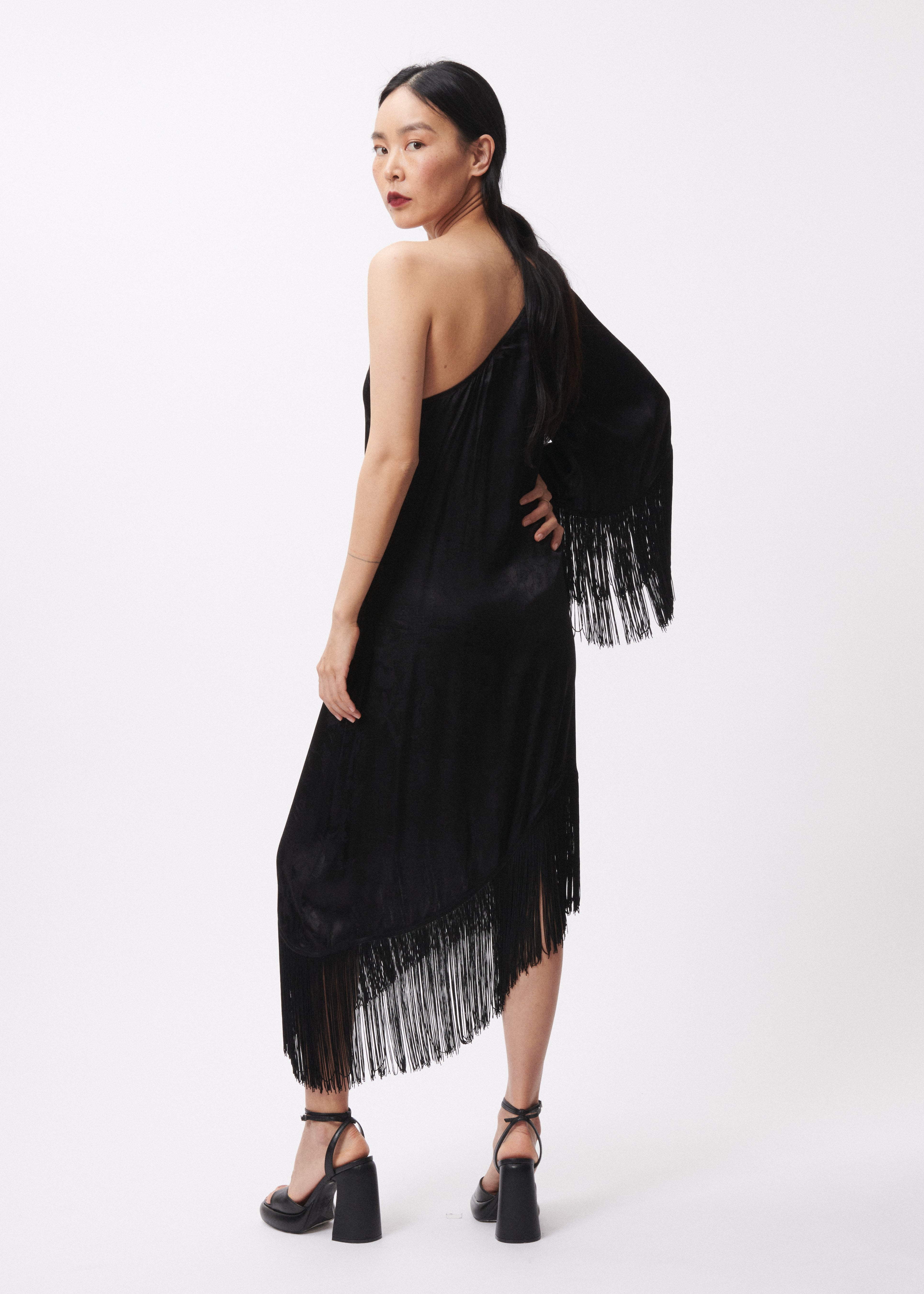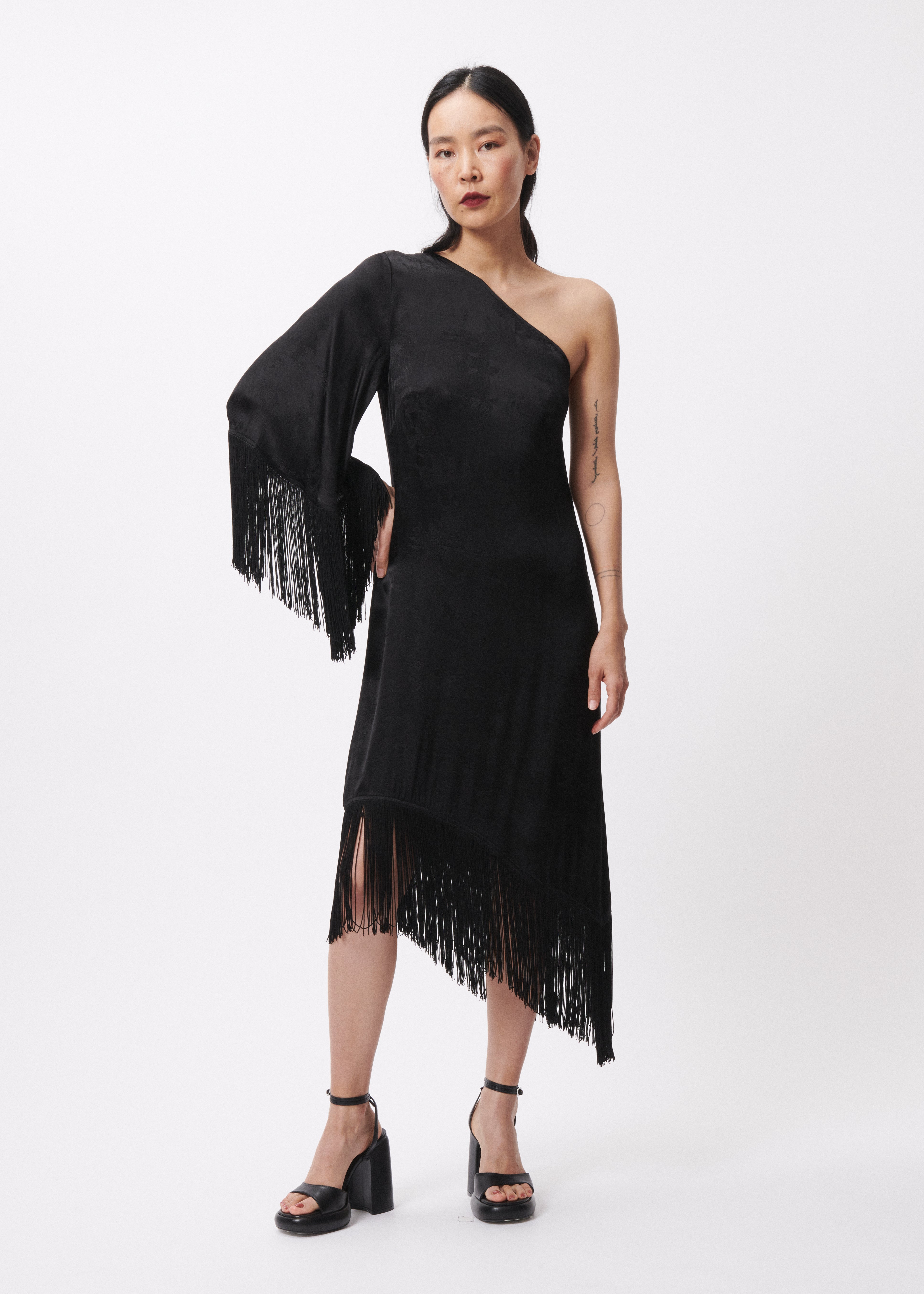 The ELENA dress is a sophisticated, versatile piece perfect for any occasion. Featuring a one shoulder long sleeve, long tassel cuff & hem, side zip closure and subtle print detail, this dress ensures comfortable and stylish wear for any event.