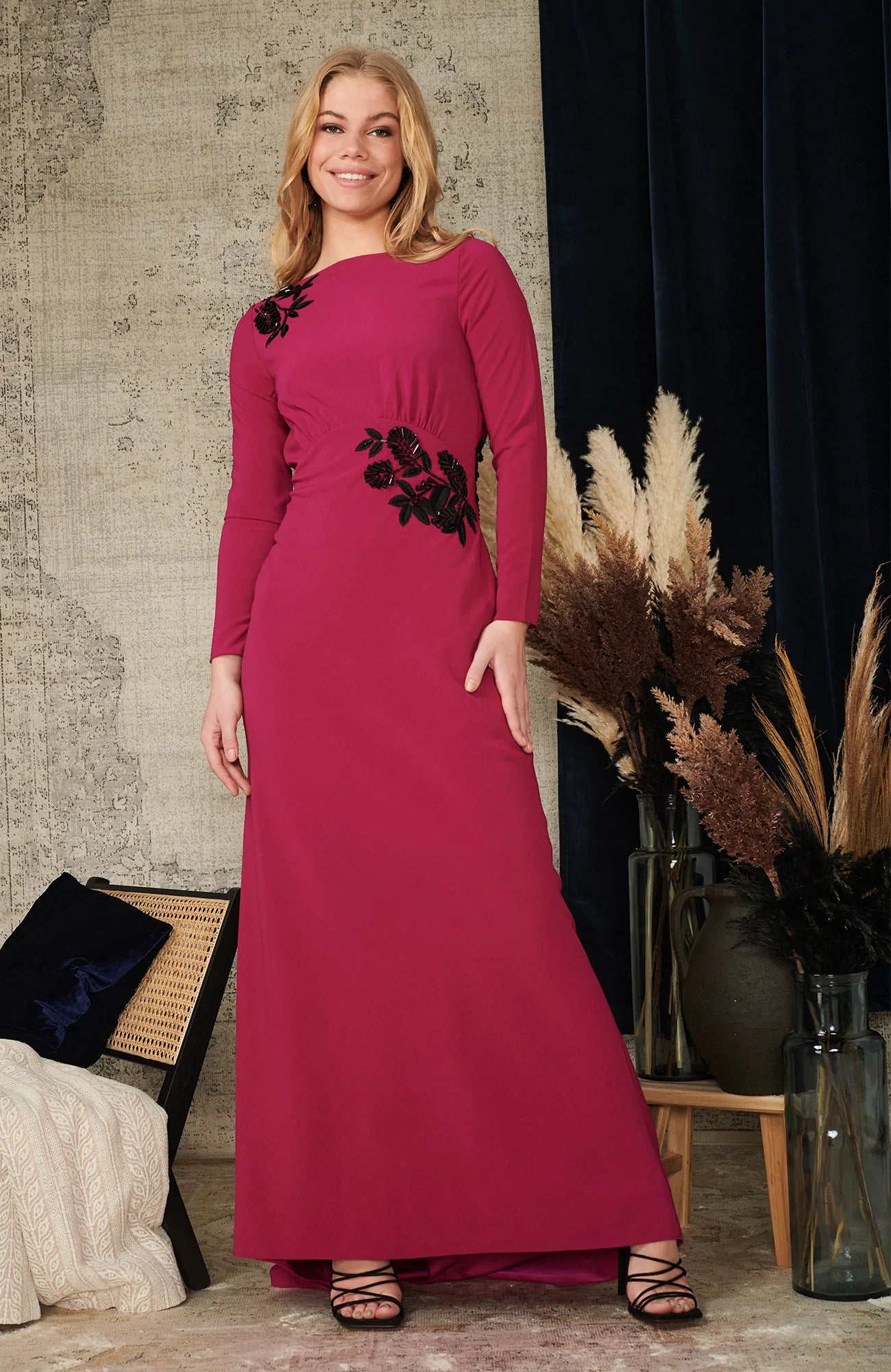 Steal the show is this striking Hope & Ivy design. Featuring an open cowl back with tie detail, the maxi skirt hugs the figure and flows down to the floor to create a stunning silhouette. Black embellished florals stand-out against the deep berry purple base for a final touch of glamour to make you feel event-ready and fabulous.