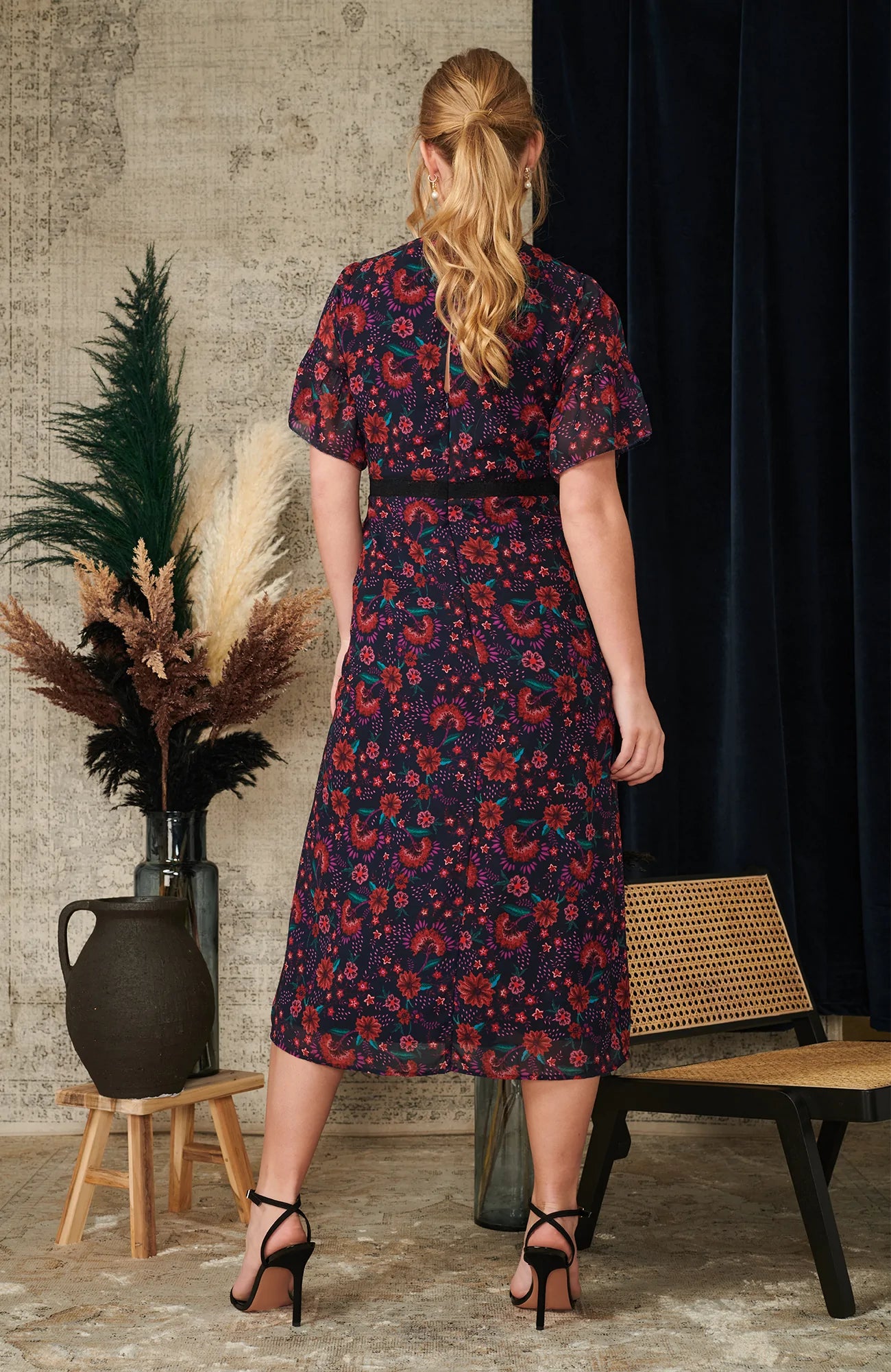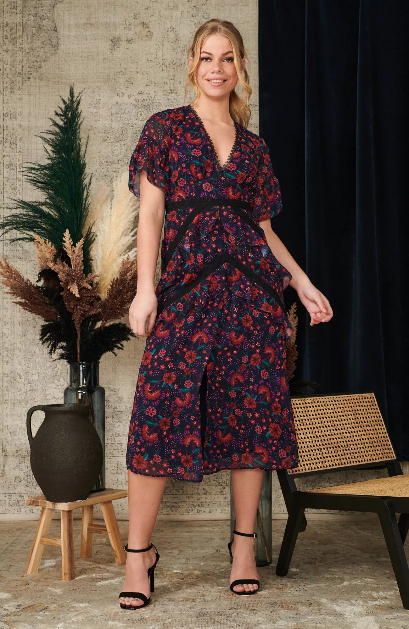 This delightful dress is signature Hope & Ivy design at its very best. A graceful display of hand-designed florals cover the navy base in stunning reds and greens. This button through style features a stylise v-neck and soft flutter sleeves, with contrasting lace trims covering the waist and neckline. Classic design and prints, what more do you need from a Hope & Ivy style?