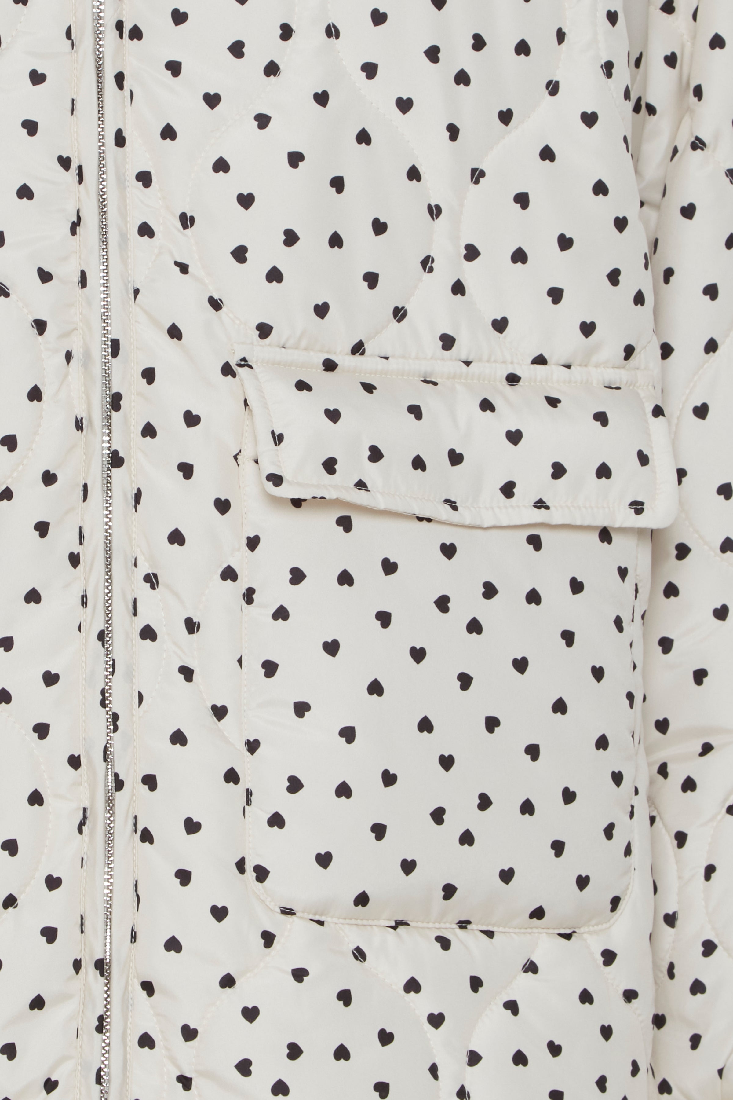 The FAZONA Jacket features a collarless design with a zip fastening and front lapelled pockets. Its longer back and lightly padded construction offers style and warmth while its water repellent finish offers protection from spring showers. With an all-over black heart motif and contrast cuffs, this jacket is cute casual.