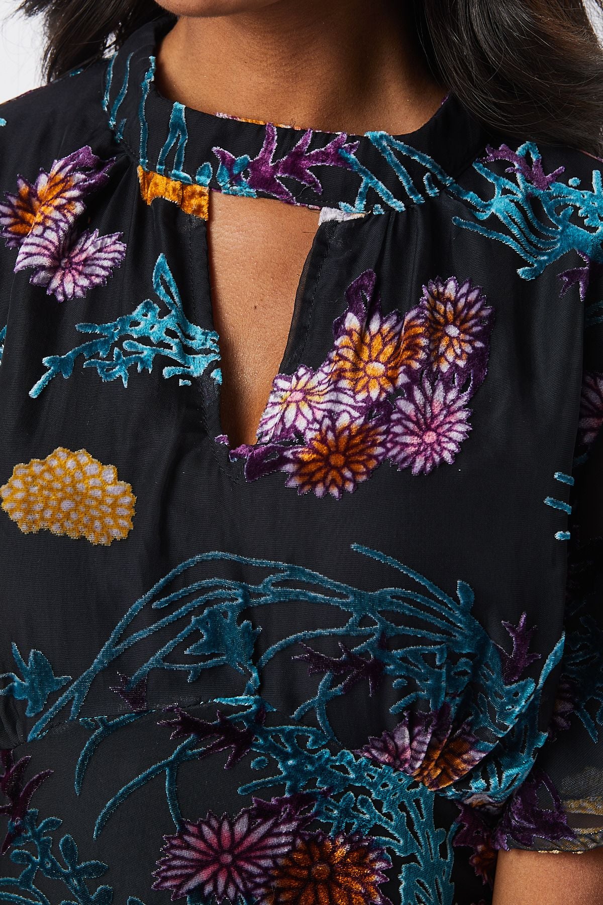 Look your best in The FILY Velvet Short Dress. It features flutter short sleeves, high neck with peep hole detail and a velvet floral pattern on chiffon overlay offering a luxurious look and feel. The dress also features a concealed back zip fastening and is fully lined. Get ready to party in this chic, knee length dress.