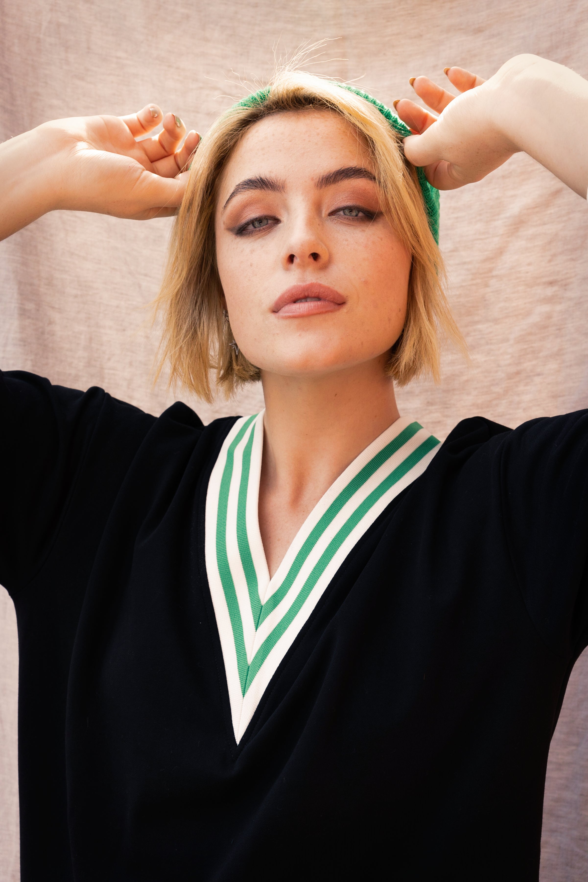 - Maeve wears size S/M for a fitted look or M/L for an oversized look.
