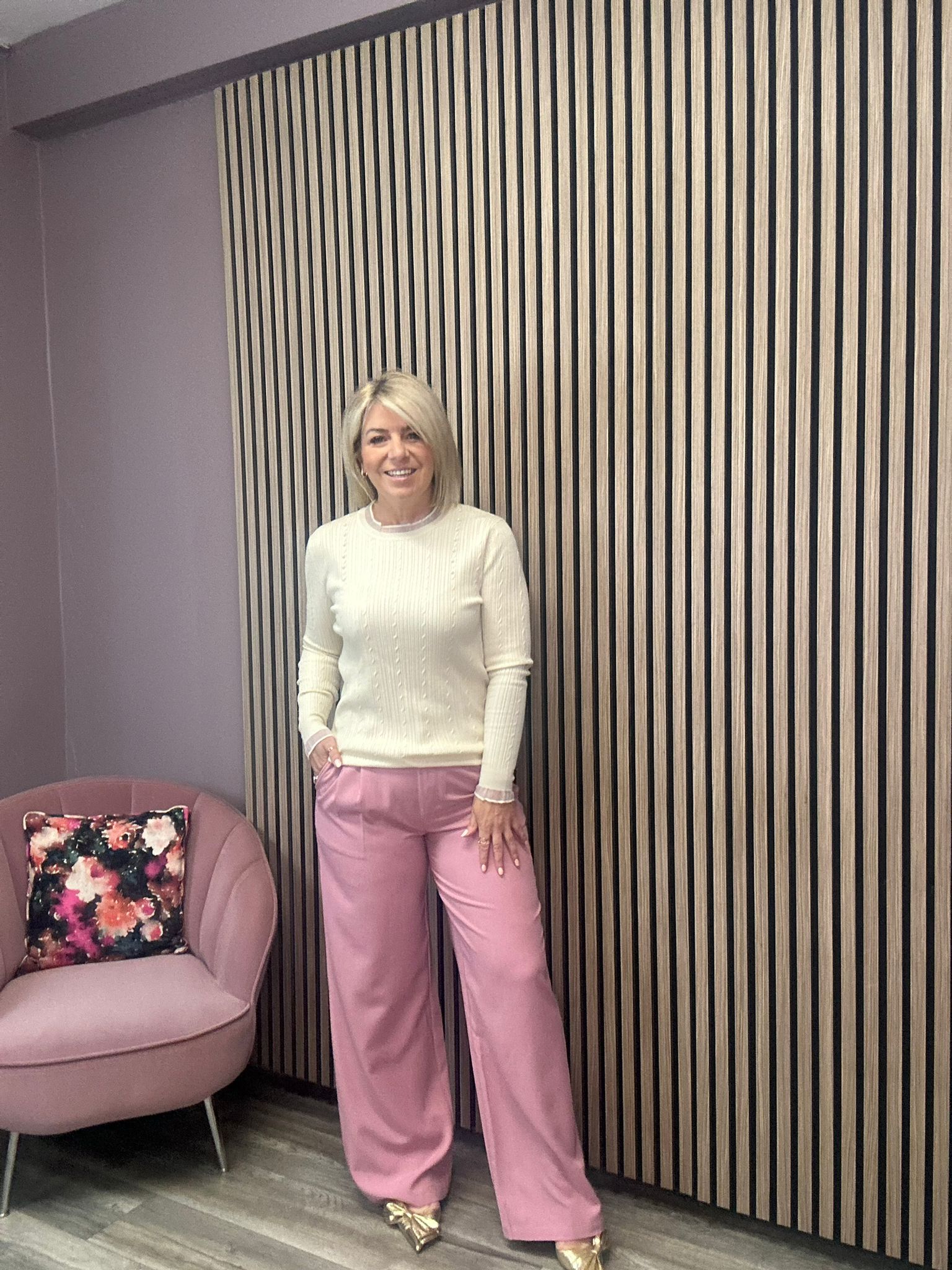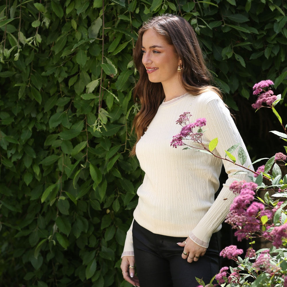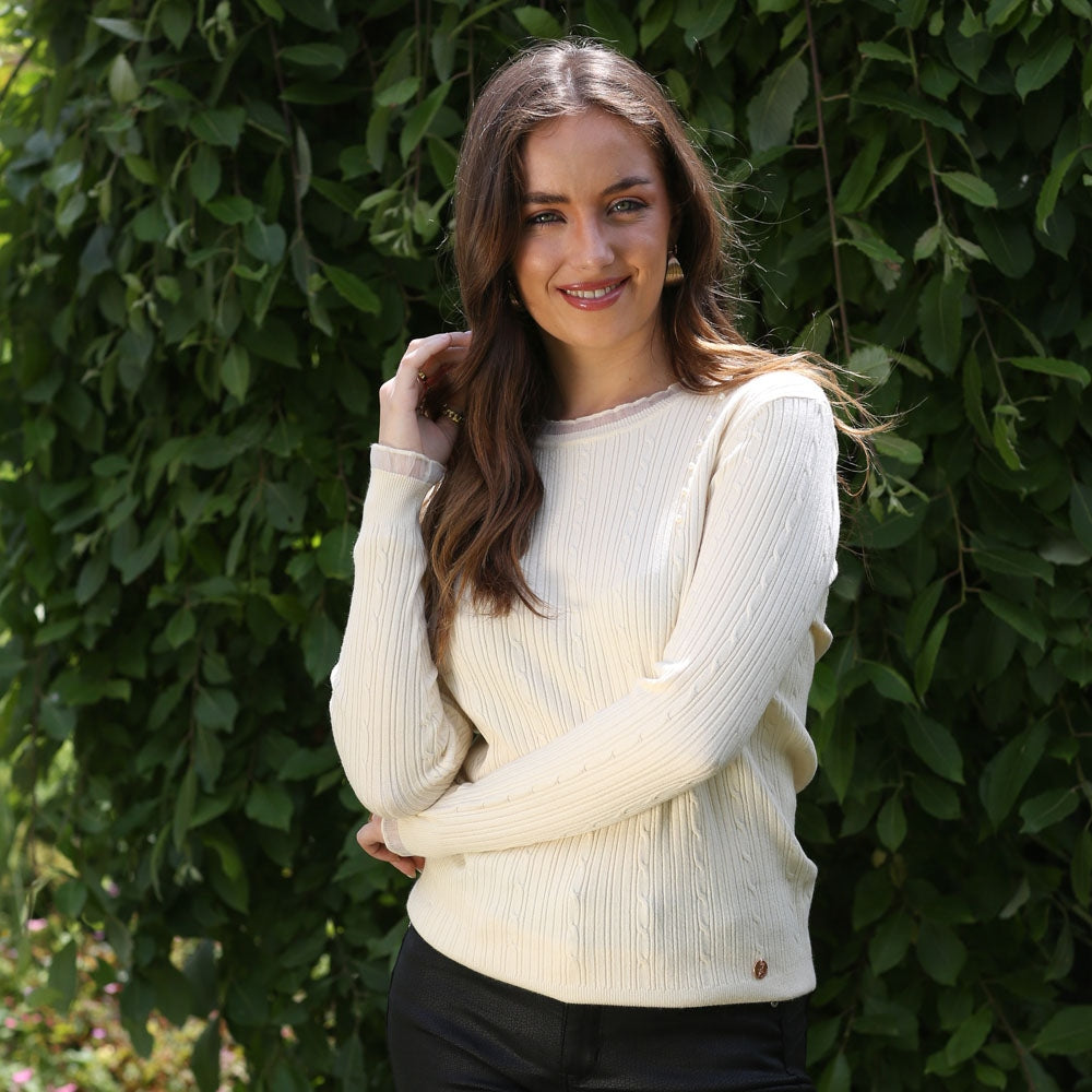 An elevated take on a wardrobe staple, the Holly Jumper is designed with a mesh crew neckline and long sleeves with mesh detail on the cuffs, knitted in a fine chic cable stitch with tonal pearl detail to the front. It’s the perfect layering piece to add some texture to your outfit.