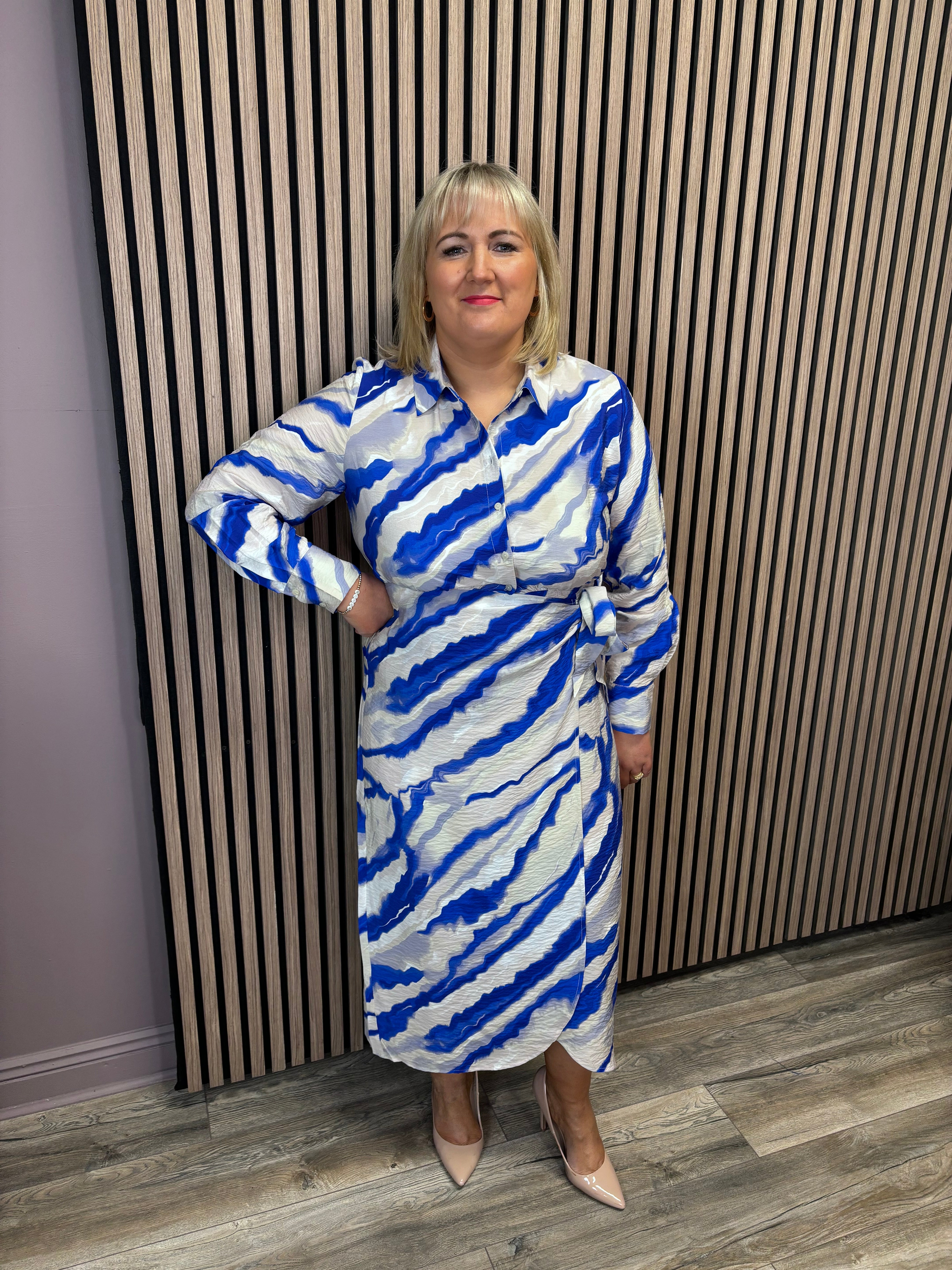 The IDOM dress boasts a stylish shirt collar and a button closure that extends to the waist, with a wrap style skirt for a modern touch. Finished with a 2 button cuff closure, this dress offers a sophisticated and effortless look for any occasion.