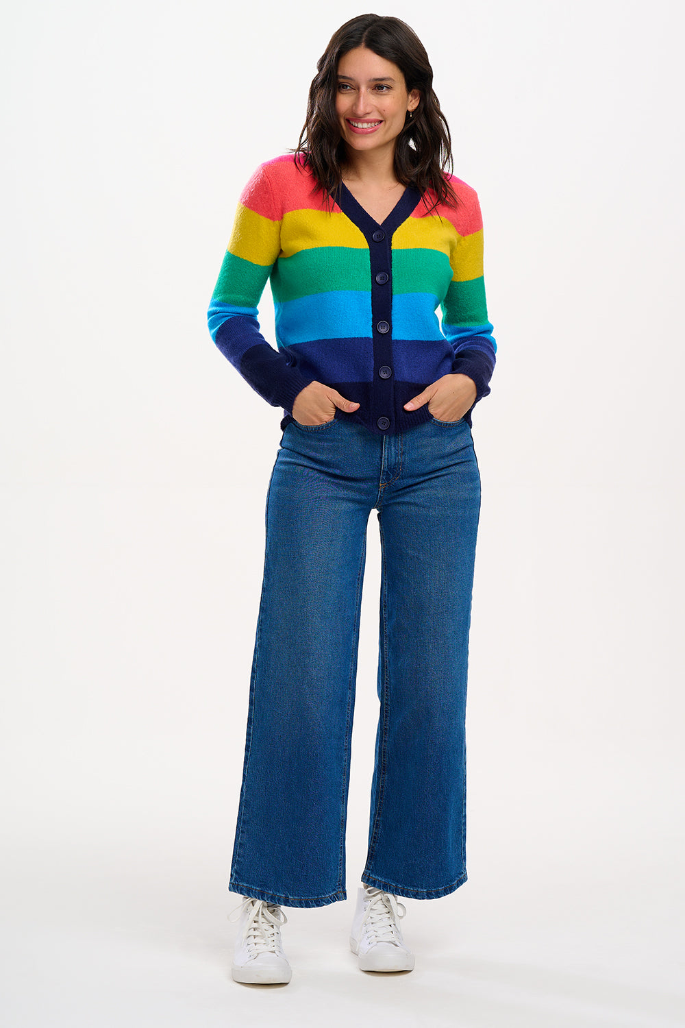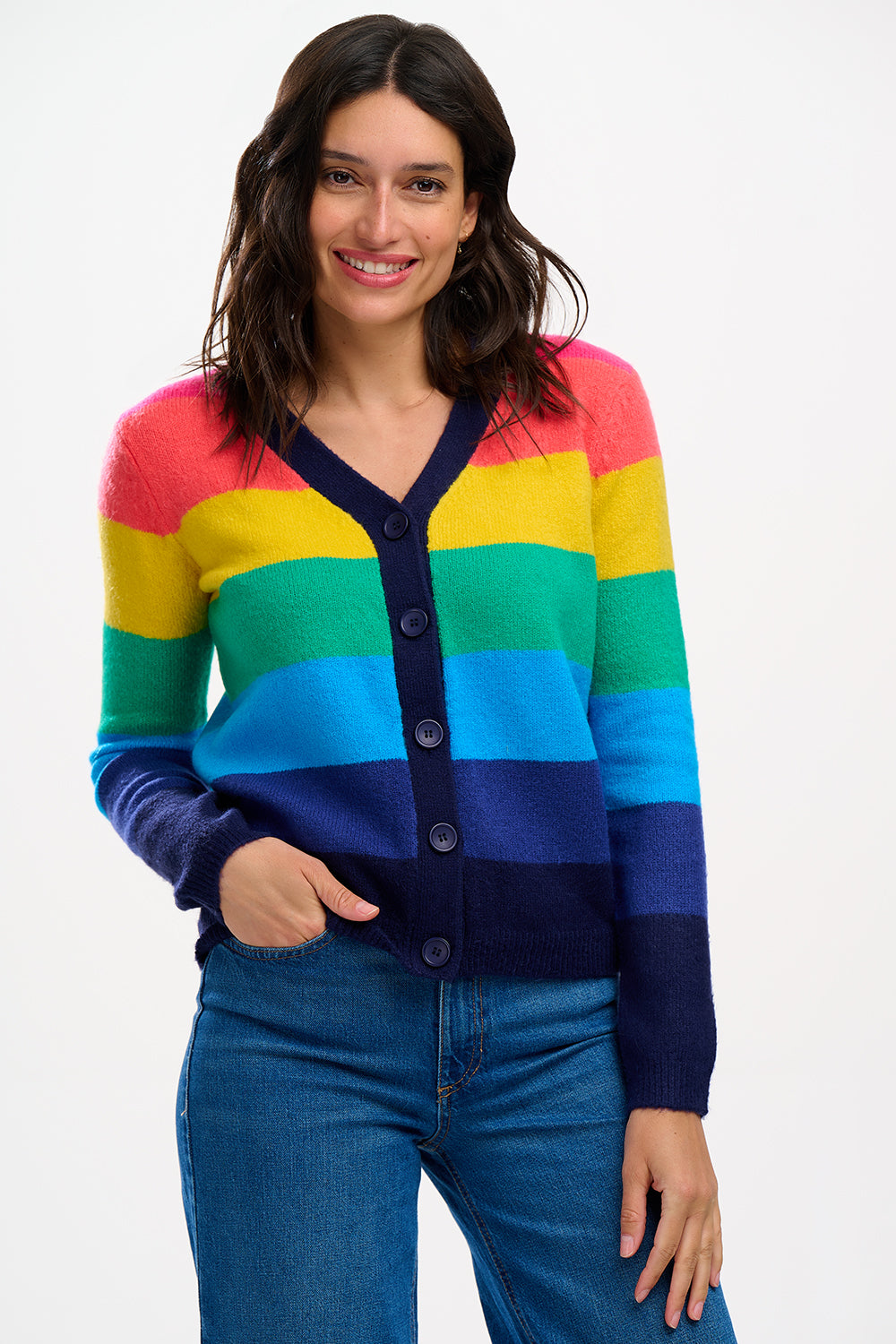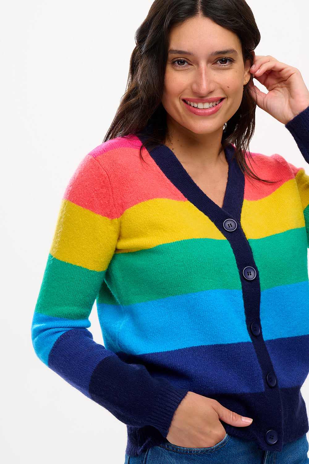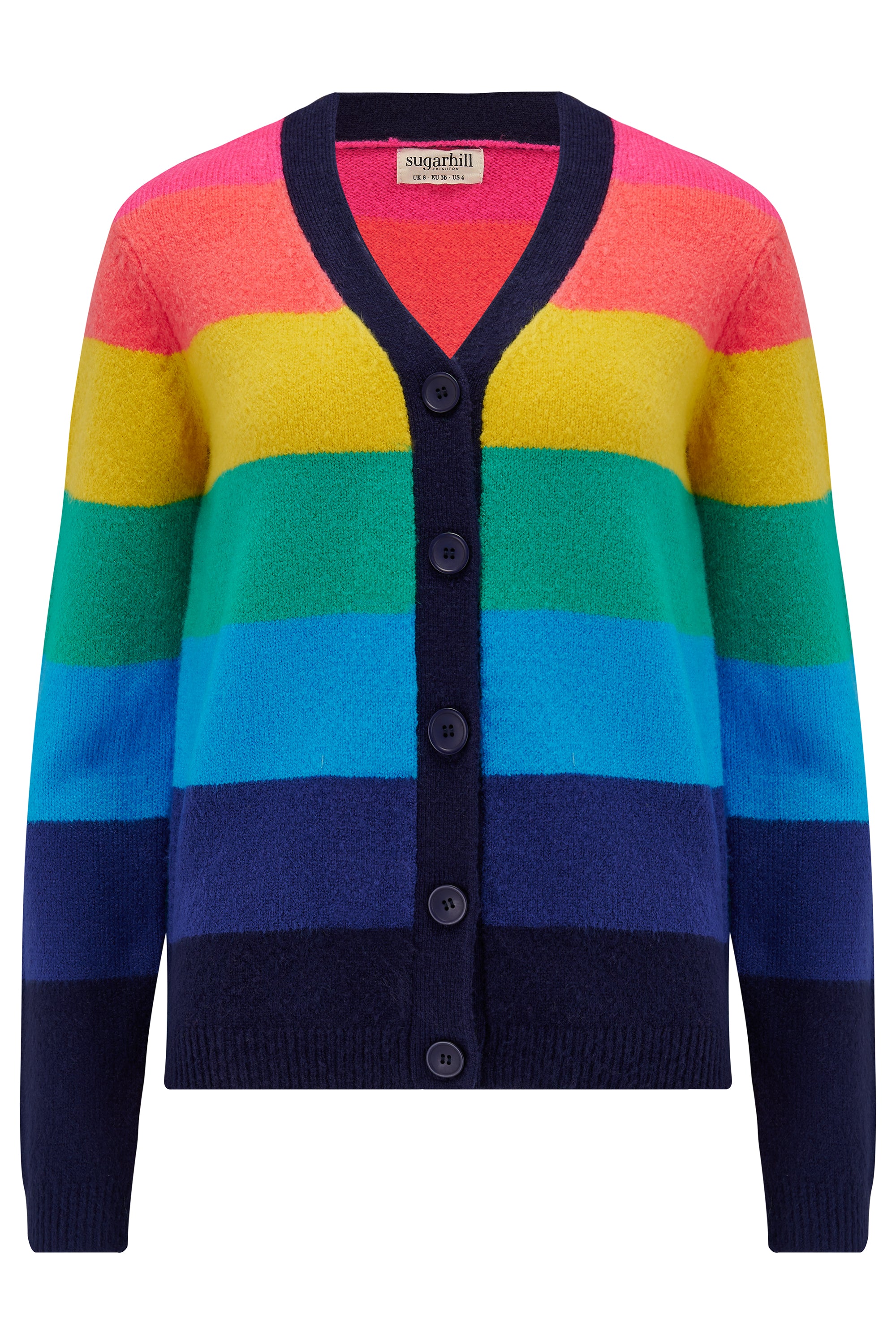 Introducing the Izzy Cardigan, a cosy style featuring a boxy shape, deep v neckline, ribbed cuffs and a functional button front. Inspired by rainbows, the Izzy is made with the softest thick yarn in wide stripes of bright pink, orange, yellow, green, blue and navy.