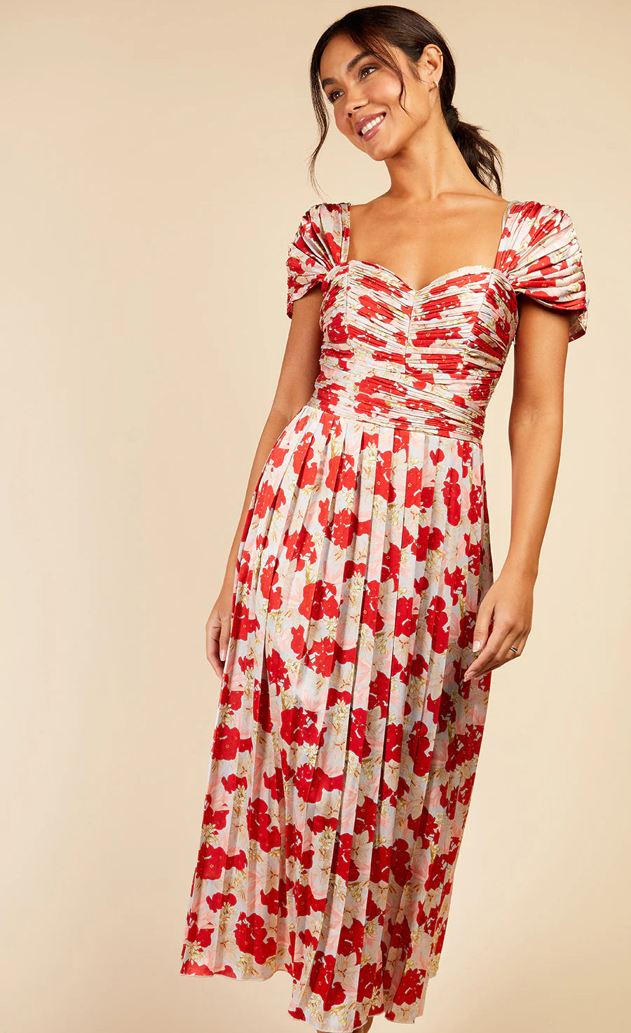 Jackson Pleated Midaxi Dress (Red Floral Print)