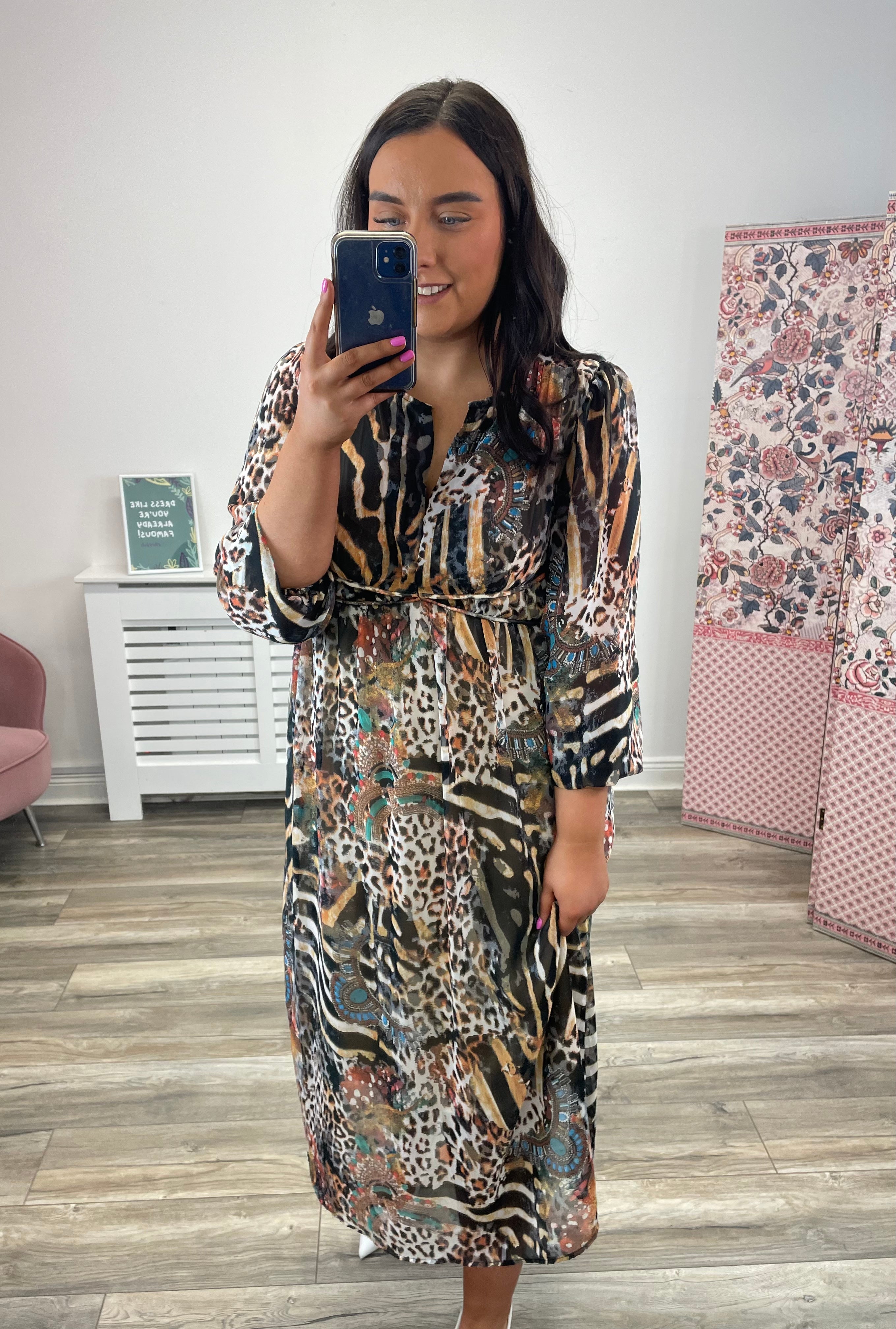 This fab leopard midi dress with long sleeves with smocked cuff, elasticated waist is fab for any occasion! Wear with trainers, chunky sandals, or with boots.