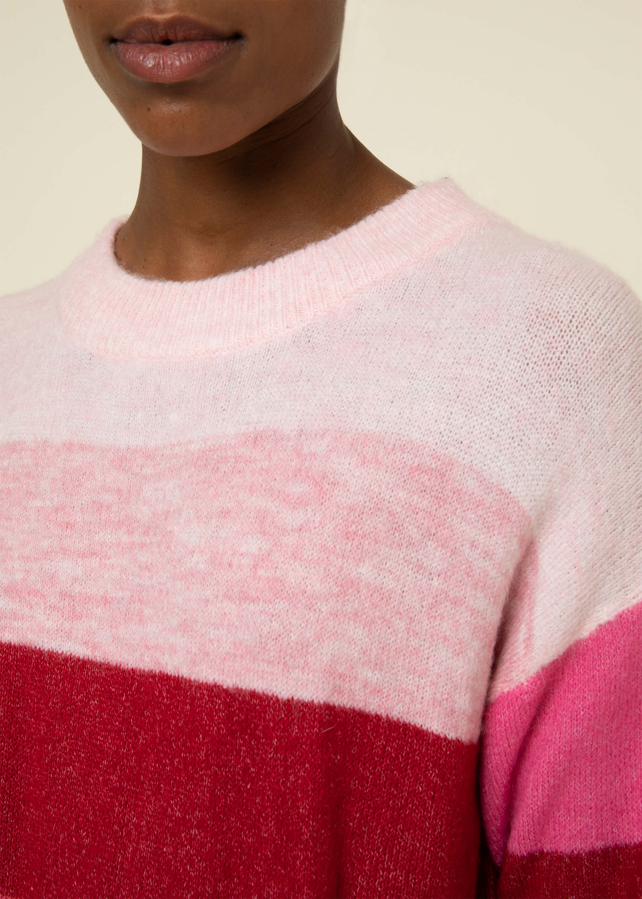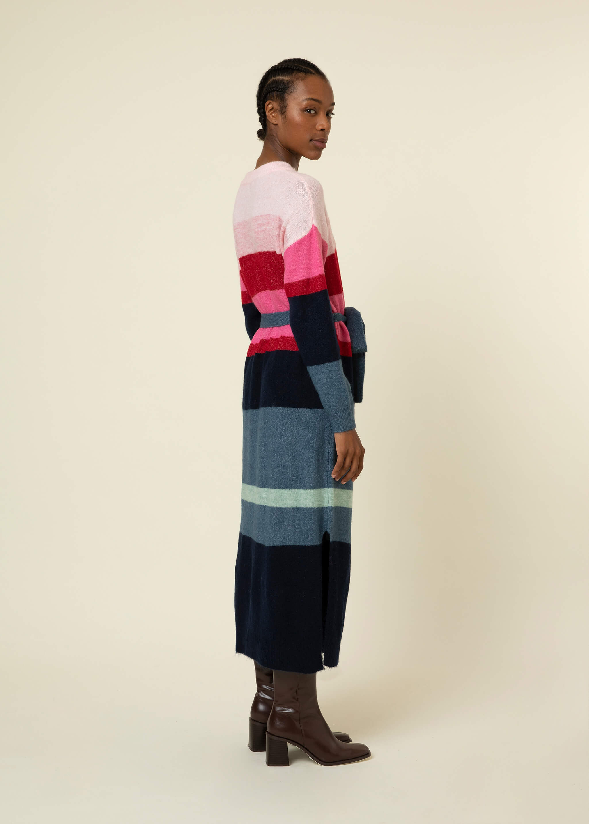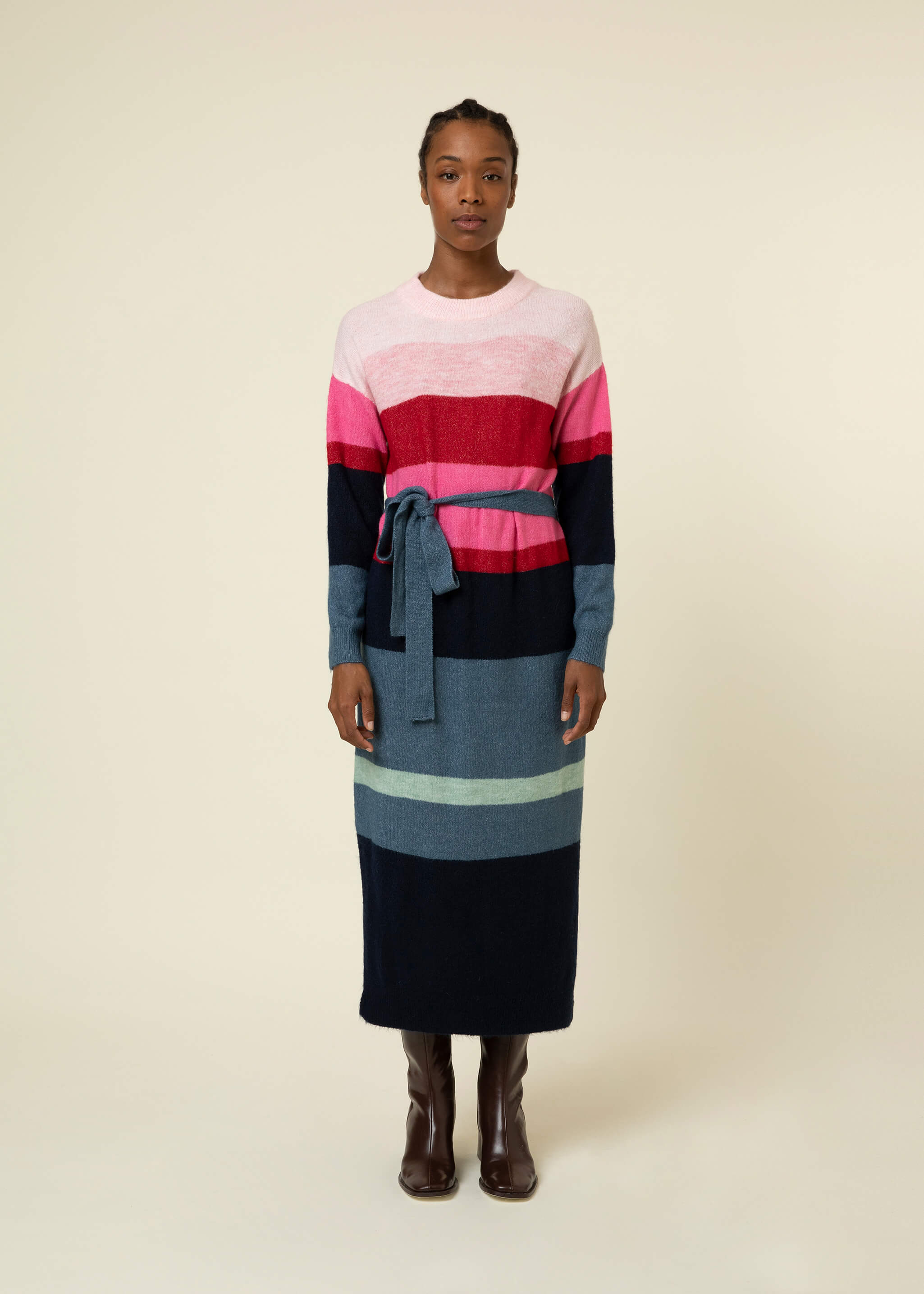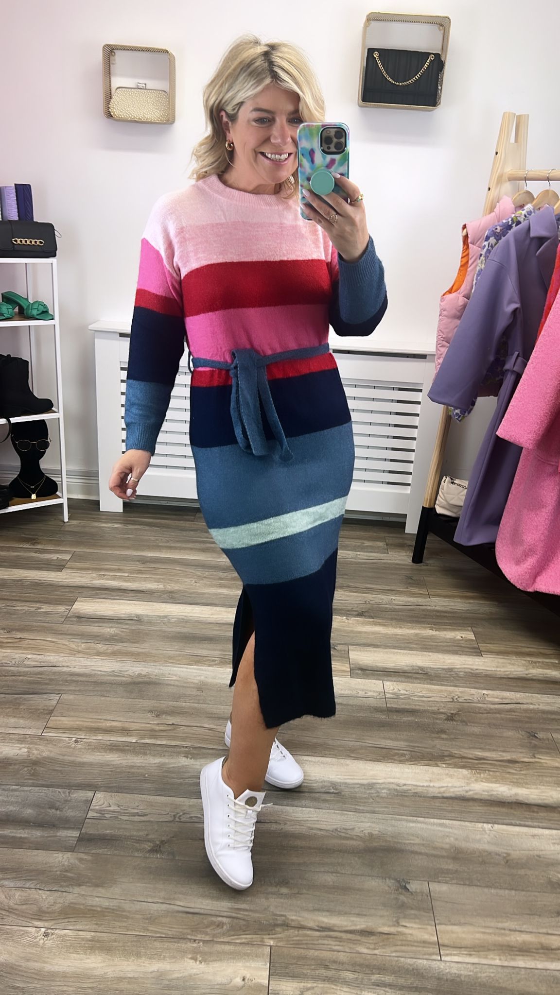 How fab is this multi colored knit dress by FRNCH. Featuring crew neckline and long sleeves. Pull on styling with a knit belt to cinch the waist.