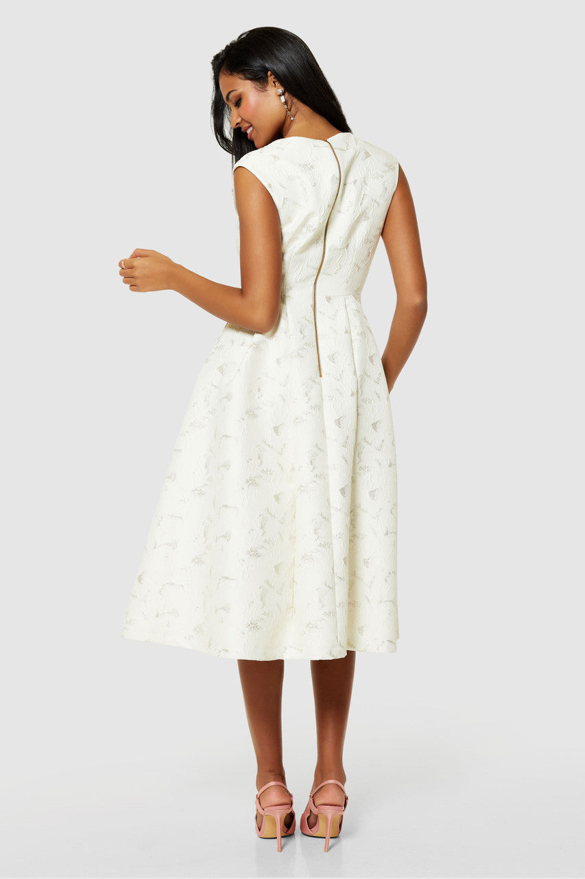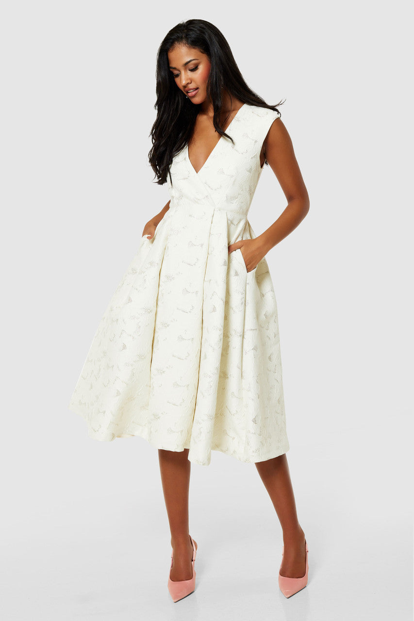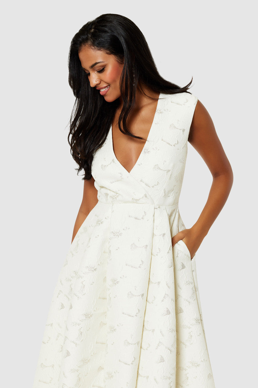 We are seeing increasing interest in white dresses and this one is extra special. It is made in a textured Jacquard that is woven with silver threads. It has a flattering wrap front, full pleated skirt, pockets and is half lined in satin.