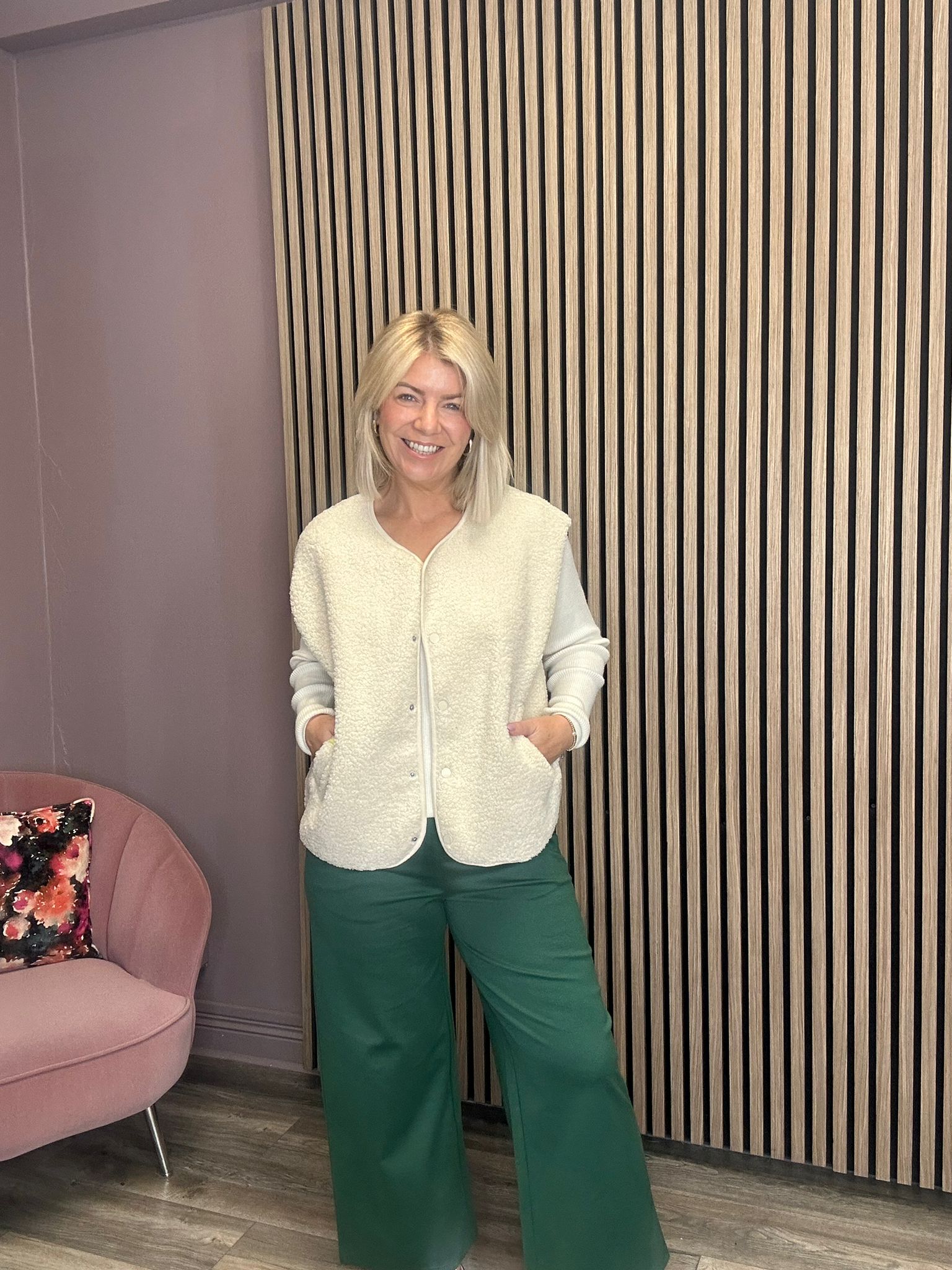 Cosy up in the Katty snuggly teddy gilet with stretchy fabric that moves with you. Handy side pockets and push fasteners make it easy to wear. Finished with contrast trims and a cute rounded hem for extra charm.