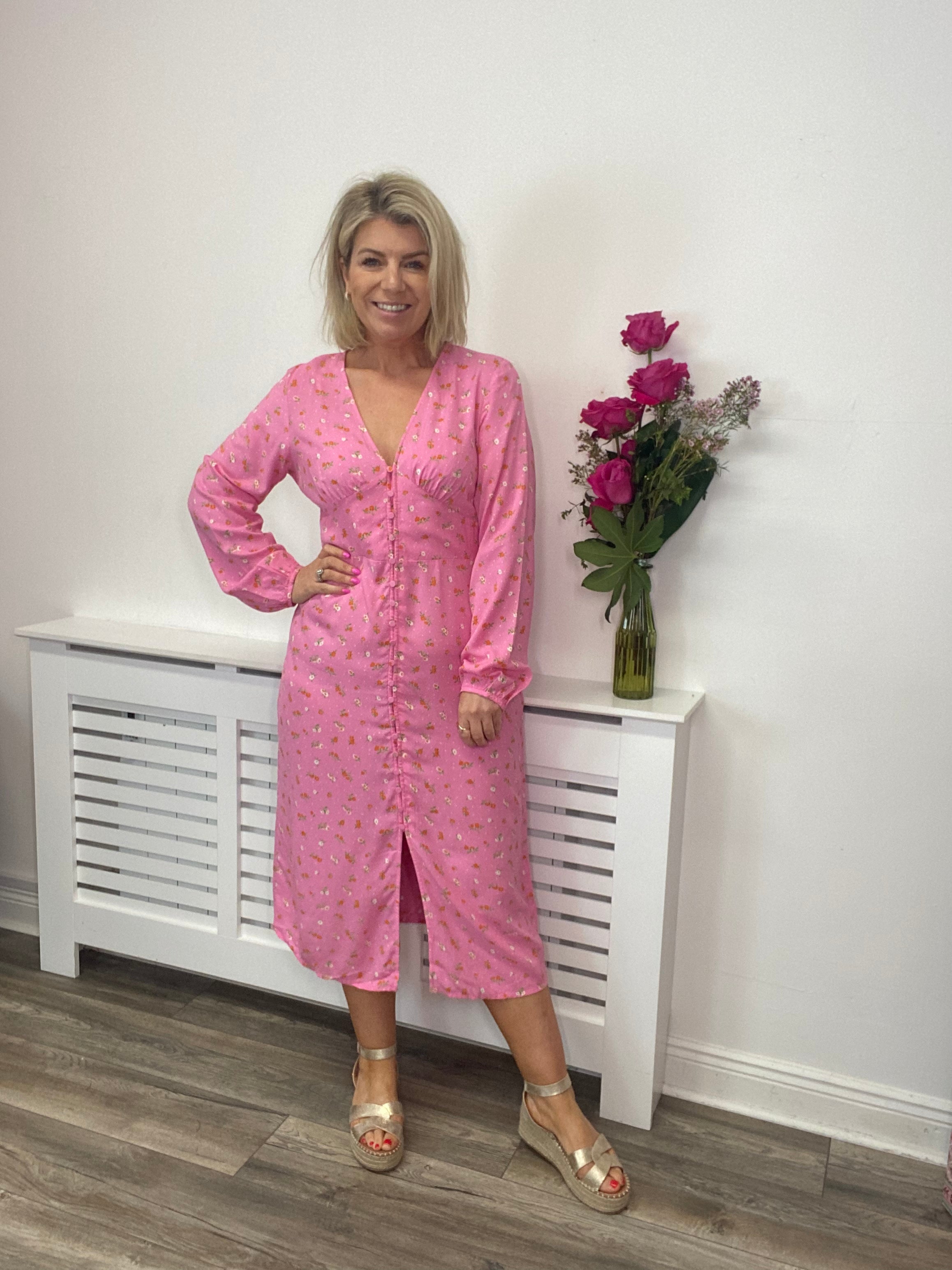 This cute midi is fab from Pieces! Featuring full length sleeve, v-neckline and button front closure.