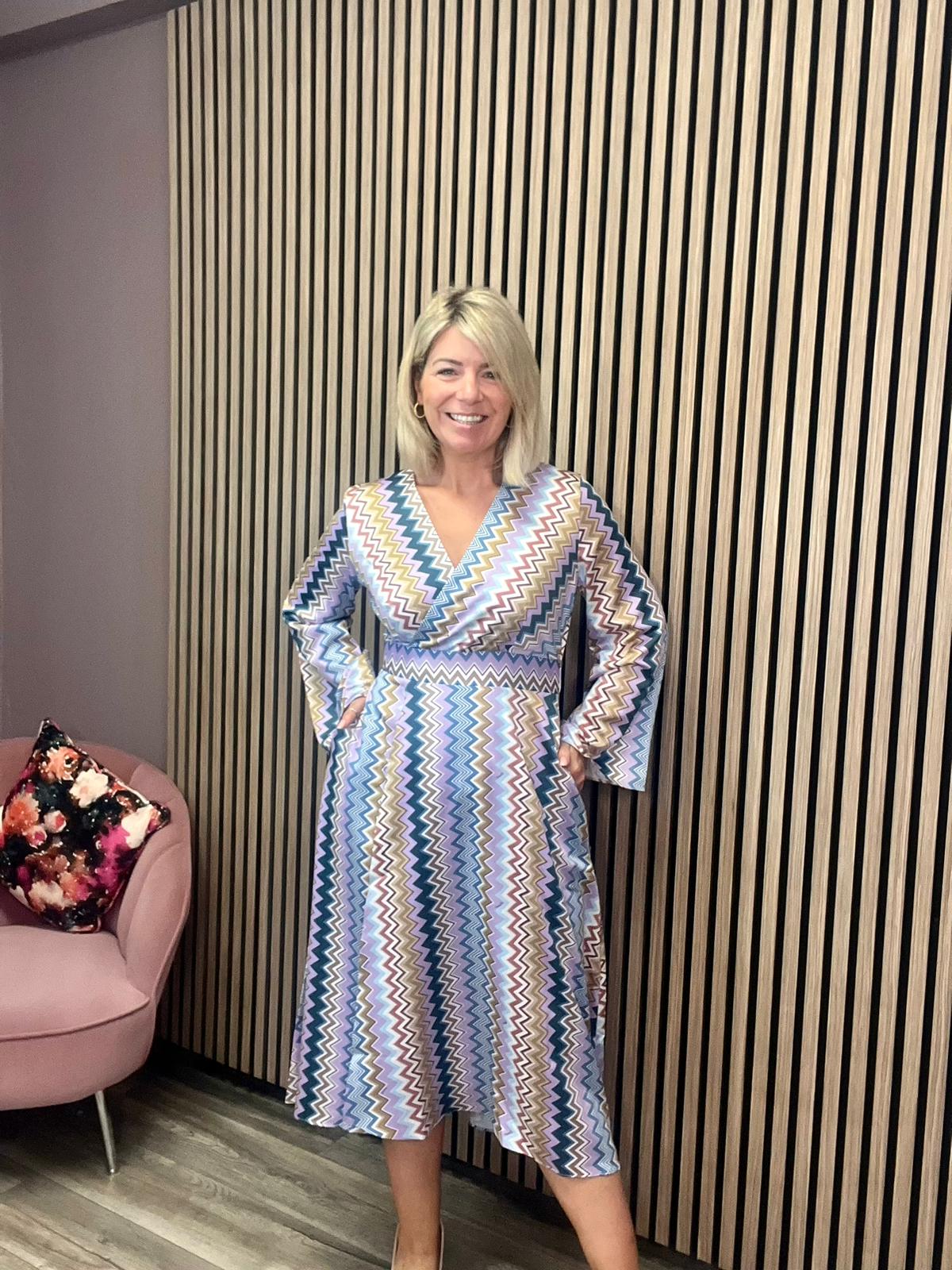 The KIELY Kimono Wrap Dress features a faux wrap design and waist tie to flatter your figure, while the soft satin-like material provides a luxurious feel. With a v neck, long sleeves and midi length, this dress is perfect occasion wear. The zigzag print adds a unique touch while the side pockets and back zipper enhance the wearability of the dress. (Pattern placement may vary slightly.)