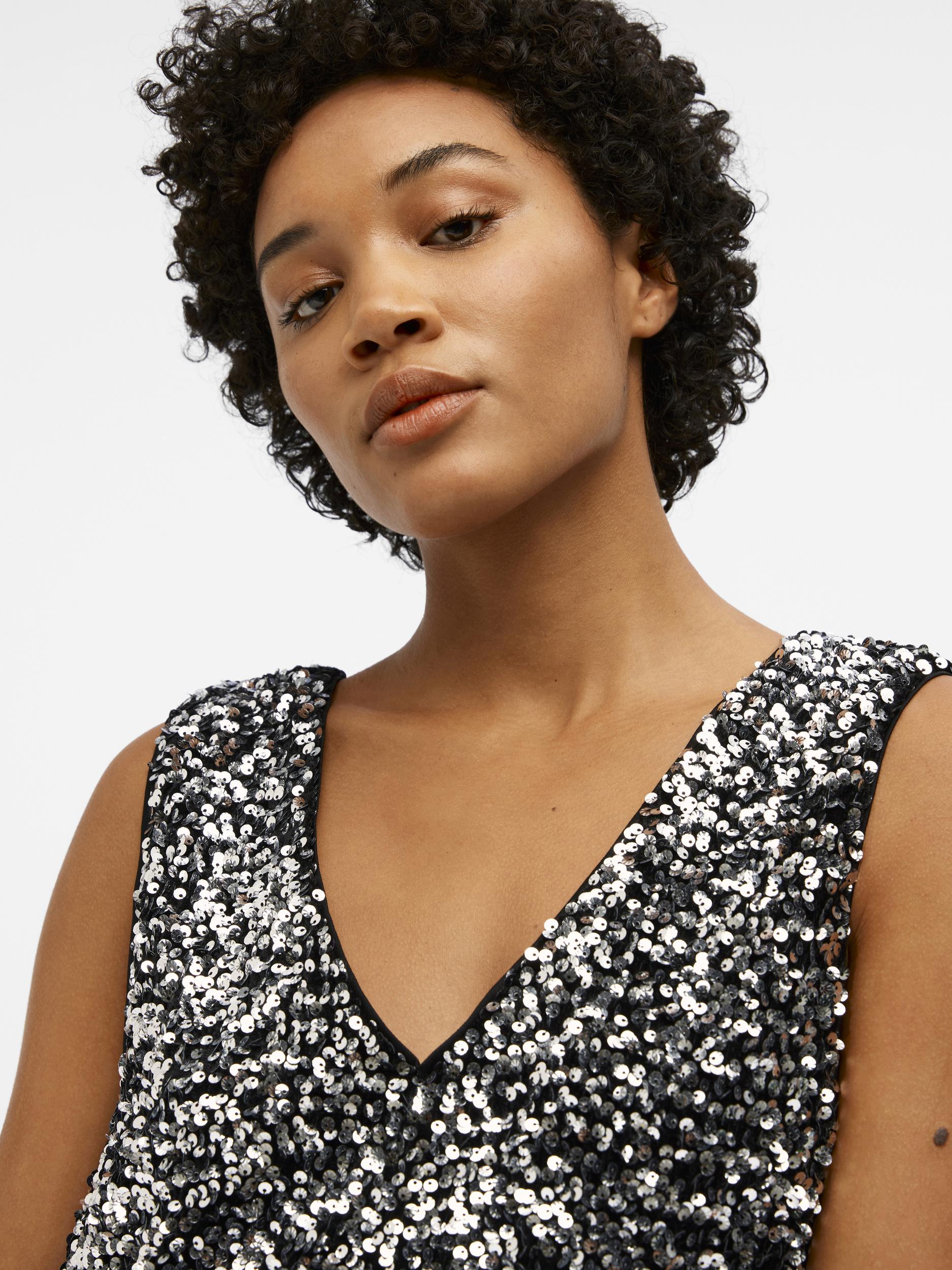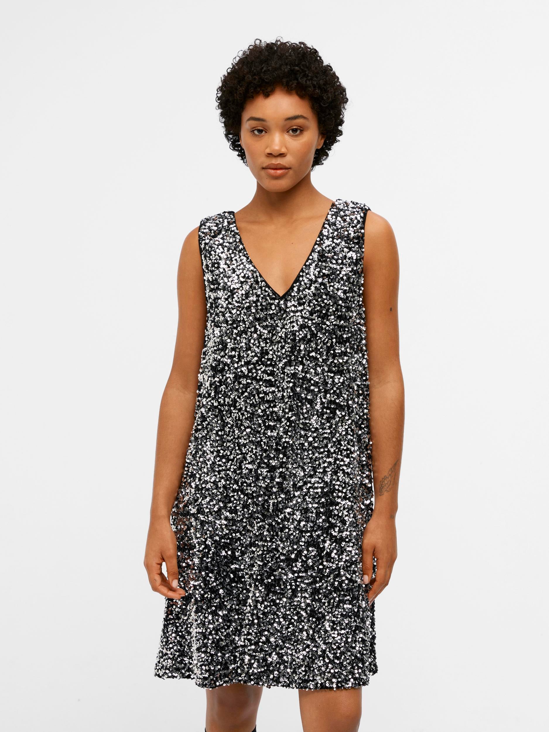 The KINNE Sequin Dress is a flattering mini featuring a v-neckline at the front and back and is adorned with shimmering silver sequins on a classic black fabric. Fully lined and cut in a classic A-line shape, the perfect party season dress.