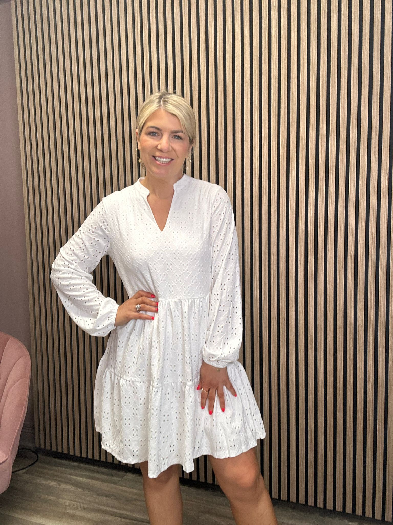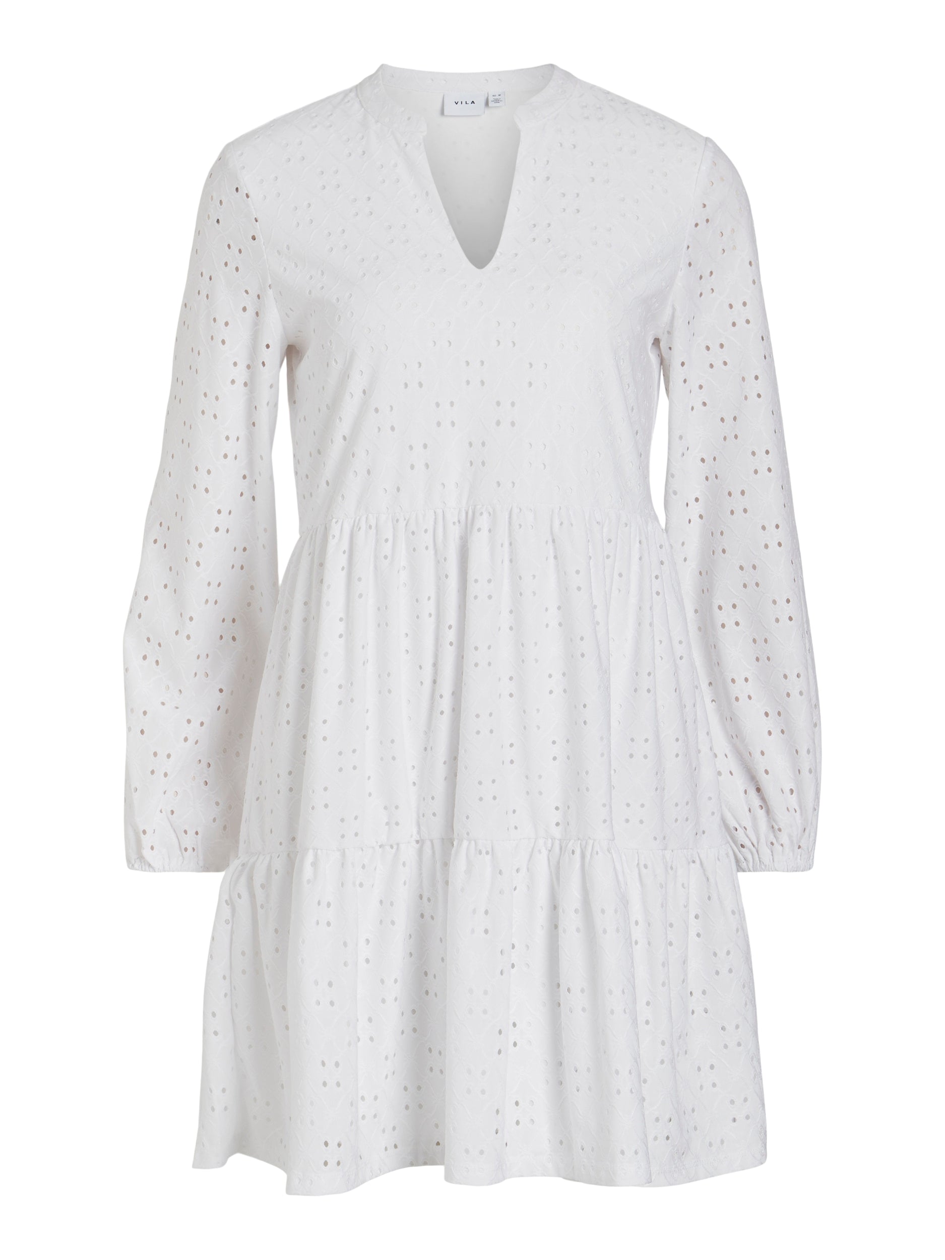 This KIRA dress boasts a stylish v-neck and smock style, with elasticated cuffs for ultimate comfort. Made from soft material and featuring intricate broderie anglaise detailing, it offers a chic and comfortable option for any occasion.