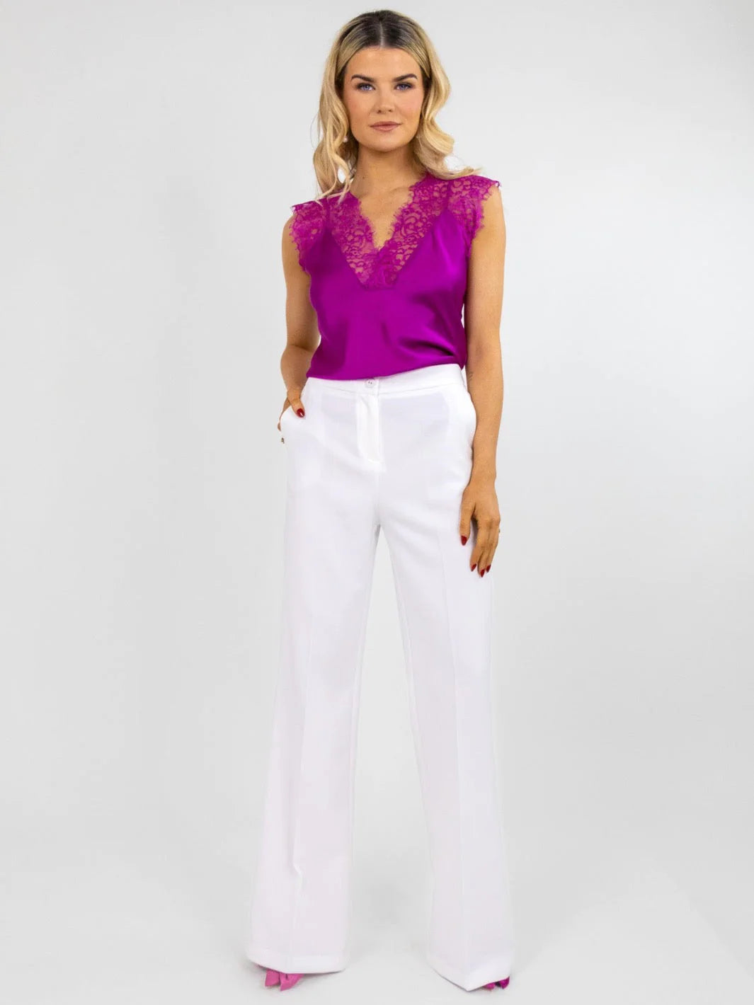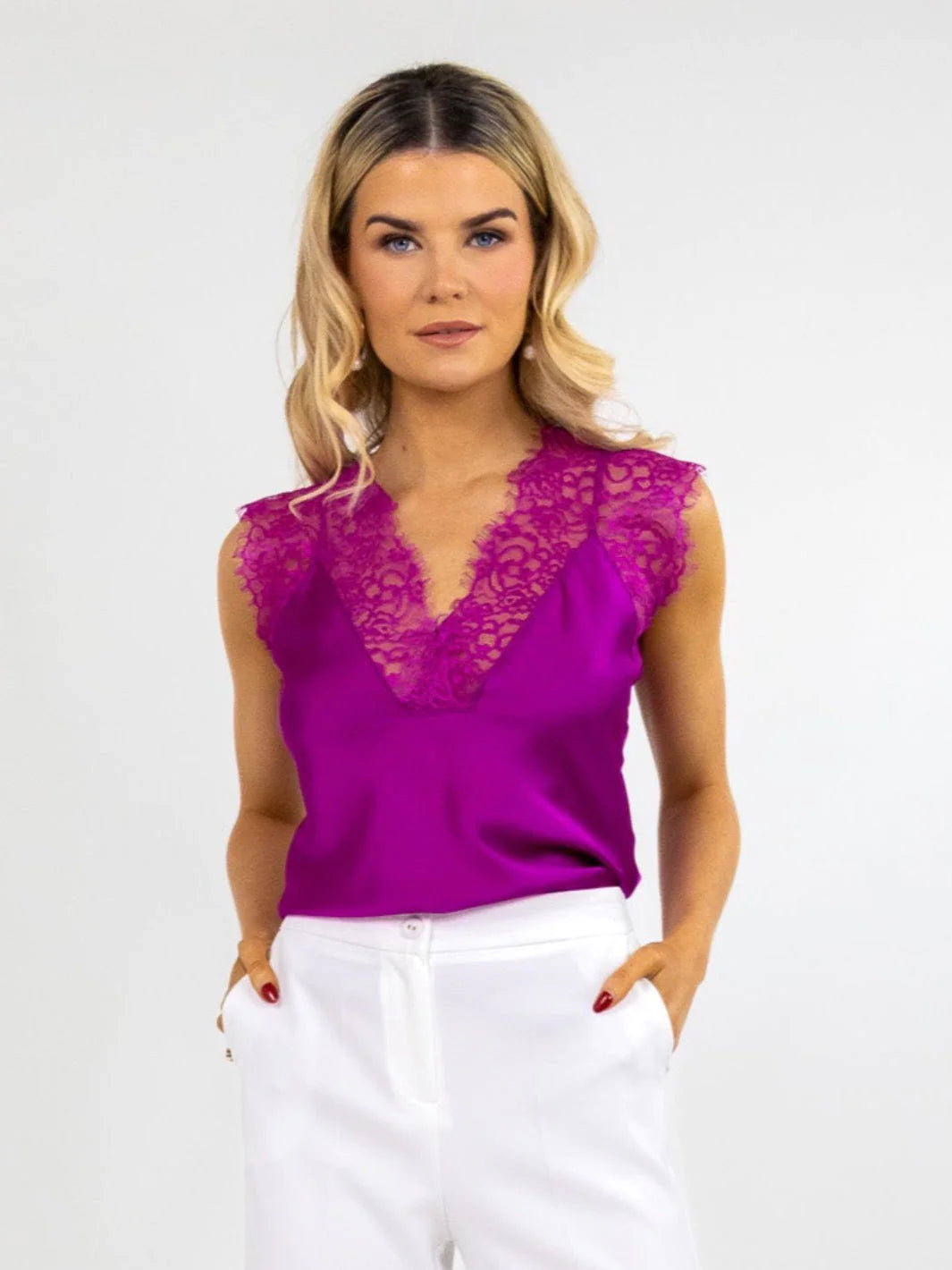Add a touch of sophistication to any look with this elegant LAUREN lace cami top. With a luxurious silk/satin feel, the top features a v neckline with intricate lace detail on the neckline and shoulders. Perfect for weekend outings or evening events.