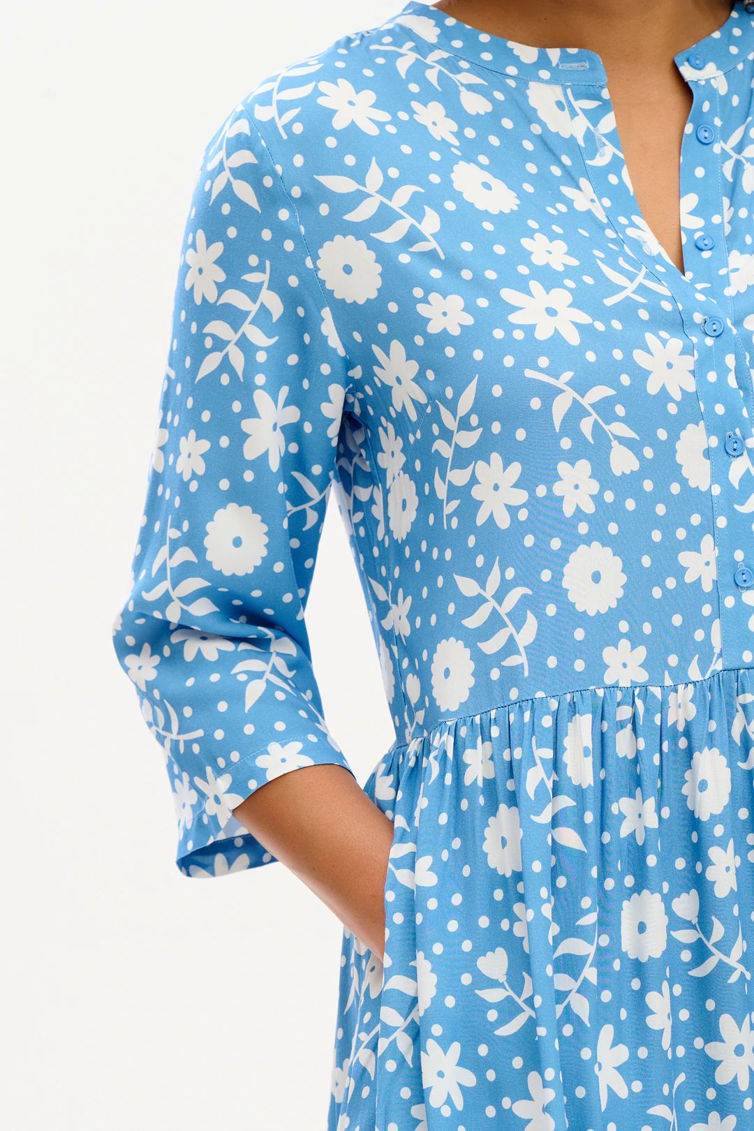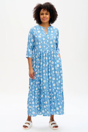 Sugarhill's Lauren dress is the perfect easy-breezy day dress. Cut with a loose fit, it has a shirt upper, half-length sleeves and an on-trend tiered skirt. The Vintage Block Floral print features naive foliage in off-white on a pale blue base.