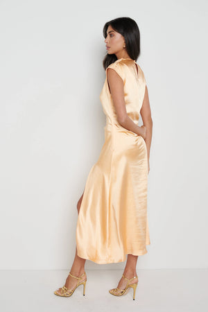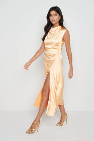 Crafted from a luxurious satin in our dreamy, exclusive orange pantone the Lilth dress is bound to turn heads. It has been intricately designed with a draped cowl neck and side split which oozes femininity and class. Elegant pleating at the side seam cascades across the waist to compliment all figures.