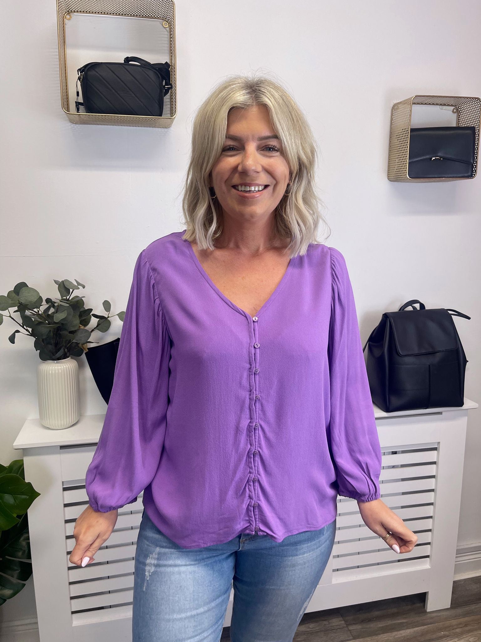 This gorgeous long sleeved shirt, with button closure at front, elasticated sleeves and V-neckline is a timeless piece that every wardrobe needs!