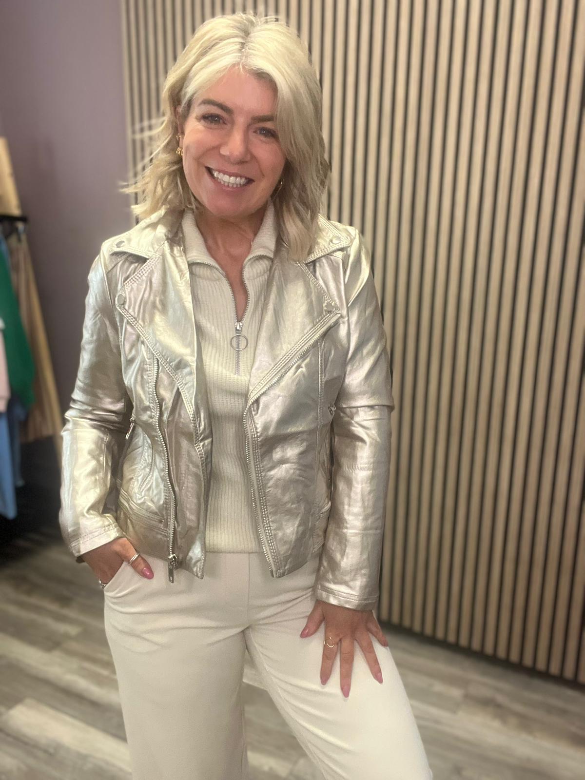Introducing the Marlie Biker Jacket in a luxurious gold hue. Made with a sleek metallic finish, it features a convenient zip fastening and two side zipped pockets. Stay stylish and functional with this must-have piece.